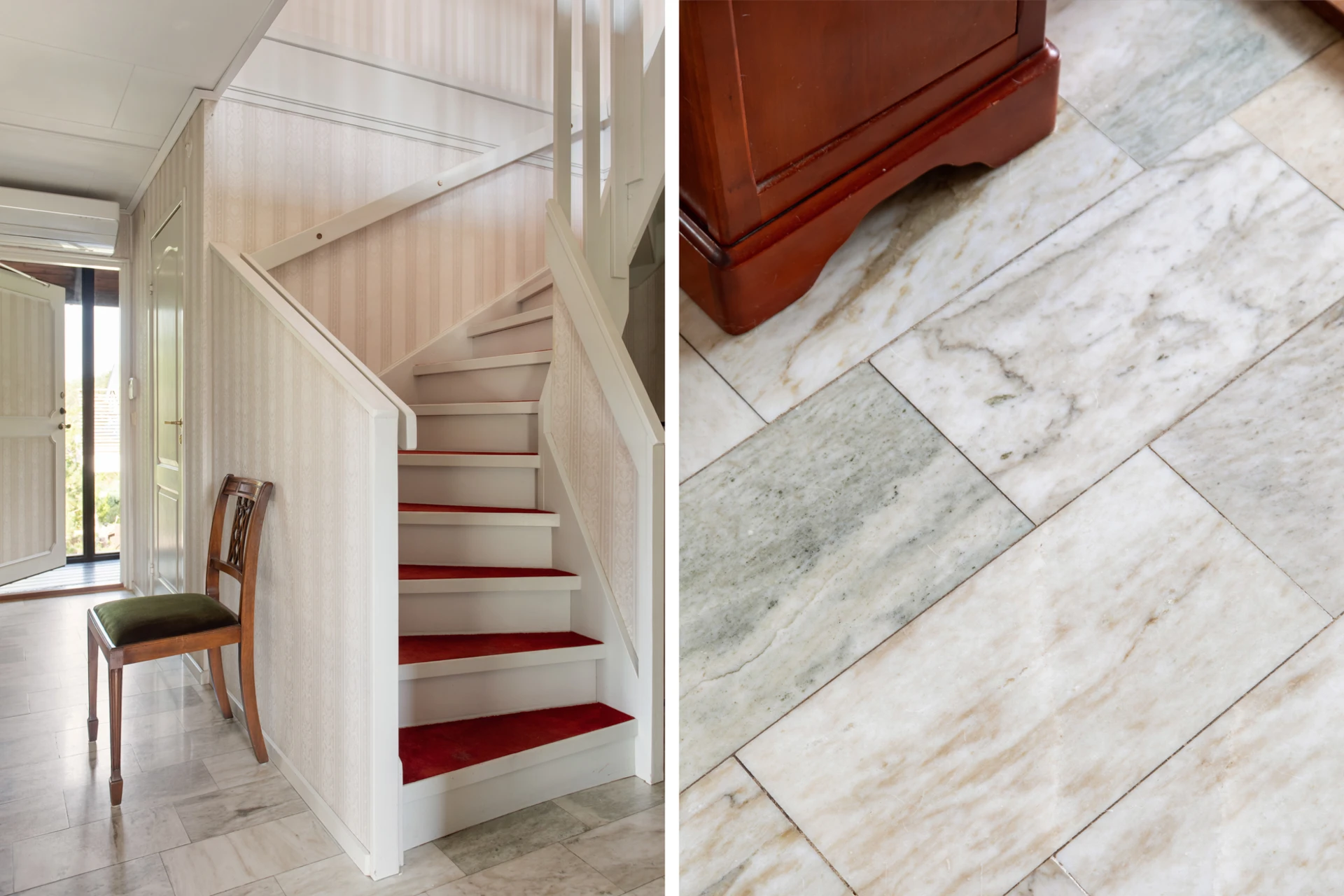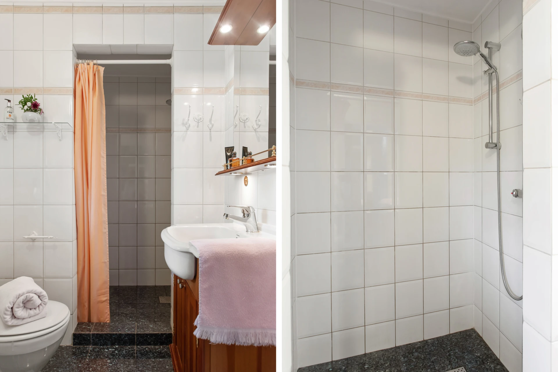 Golv i Carrara marmor och kaklade ljusa väggar. Handfat med kommod, spegel med belysning och wc samt dusch.