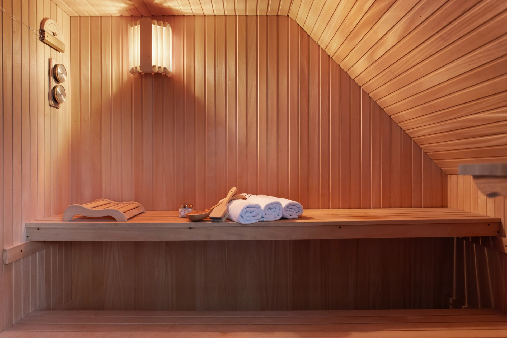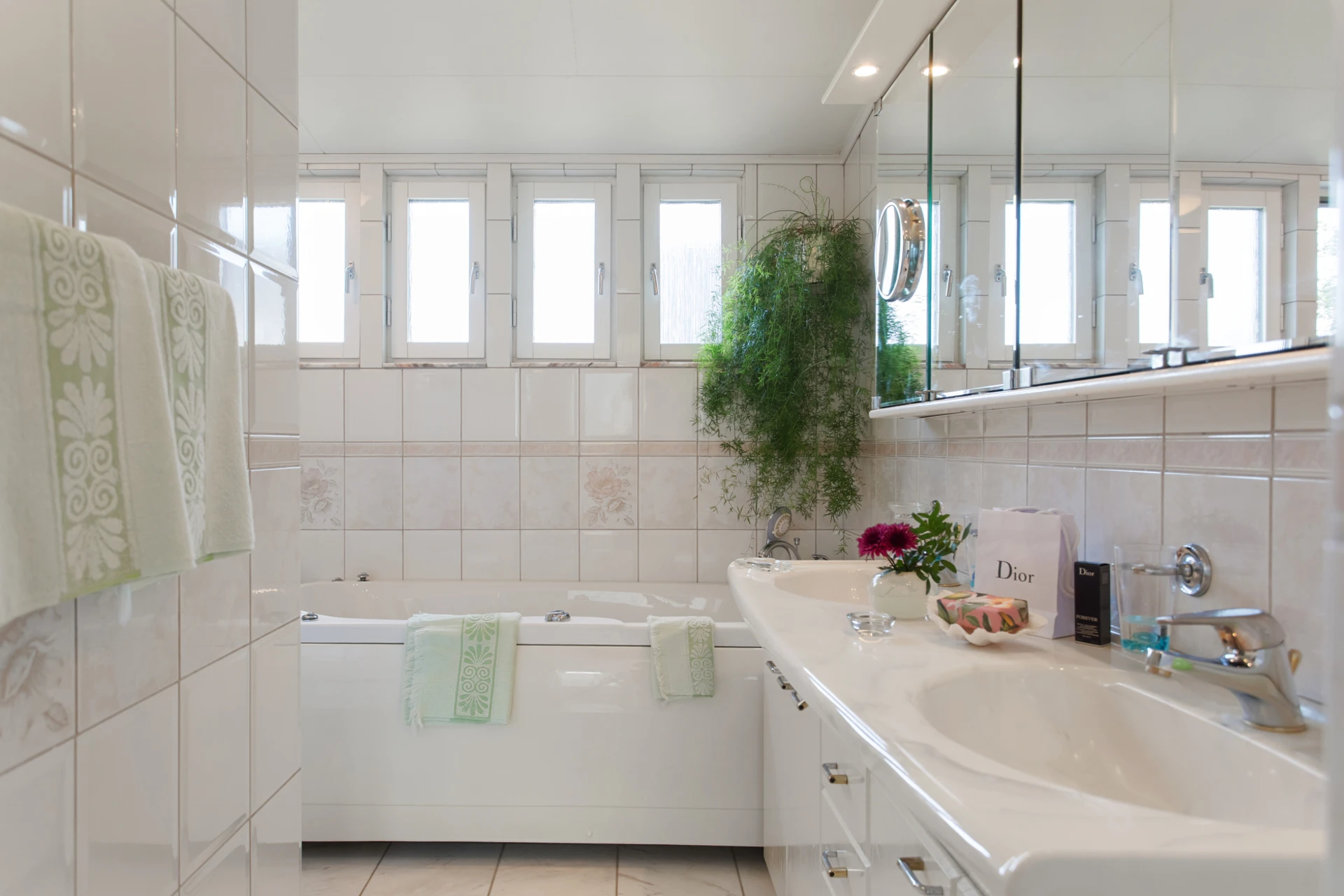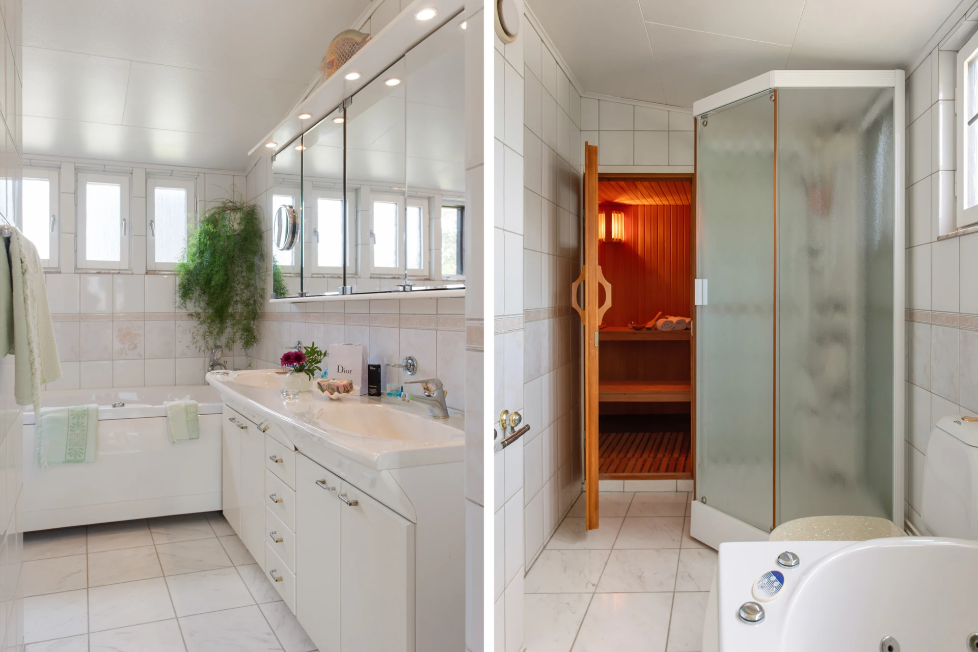 Ljust golv och kaklade ljusa väggar. Dubbelhandfat med kommod och spegelskåp. Badkar med jacuzzi, wc och duschkabin samt bastu. Flera fönster.