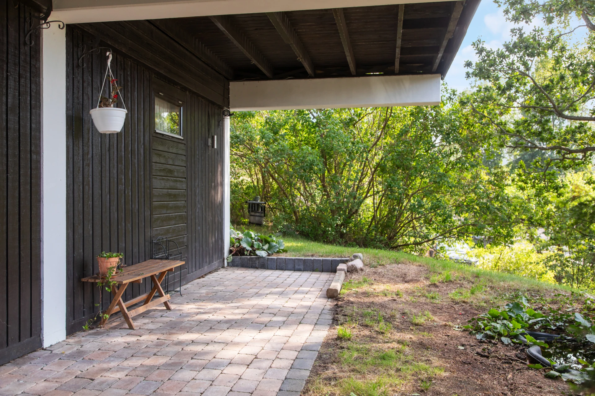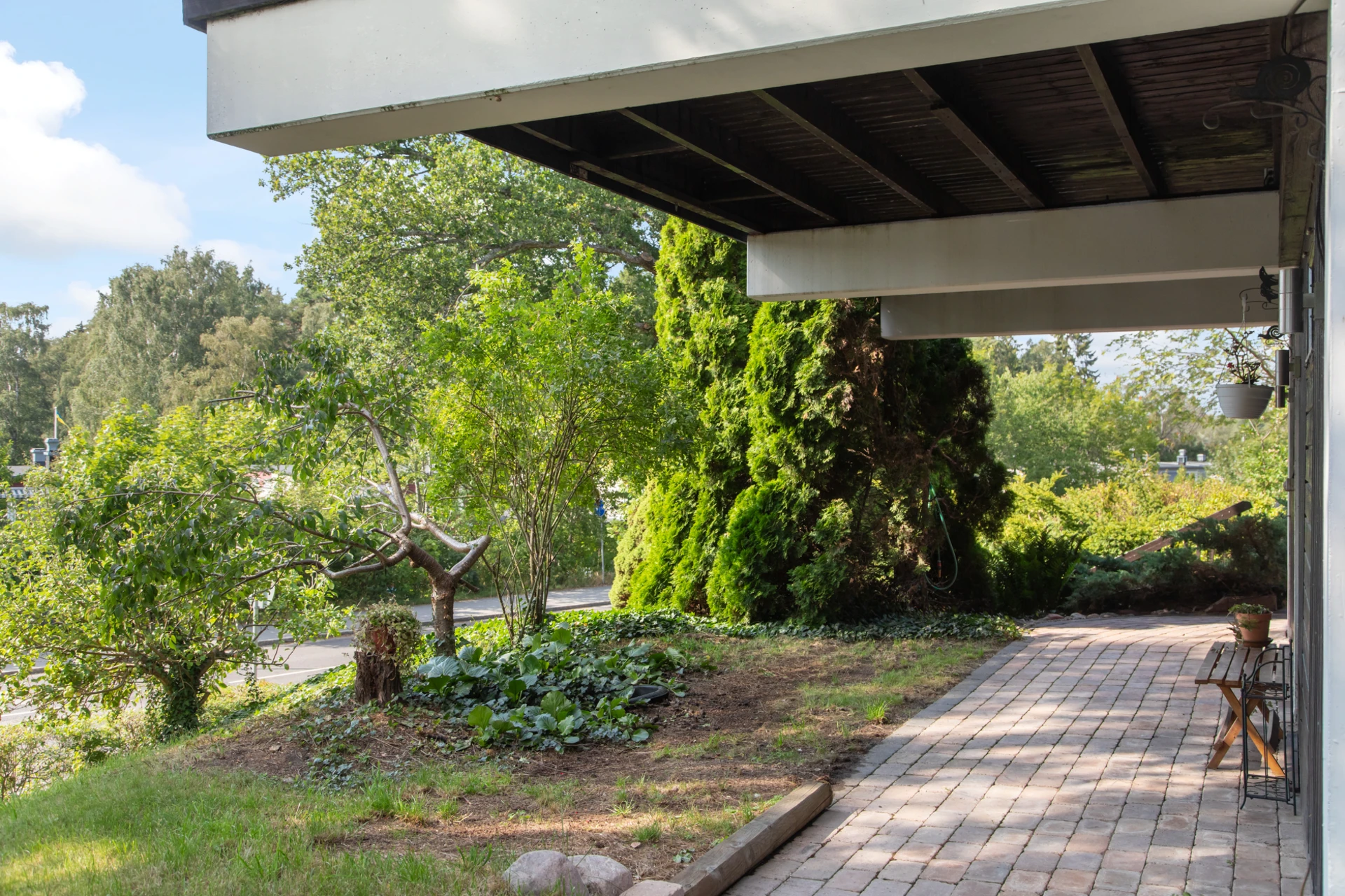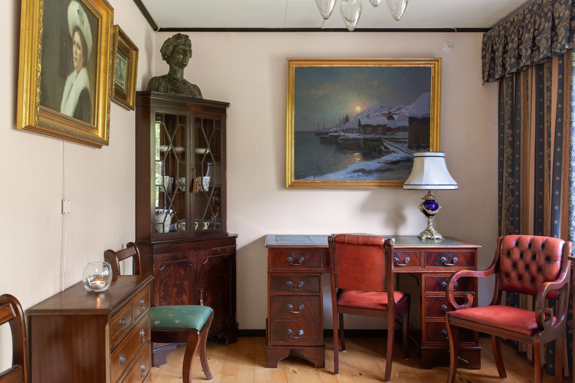 Parkettgolv och väggar i ljus/blå kulör. Fönsterparti och utgång till uteplats. Rummet går att dela av till ytterligare ett sovrum. Fönsterpartier.