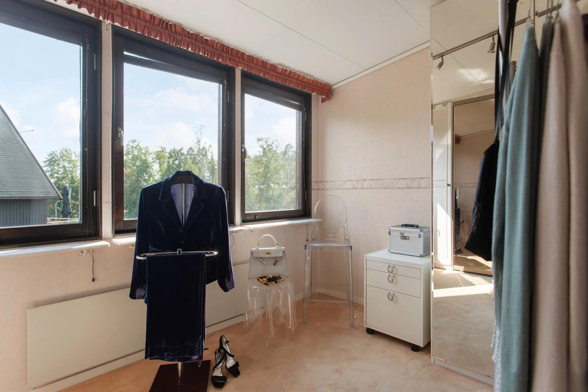 Heltäckningsmatta och ljusa väggar samt ingång till klädkammare. Fönsterparti.
