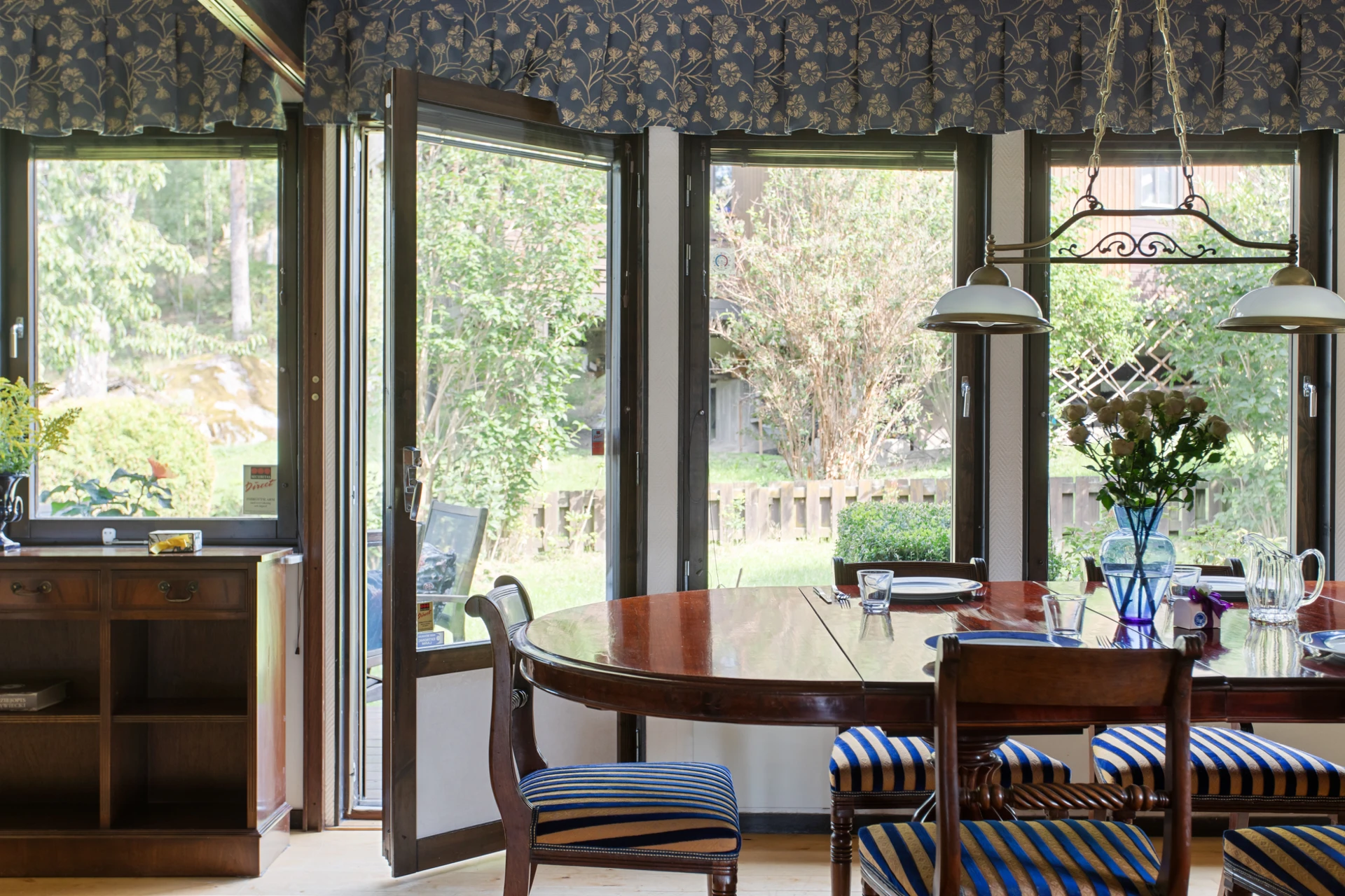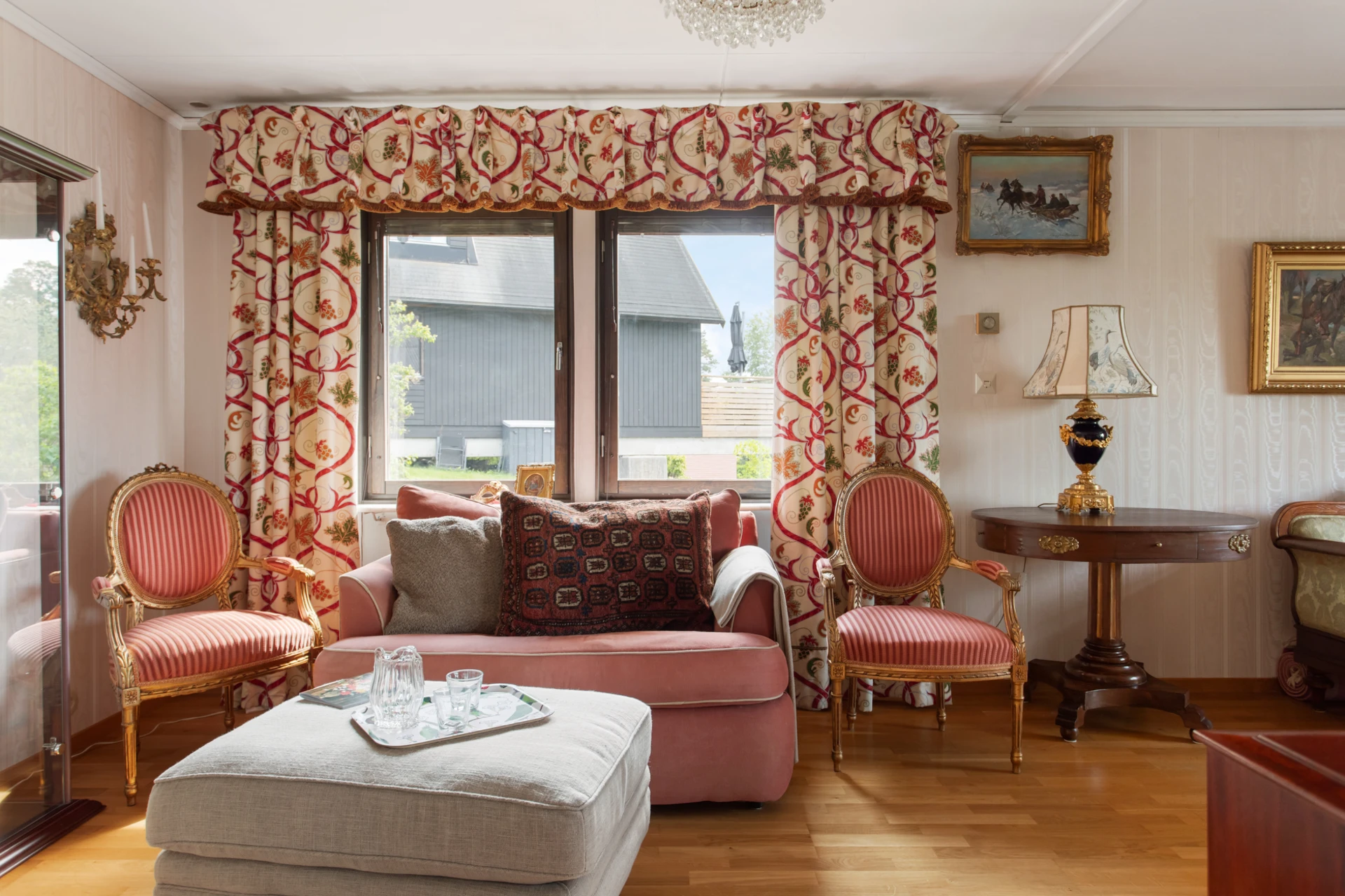 Heltäckningsmatta och ljusa väggar. Fönsterparti.