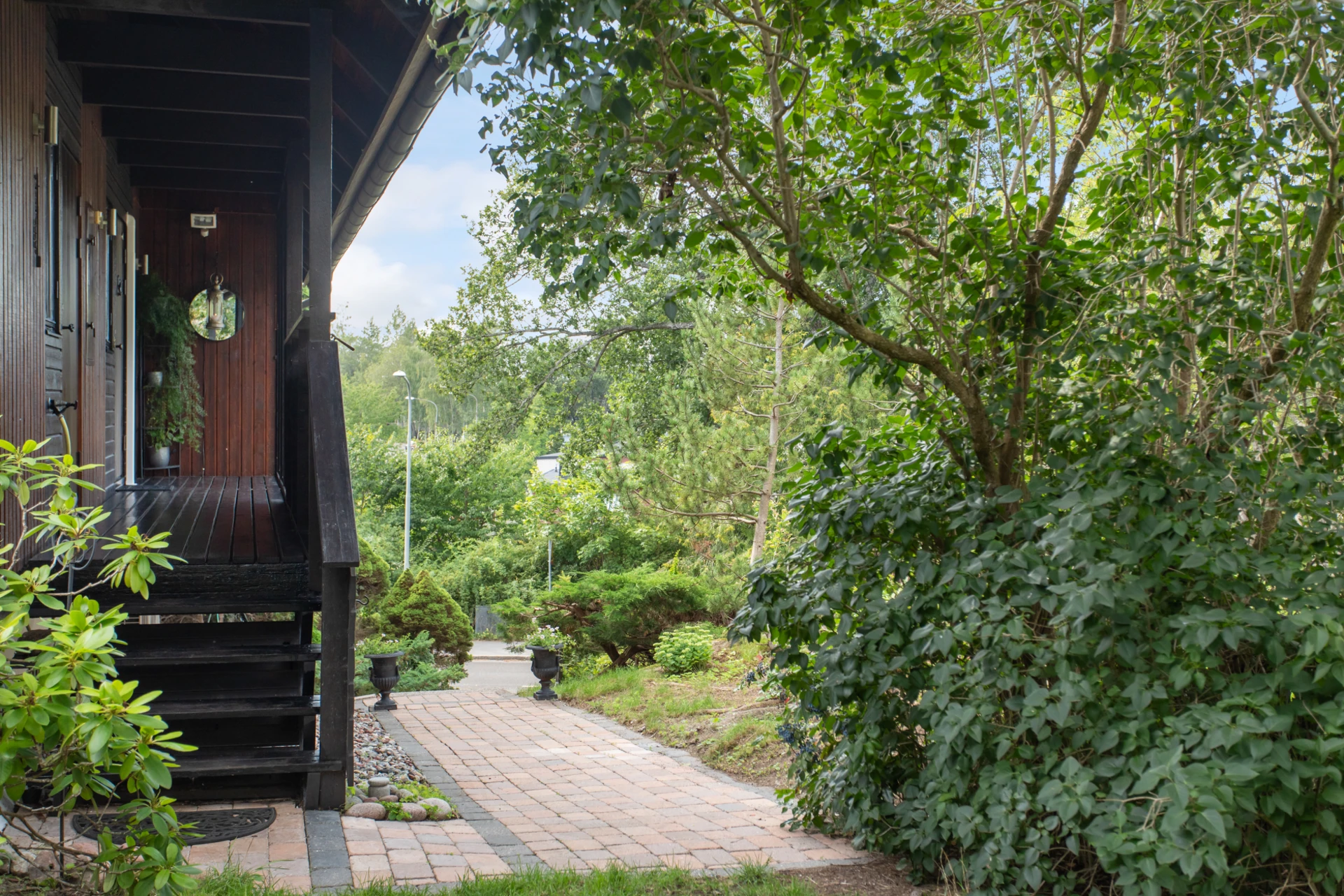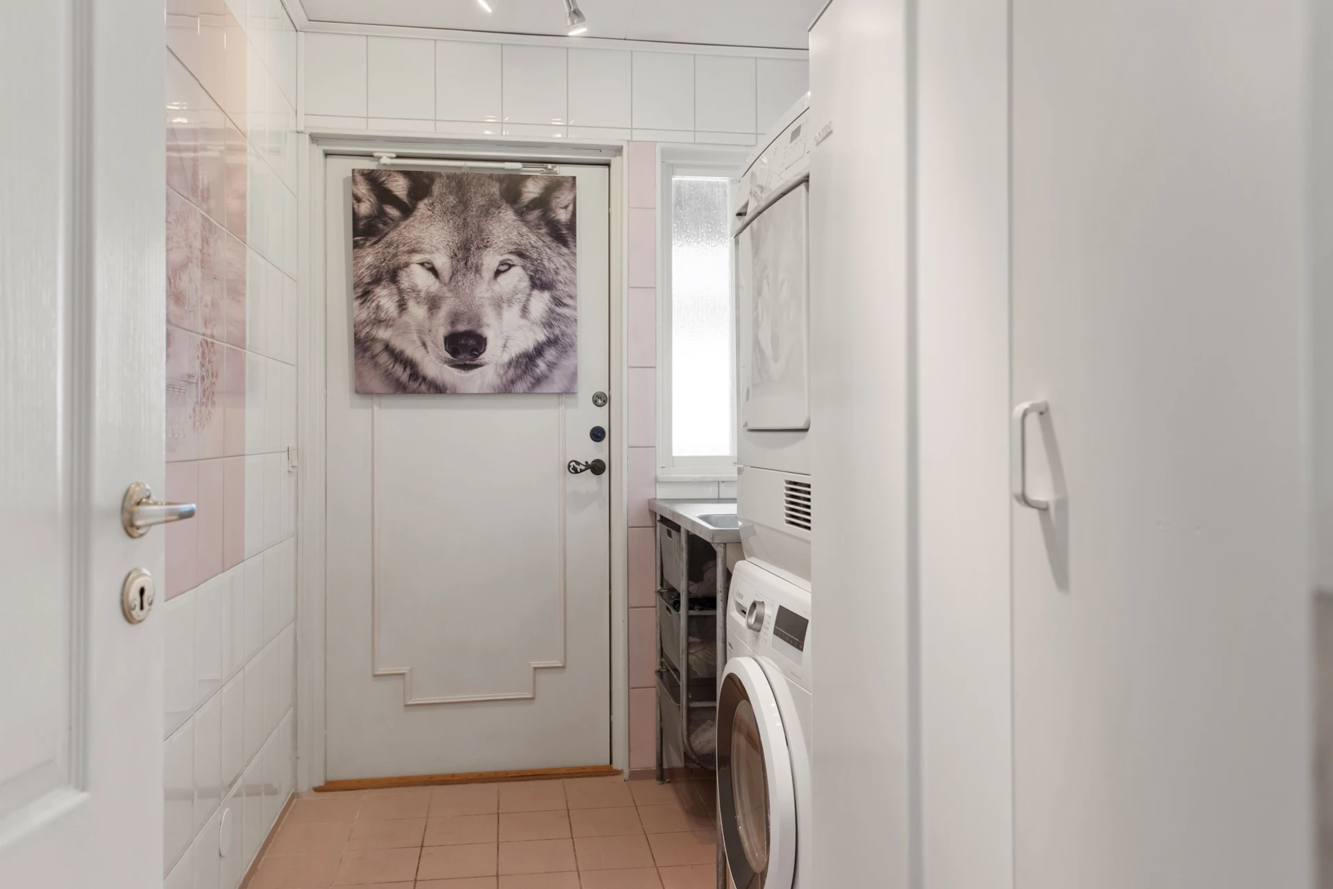 Klinkergolv och kaklade ljusa väggar. Tvättmaskin, torktumlare och diskho. Fönster och utgång.