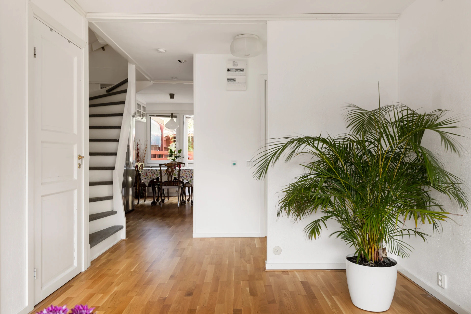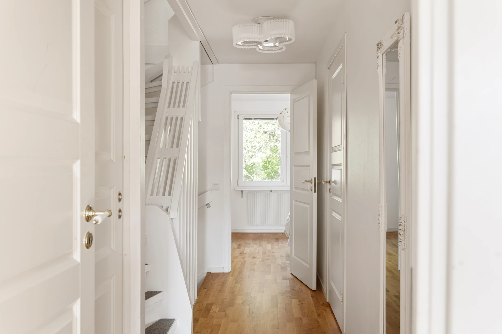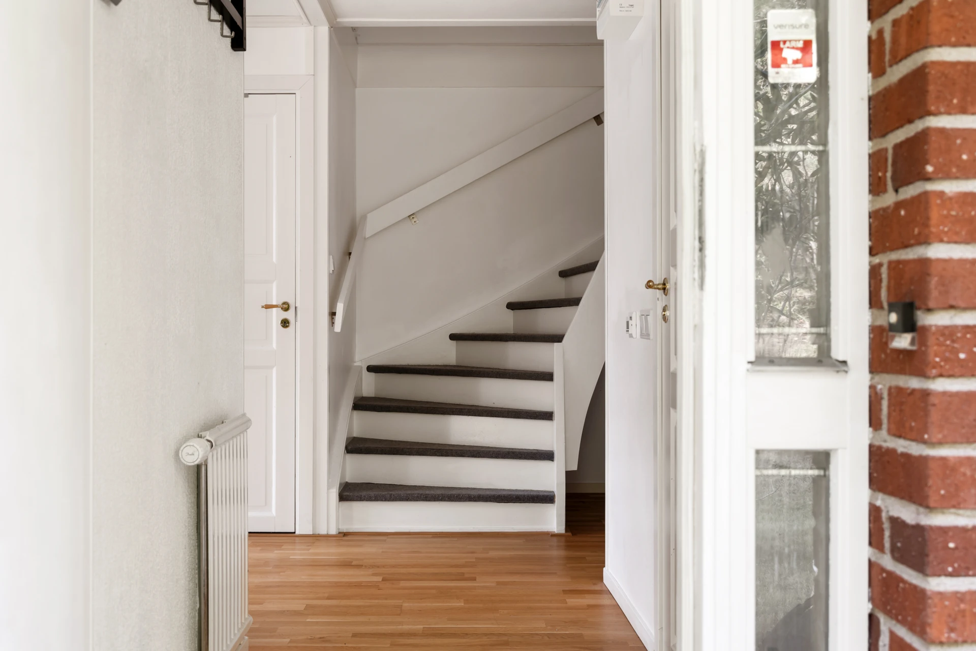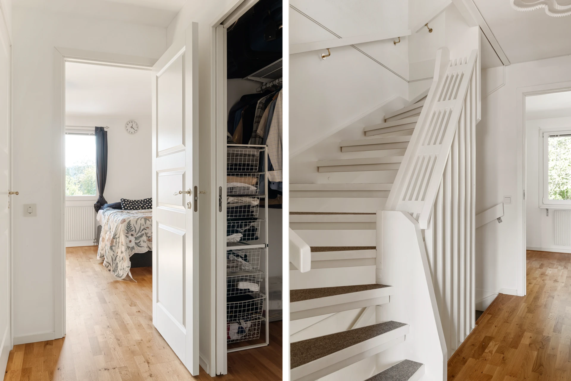 Parkettgolv och ljusa väggar. Hatthylla och förråd intill trapp till övre plan.