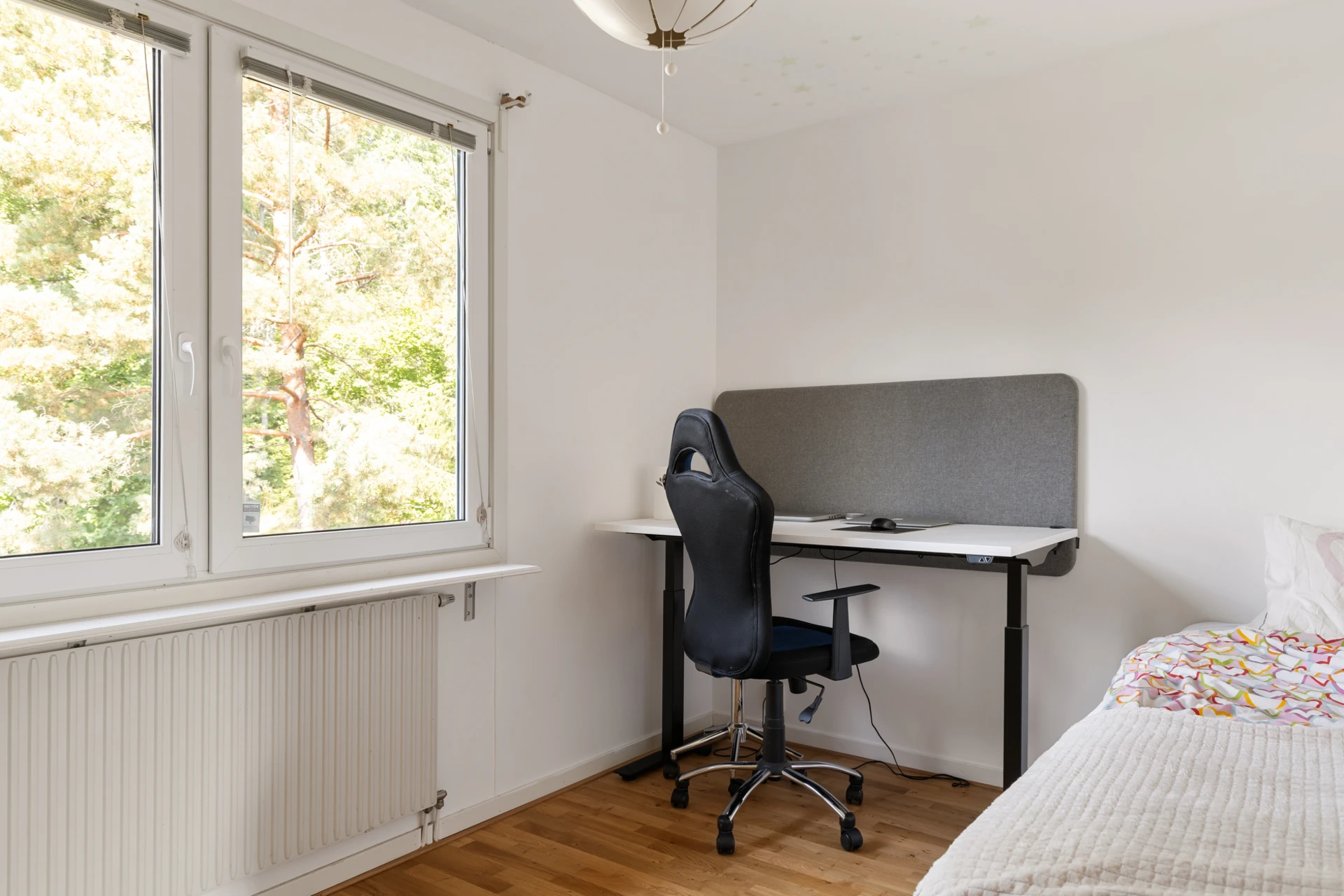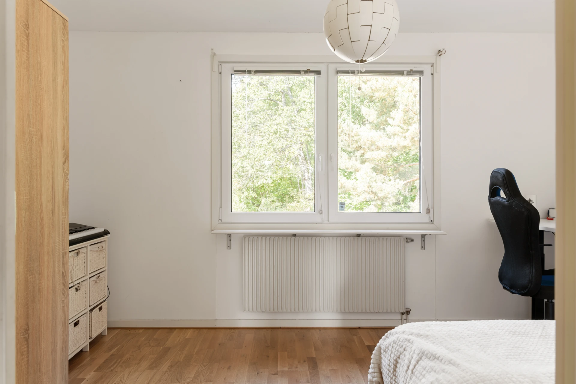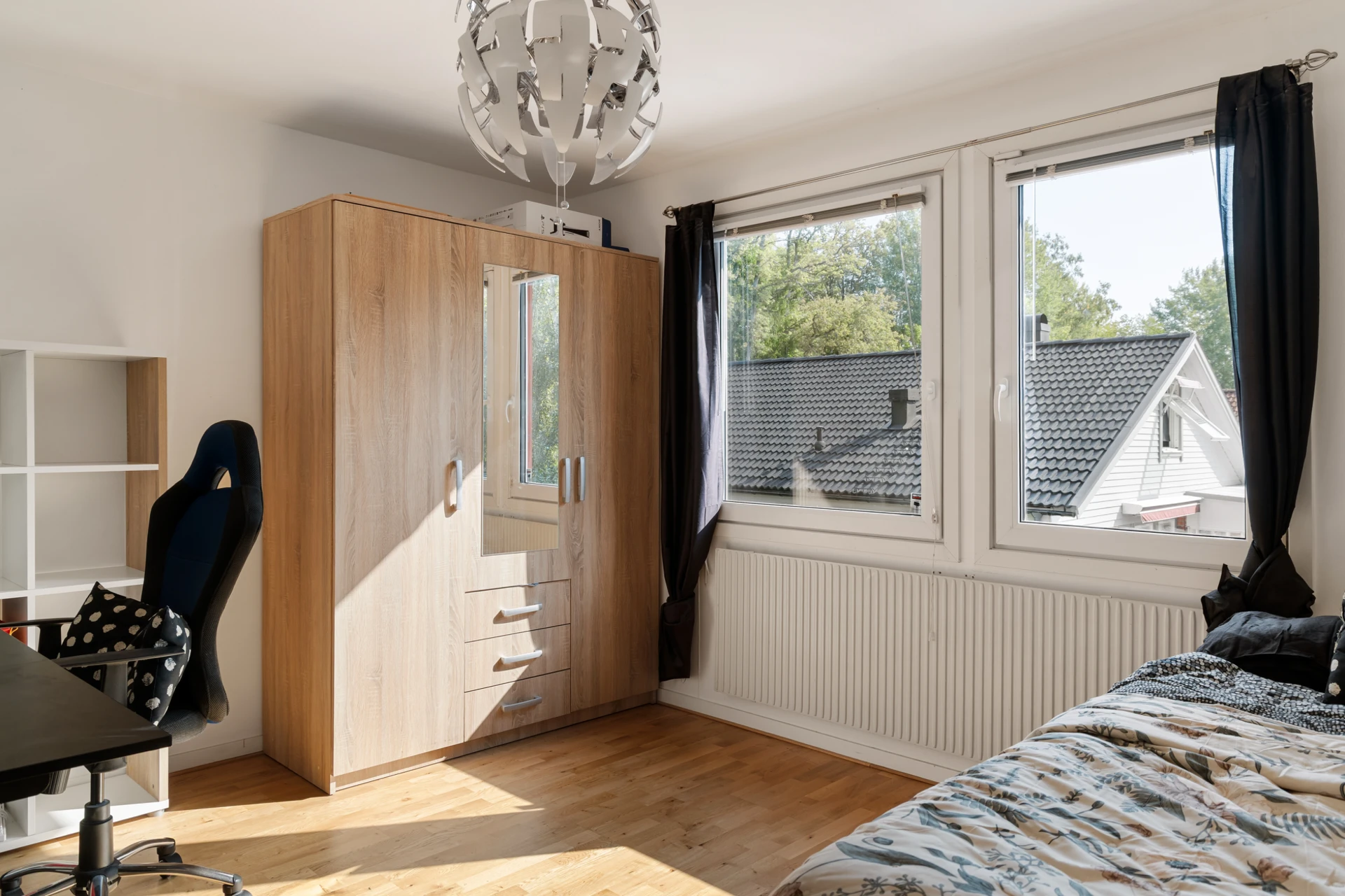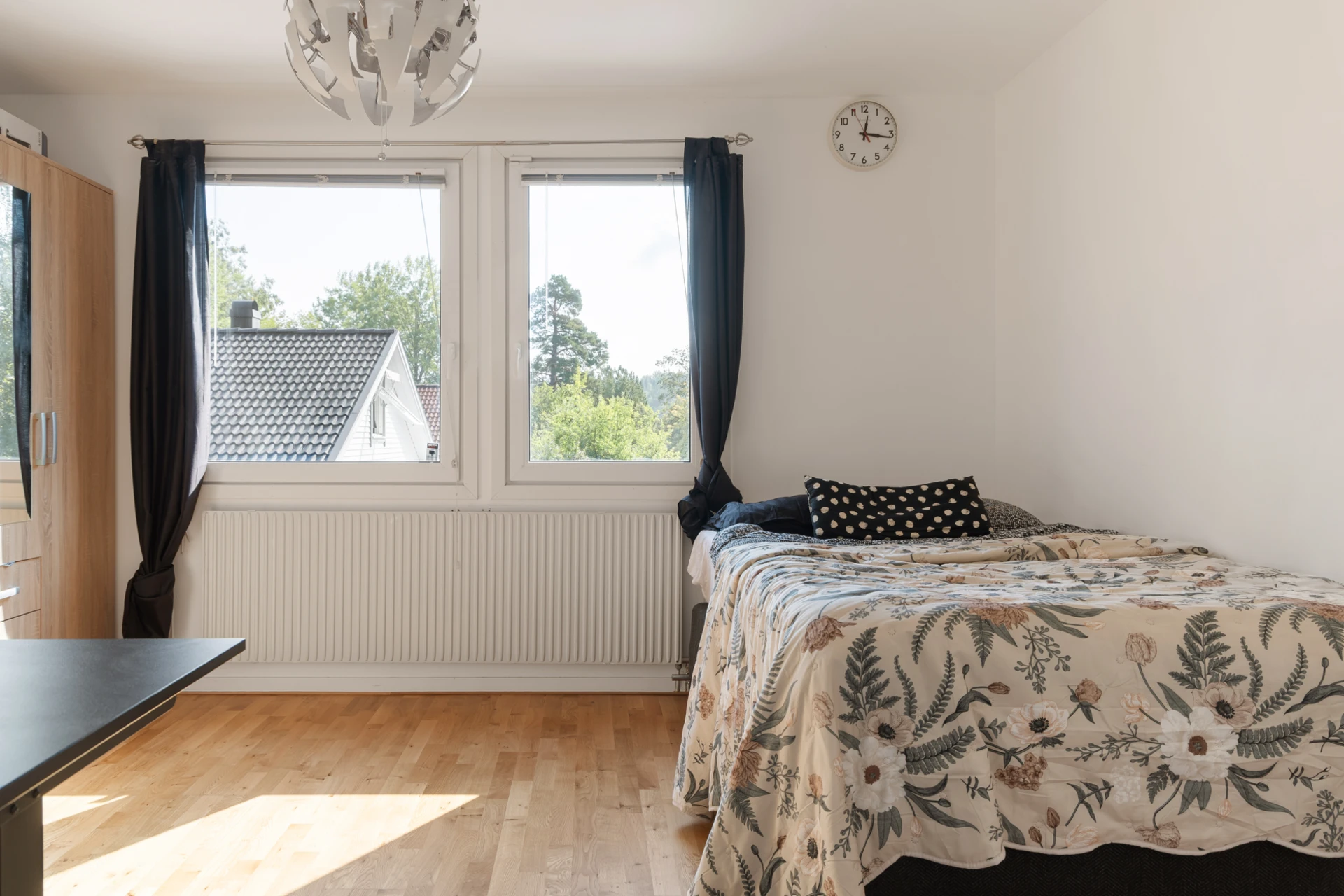 Parkettgolv och ljusa väggar. Garderob och två fönster. Intill sovrummet finns en klädkammare med skjutdörr samt ingång till ytterligare en klädkammare.