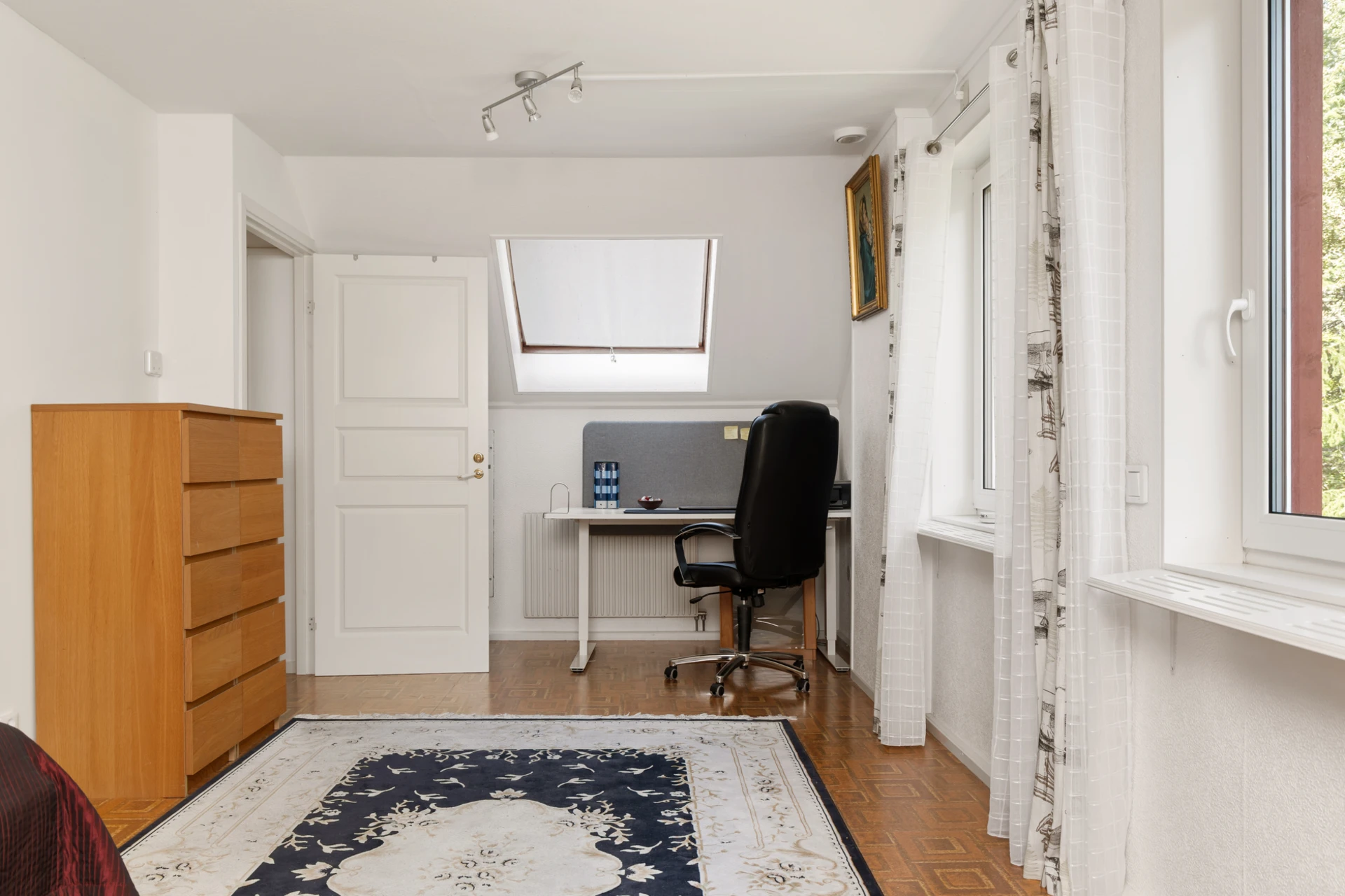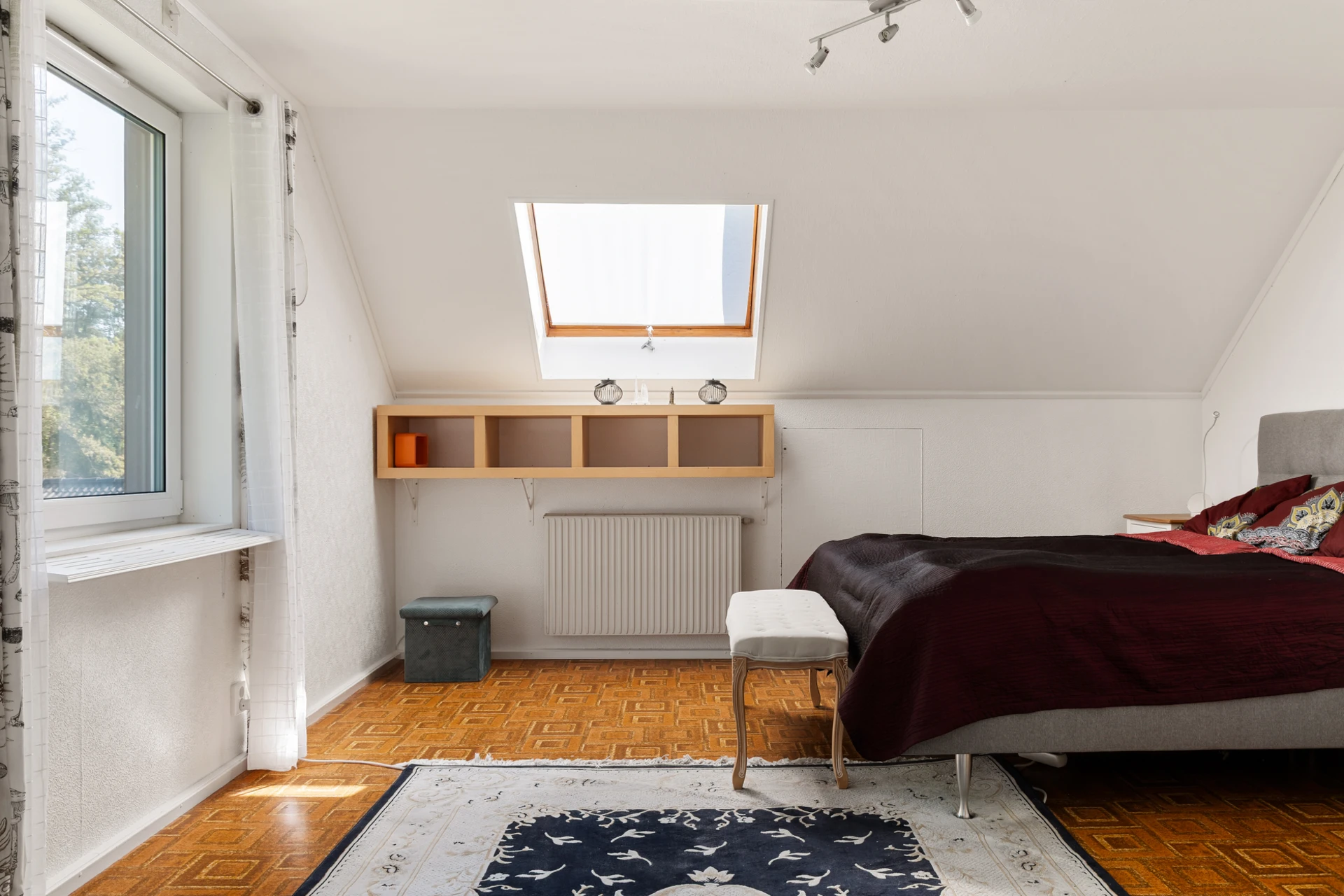 Ljust golv och ljusa väggar. Två fönster och två takfönster. Vindslucka till vinden och kattvindar för extra förvaring.