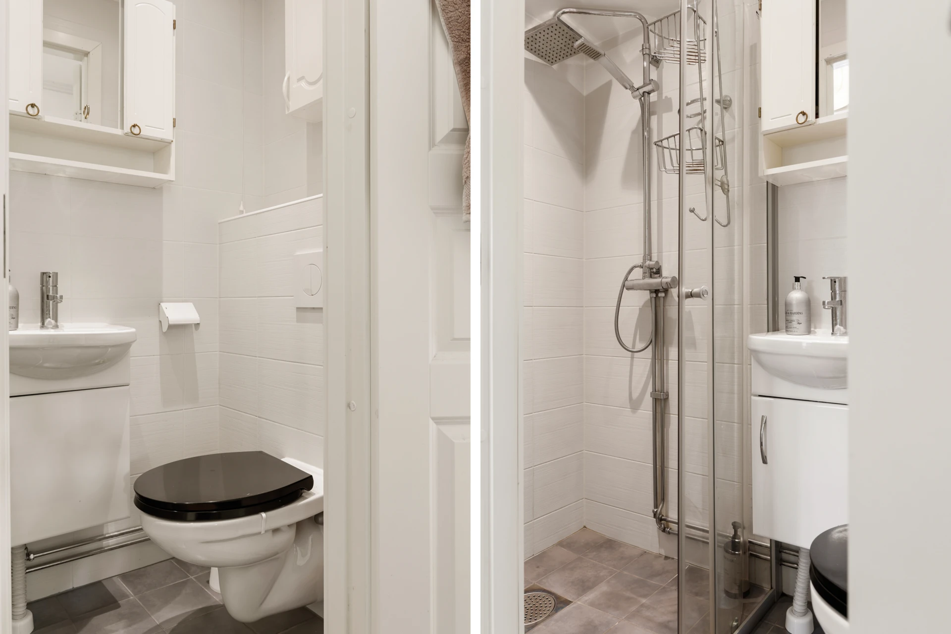 Grått klinkergolv med golvvärme (el) och kaklade vita väggar. WC, handfat med kommod, spegelskåp och dusch med glasväggar.