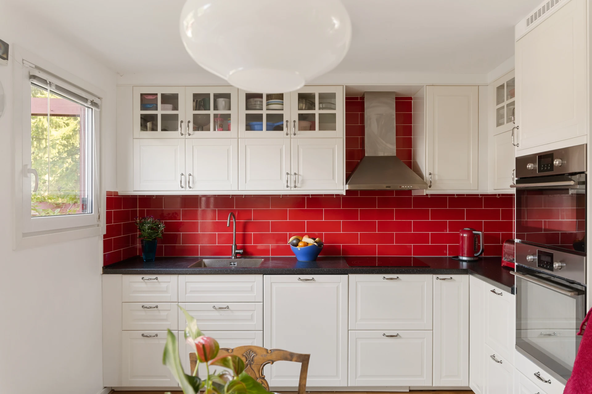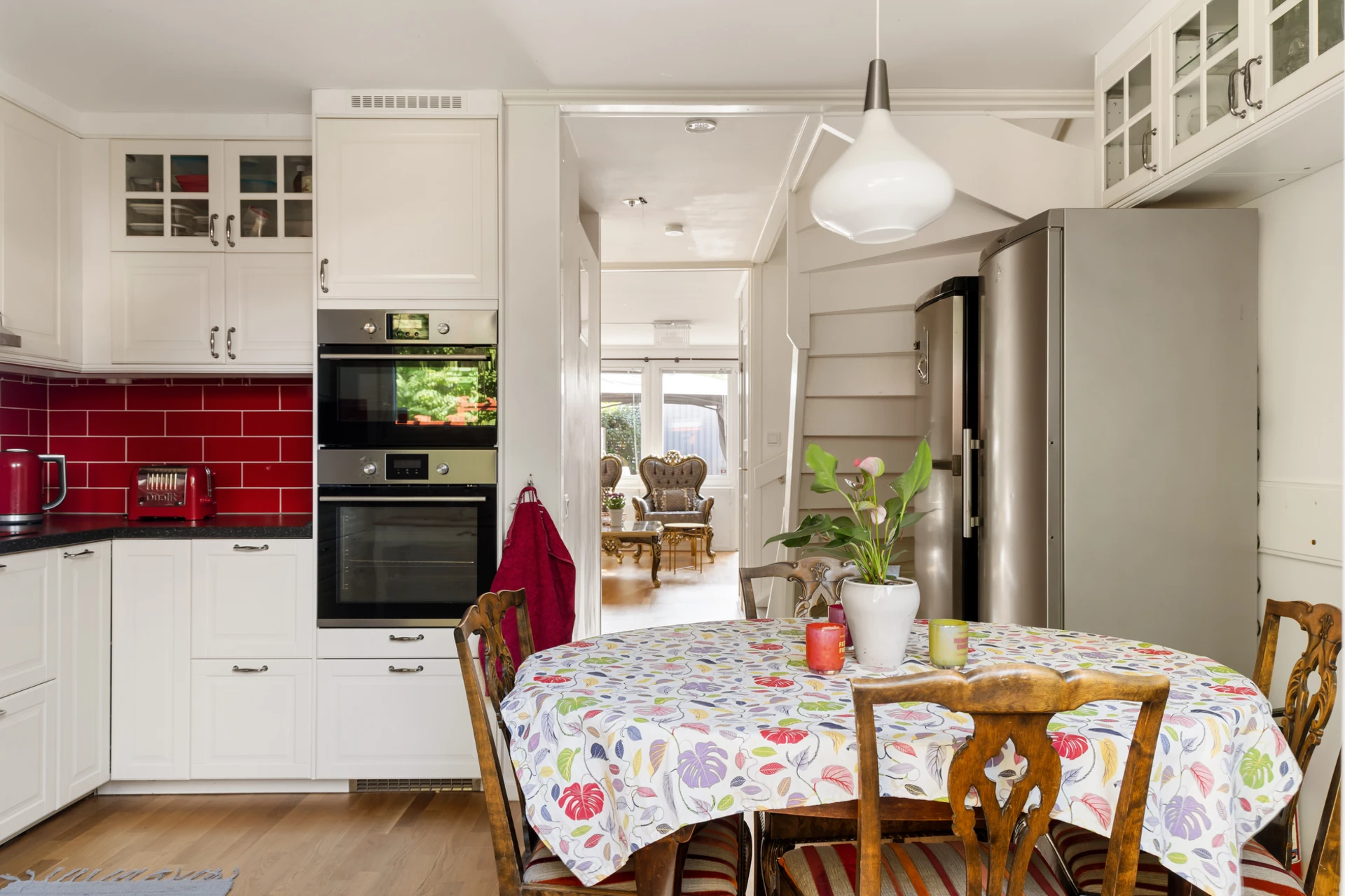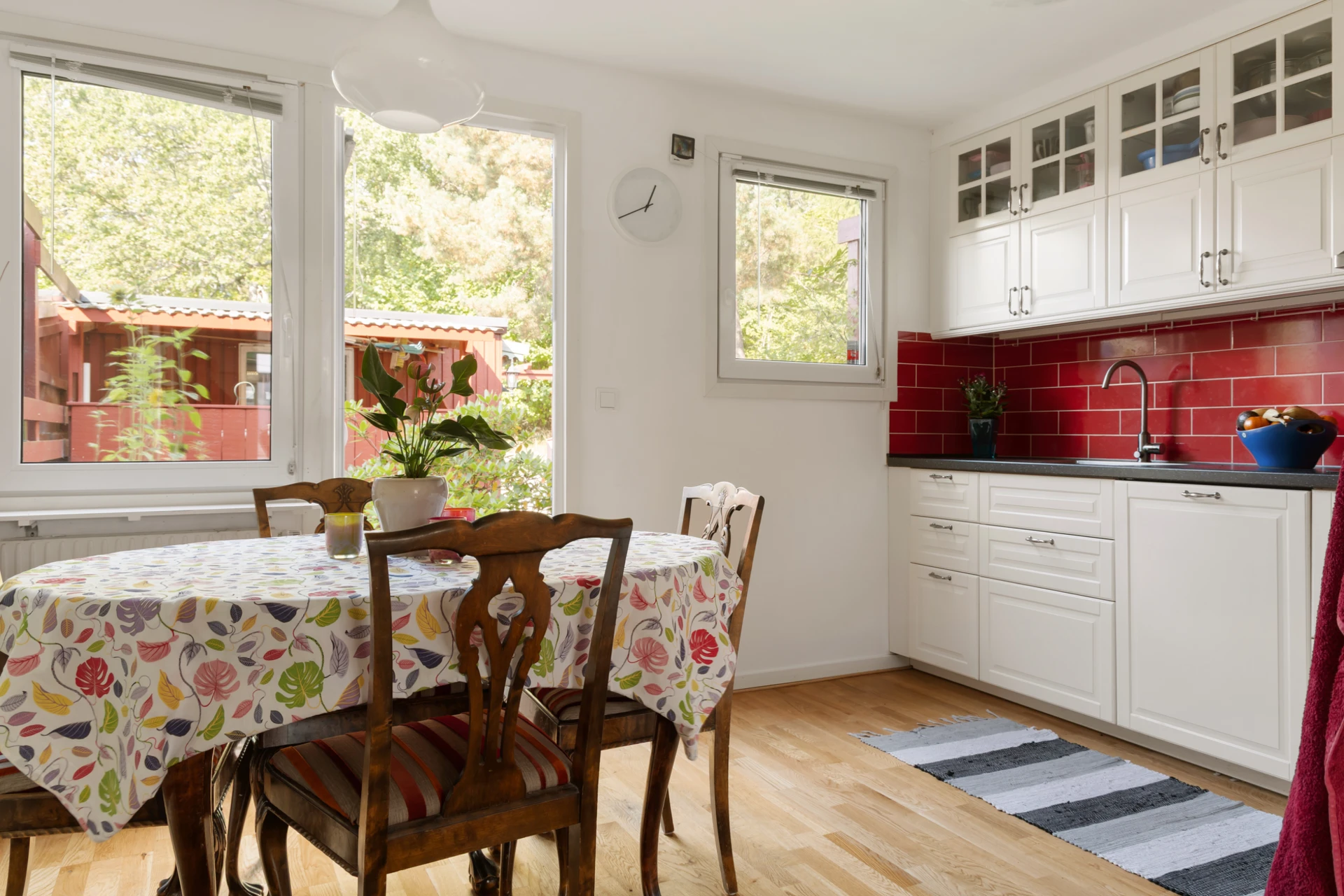Parkettgolv och ljusa väggar. Vita skåpsluckor och rött kakel ovan arbetsytor. Inbyggnadsugn, micro, kyl, frys, häll och fläkt samt integrerad diskmaskin. Två fönster och utgång till uteplats.
