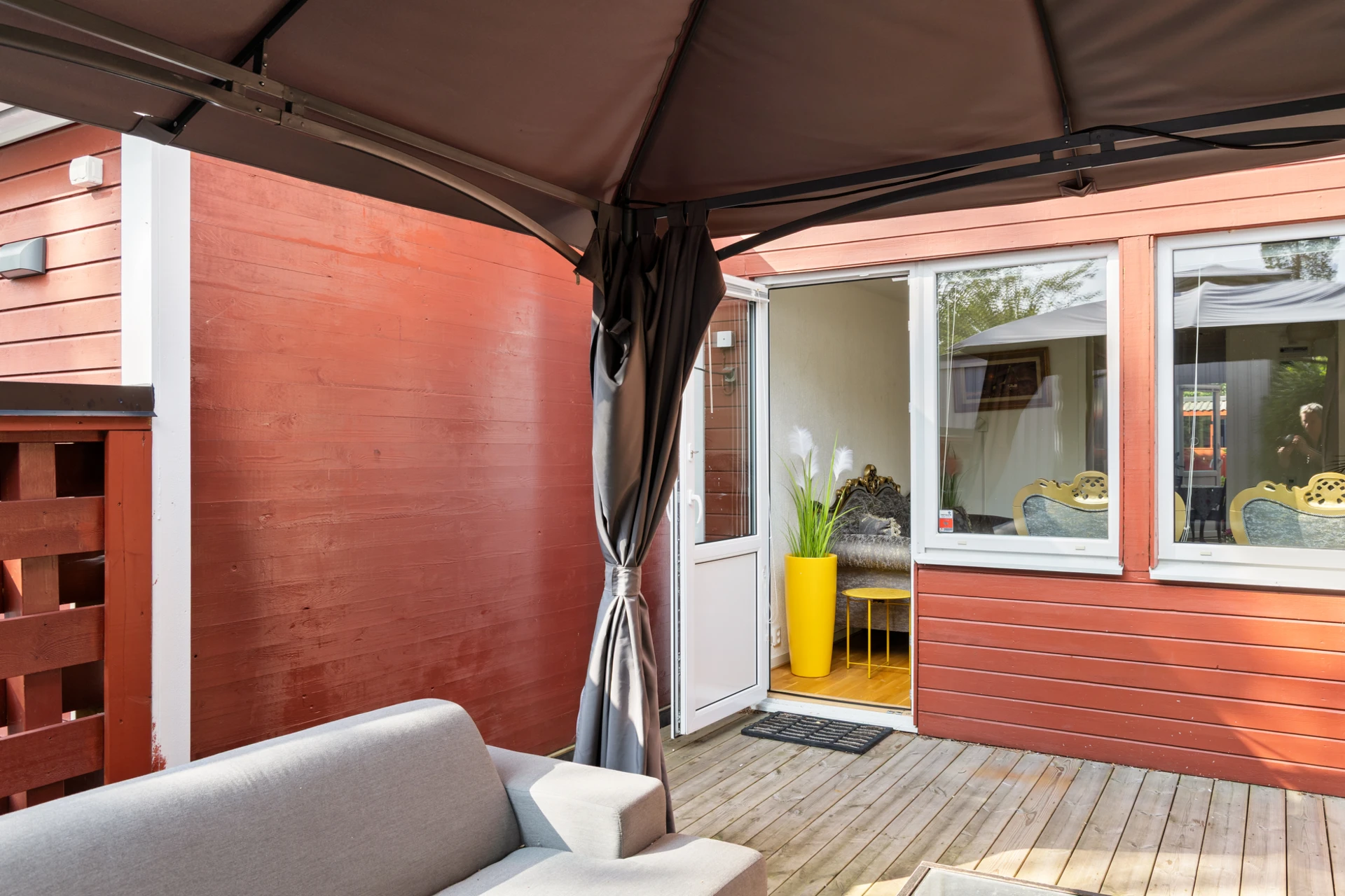 Parkettgolv och ljusa väggar. Två fönster och utgång till uteplats.