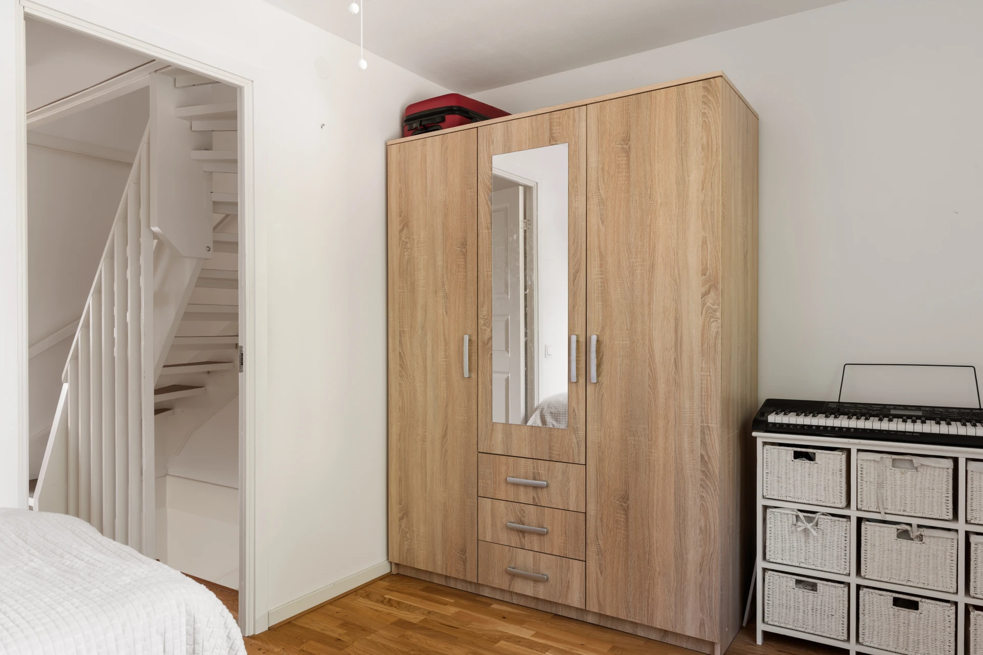 Parkettgolv och ljusa väggar. Garderob. Två fönster.