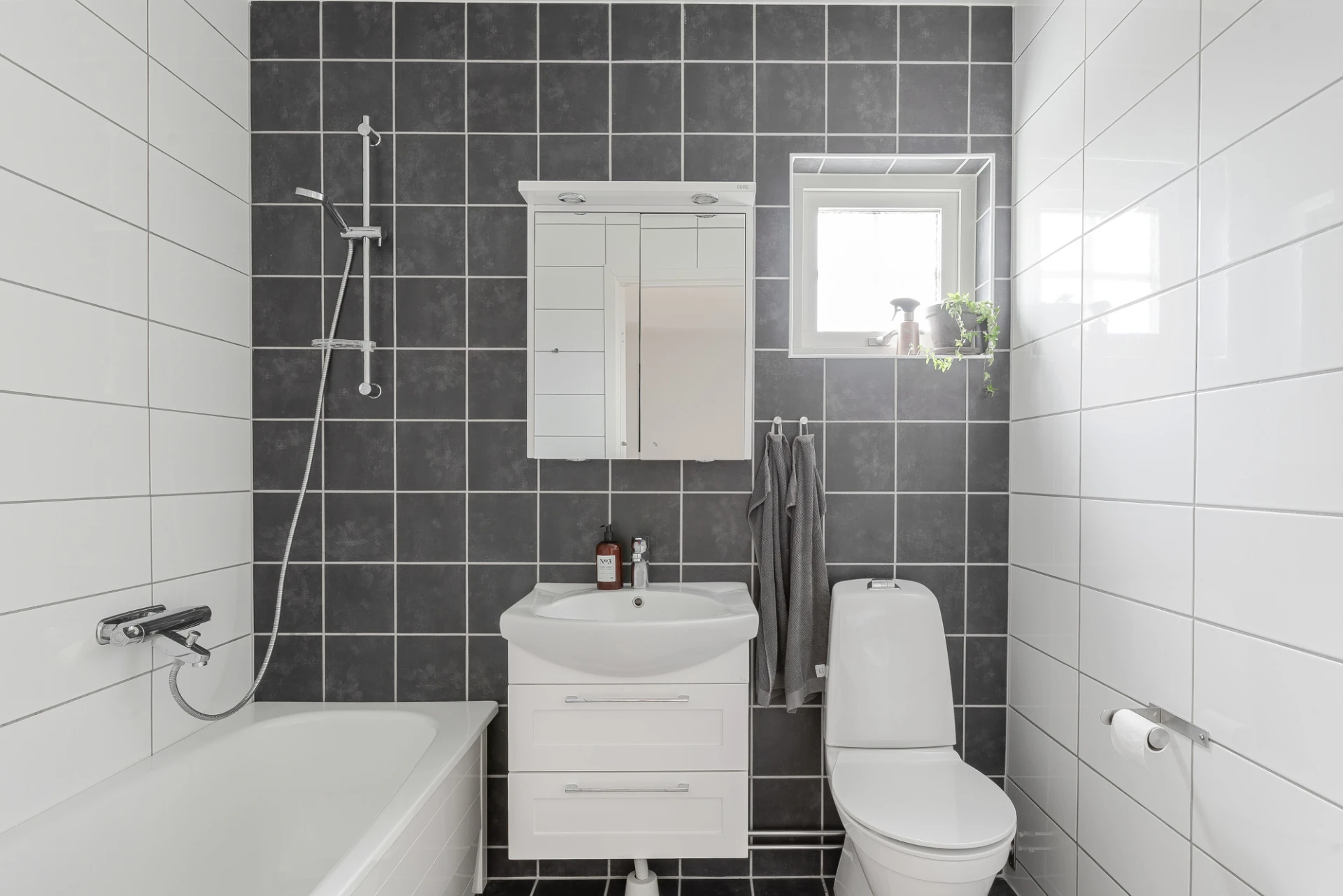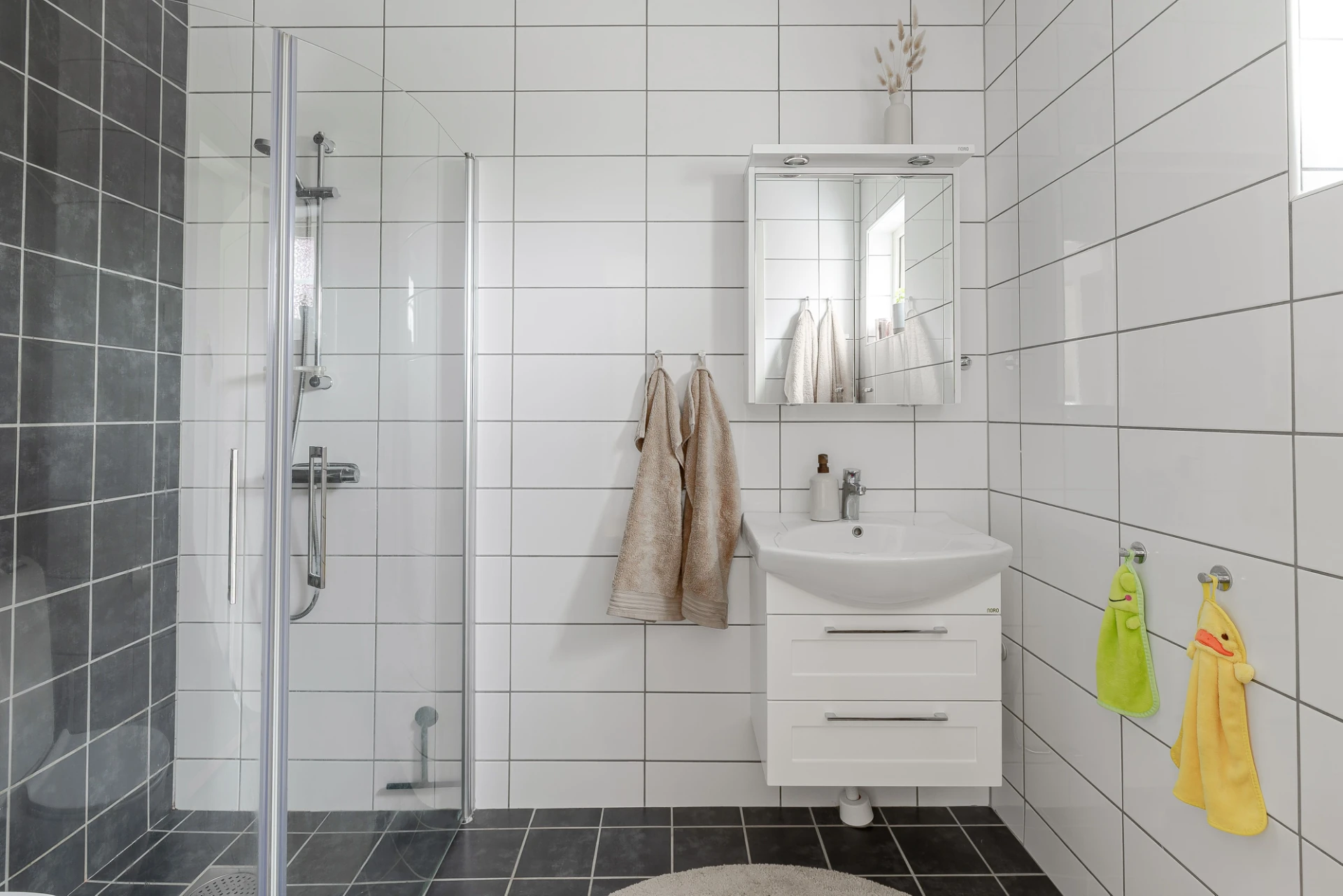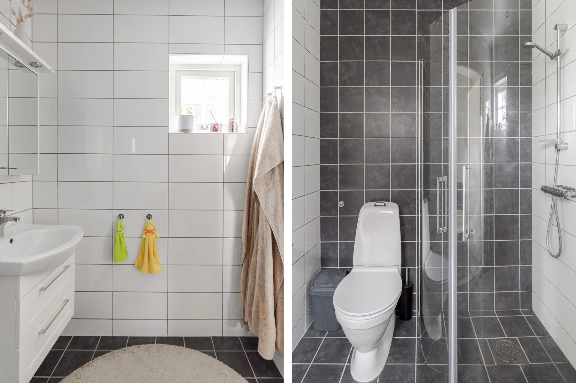 Kaklade väggar och grått klinkergolv med golvvärme (vattenburen). Här finns WC, tvättställ med kommod, spegelskåp, handukstork samt dusch med vikdörrar i glas.