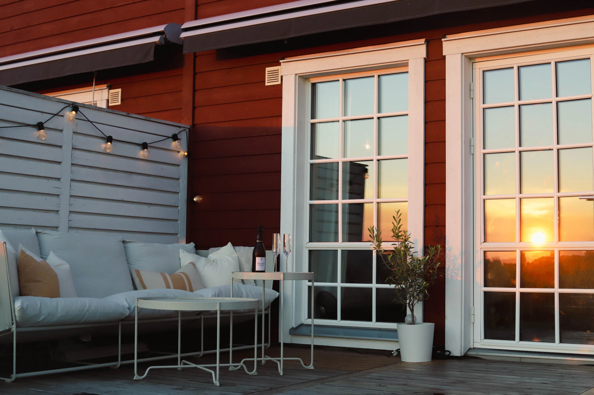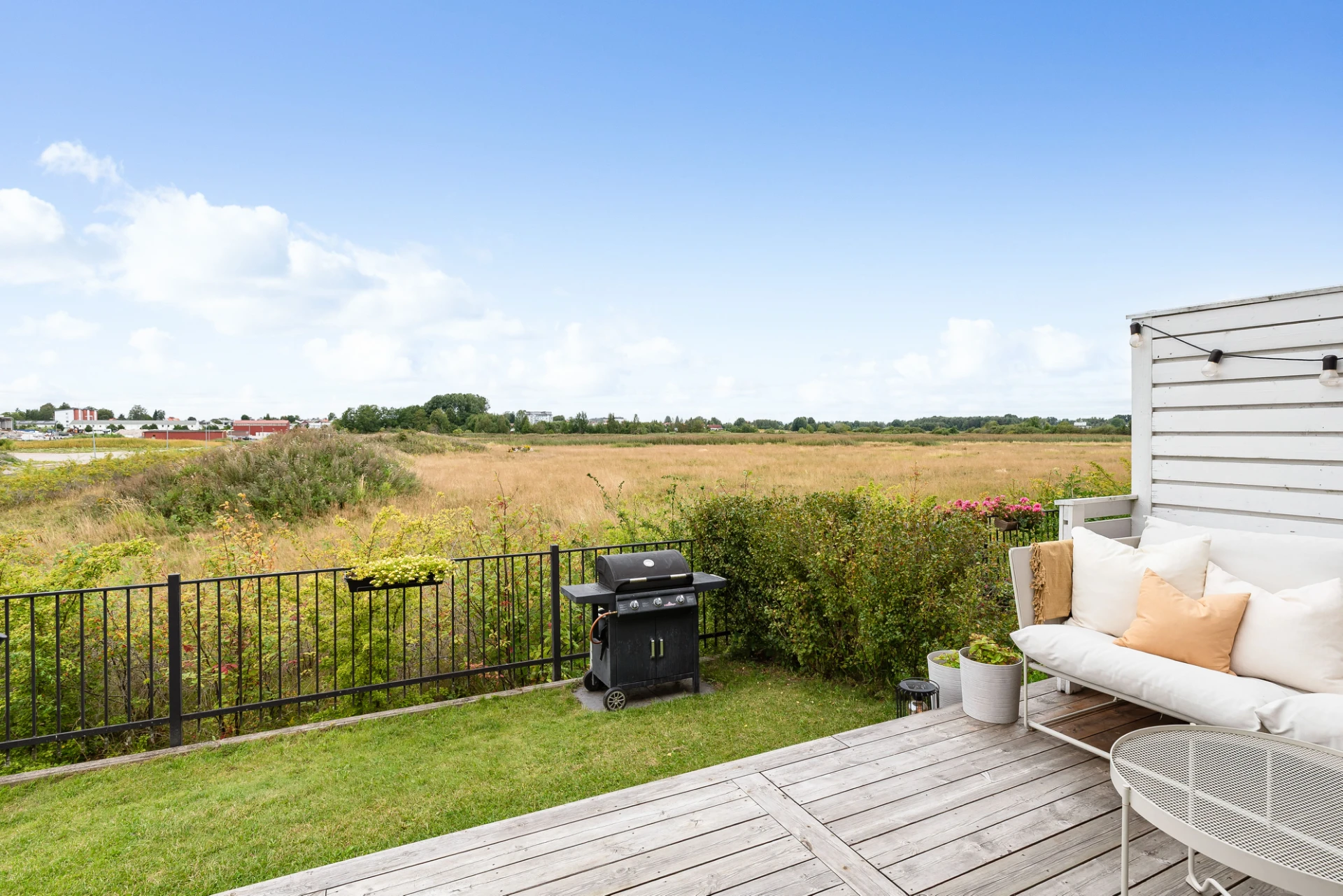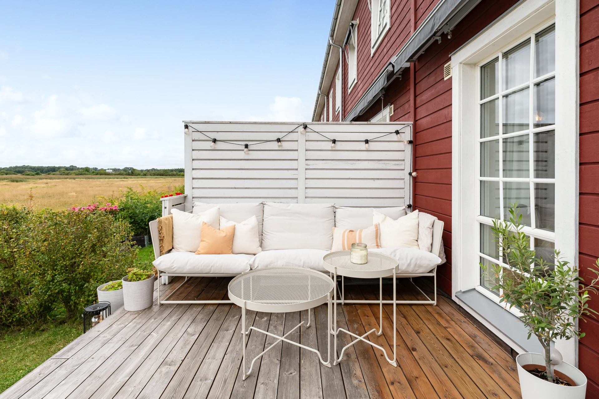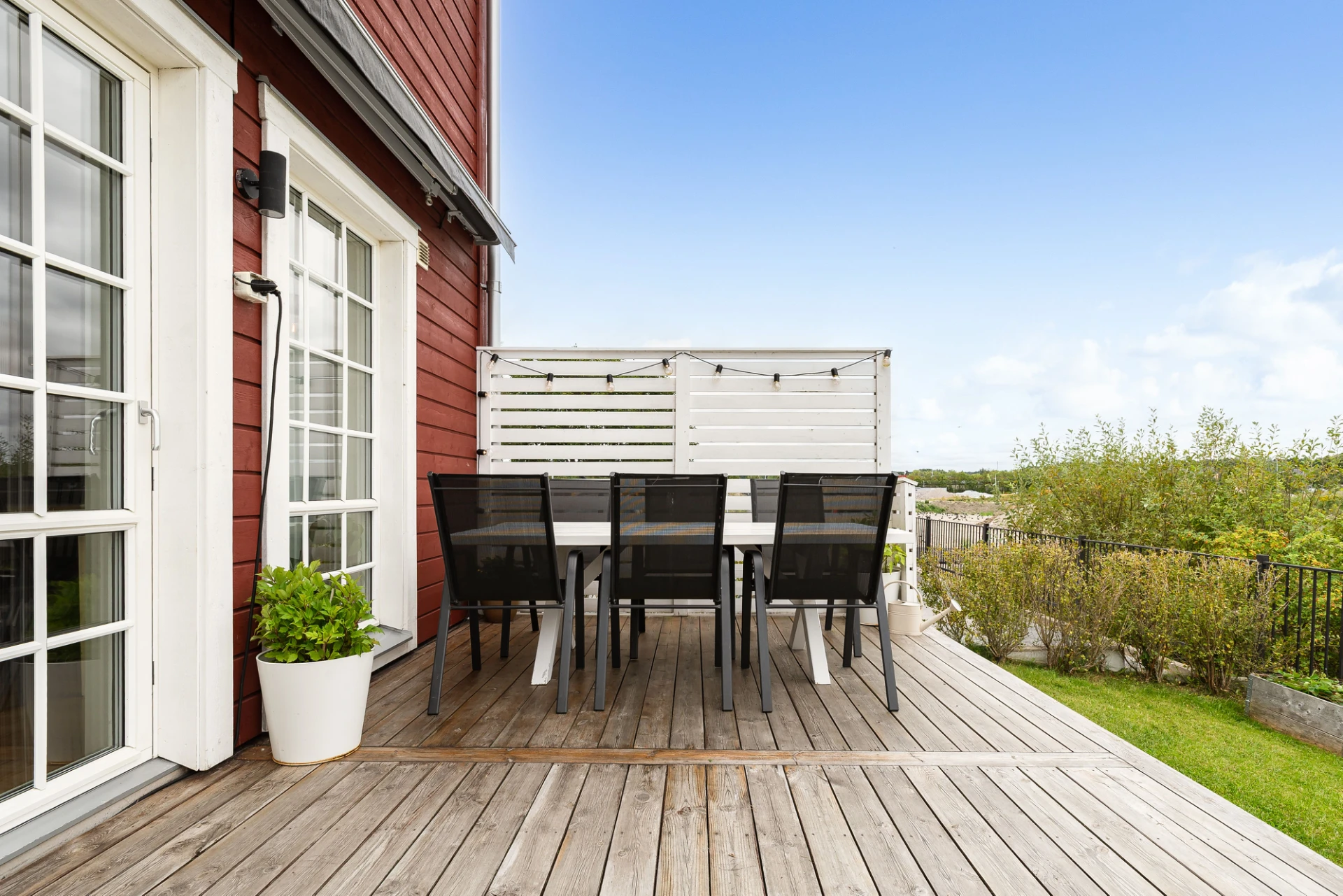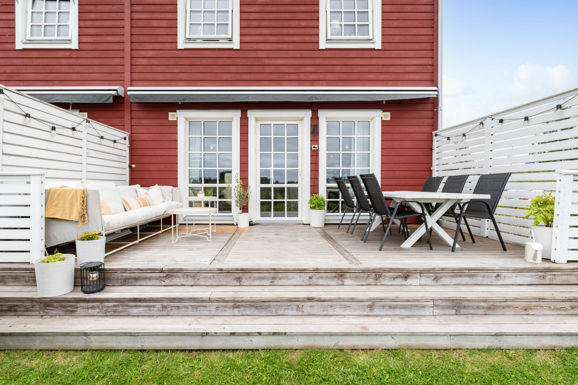 Uteplats med trätrall i västerläge. Här kan du njuta av vyn över oset i kvällssolen.