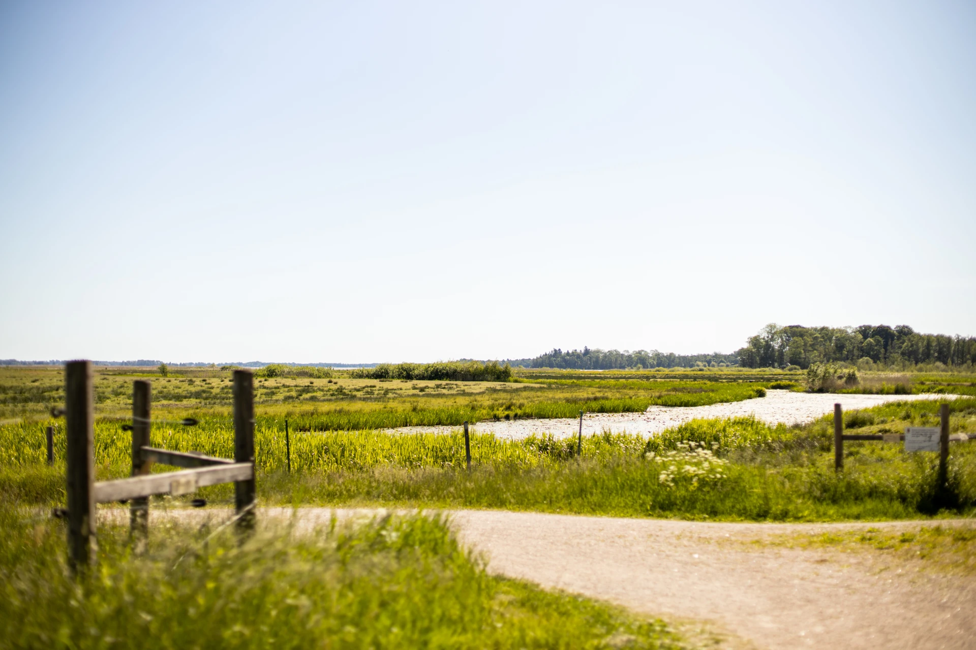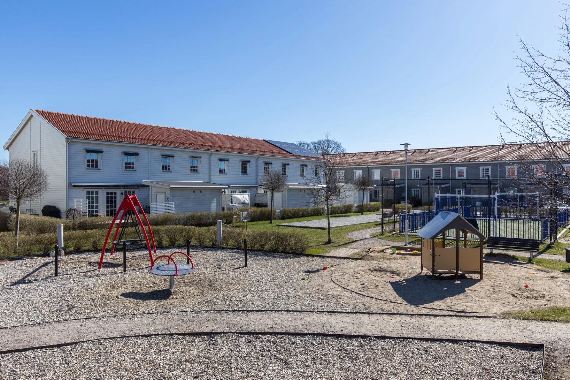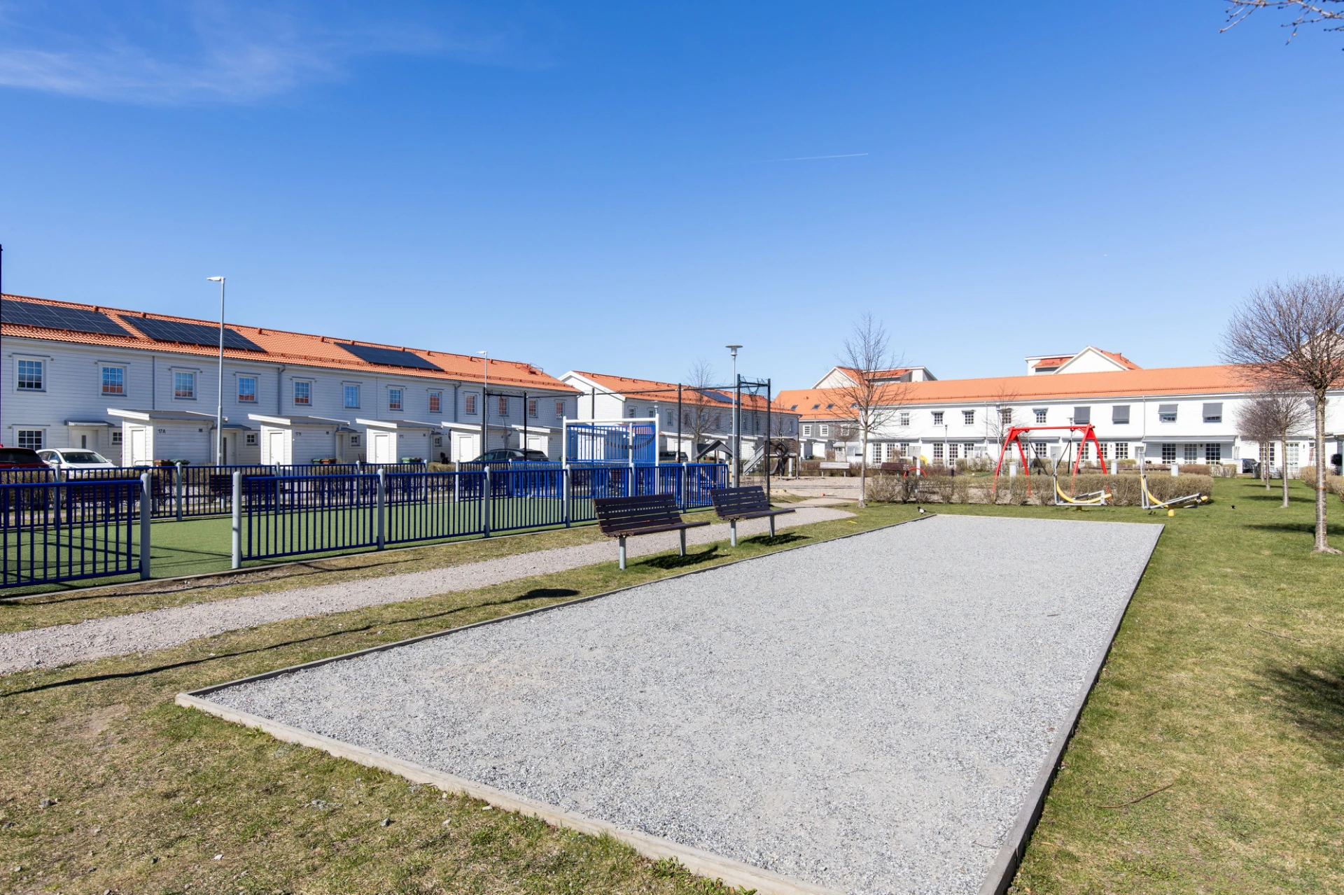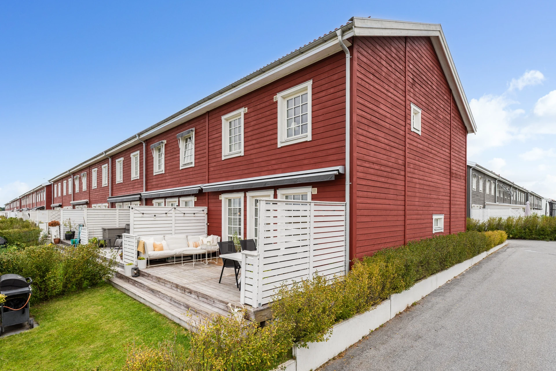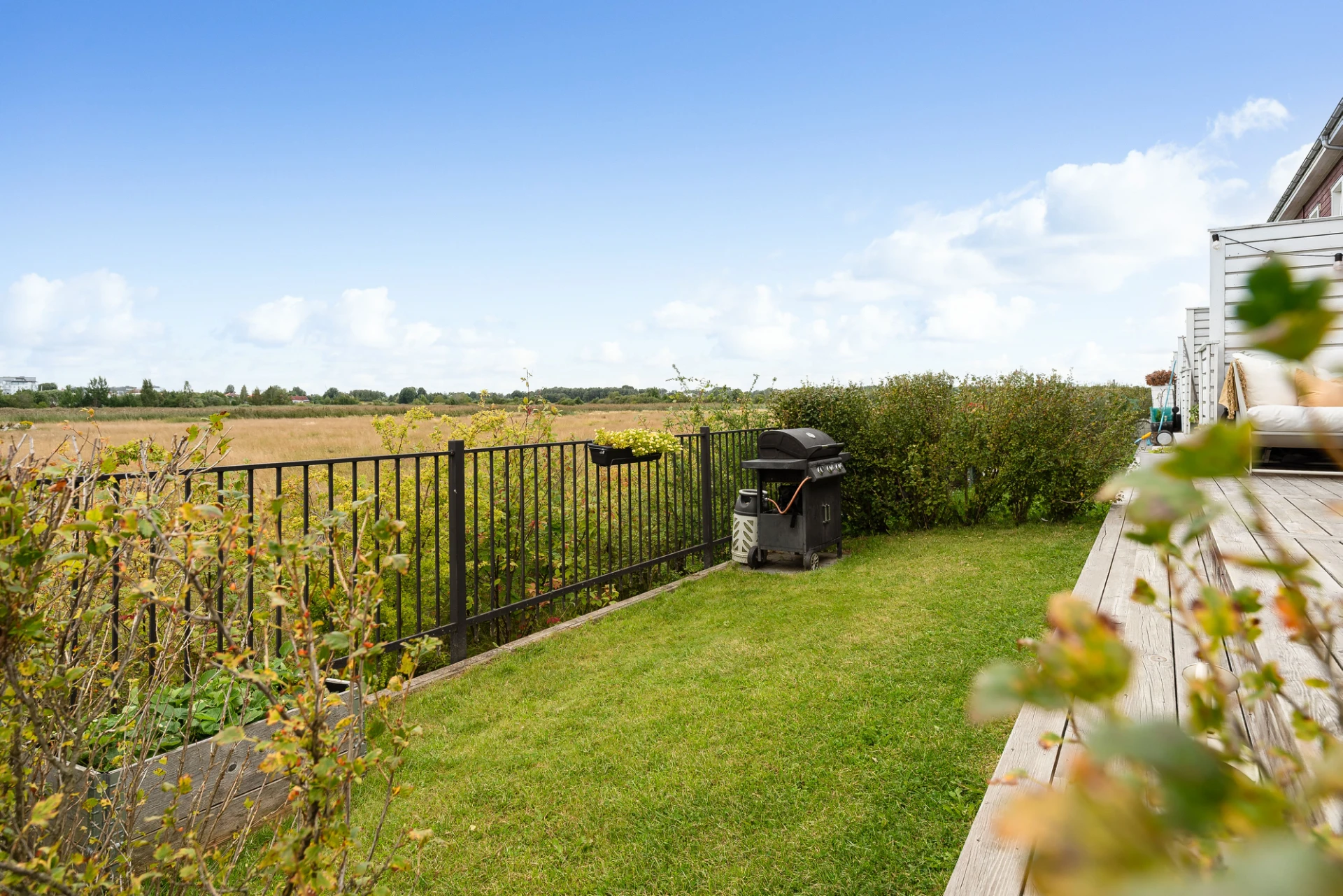 Uteplats med trätrall i västerläge. Här kan du njuta av vyn över oset i kvällssolen.