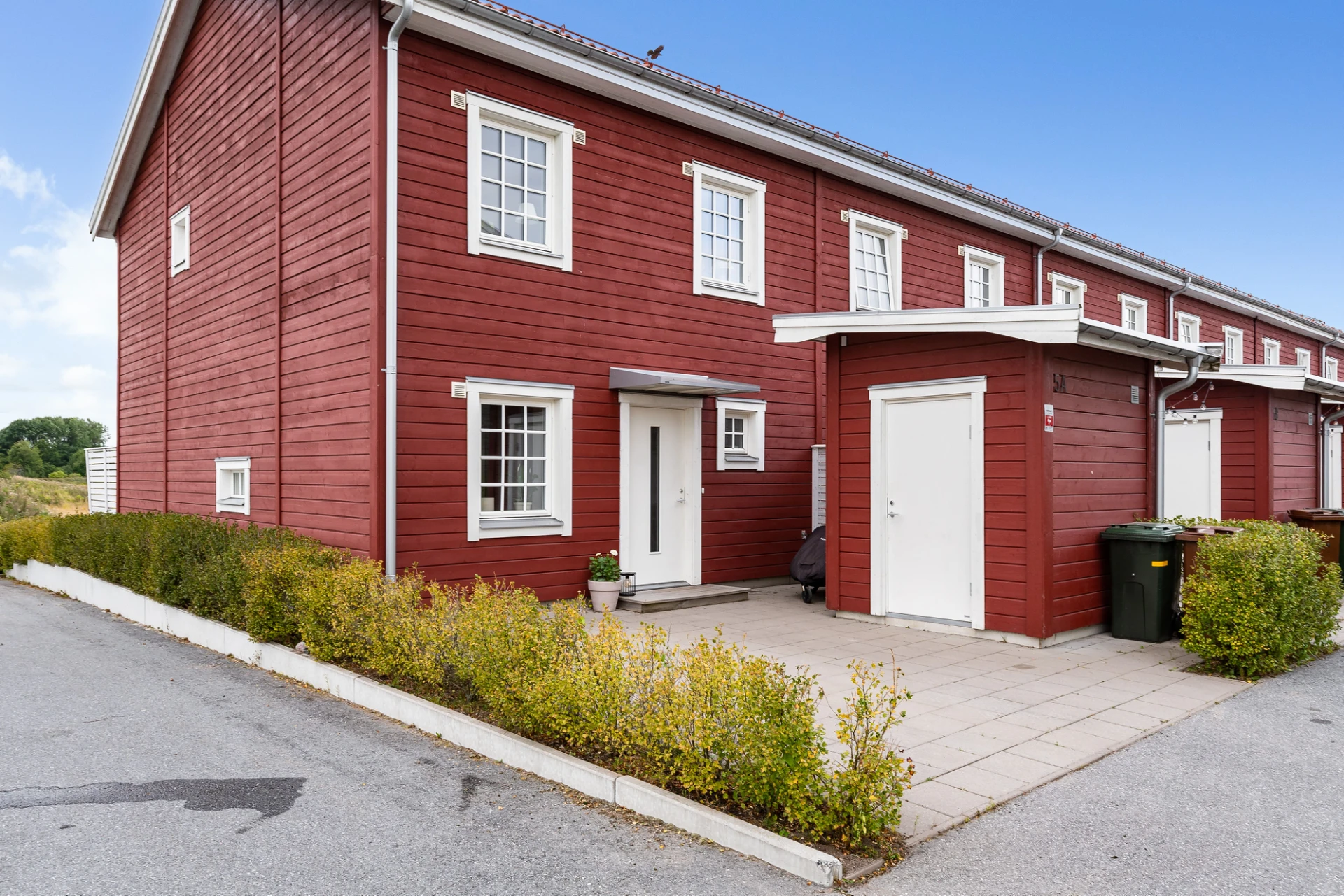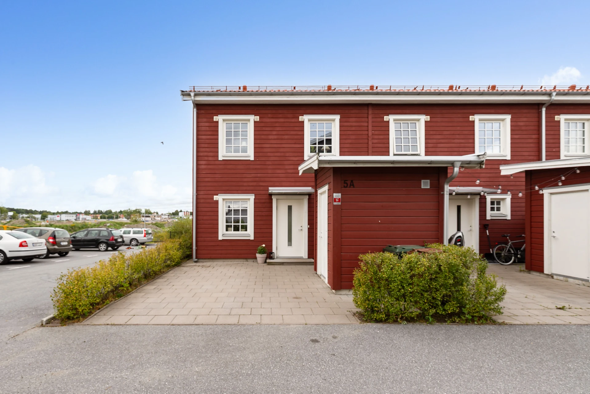 Uppfart med plats för bil samt ett förråd placerat framför bostaden.