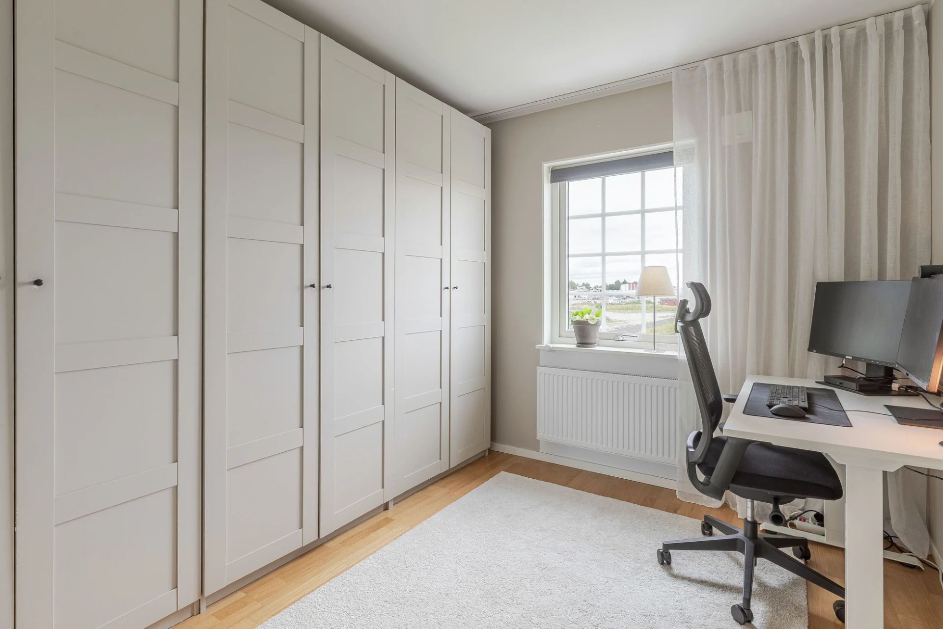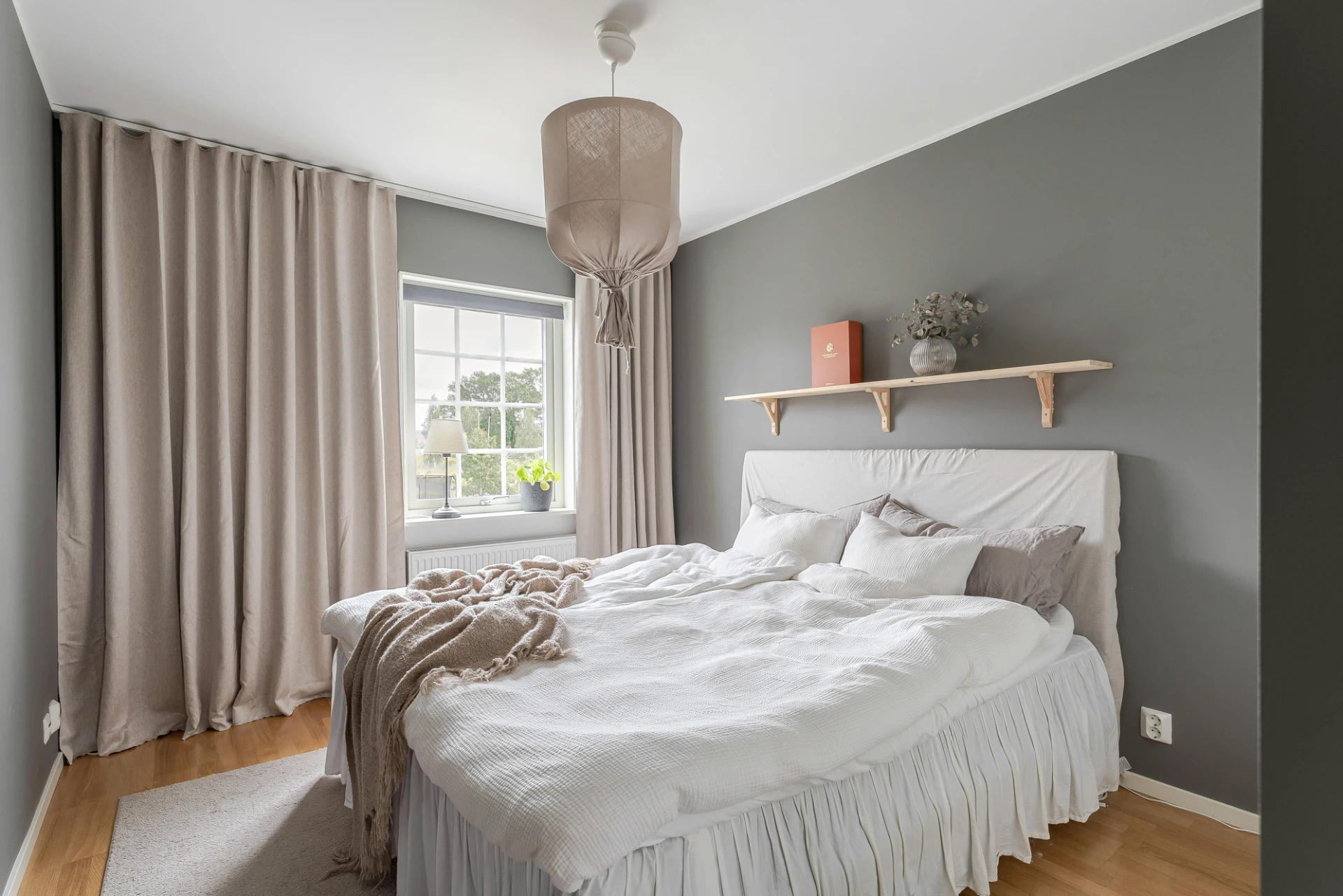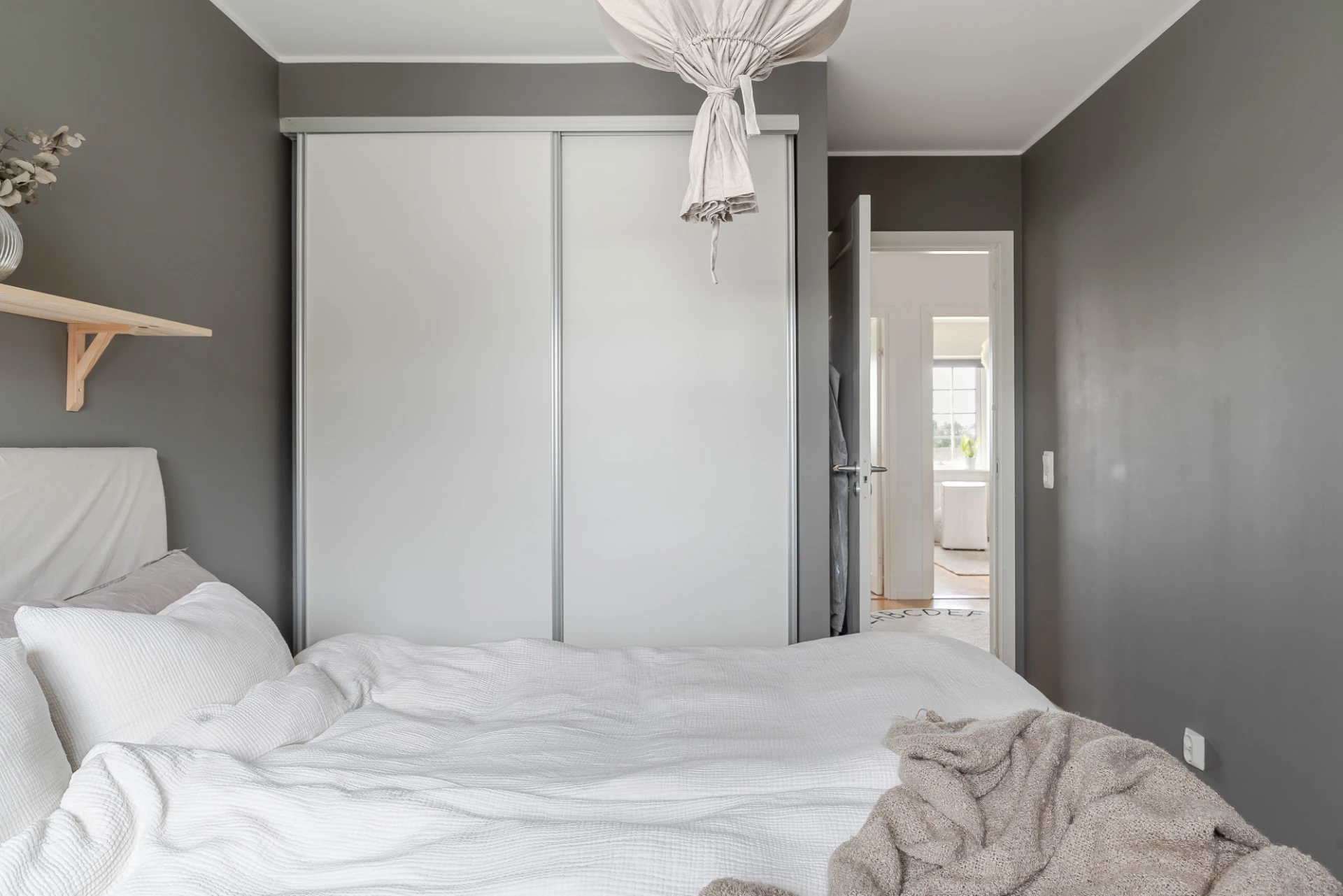 Målade väggar och parkettgolv. Plats för dubbelsäng. Garderob med skjutdörrar.