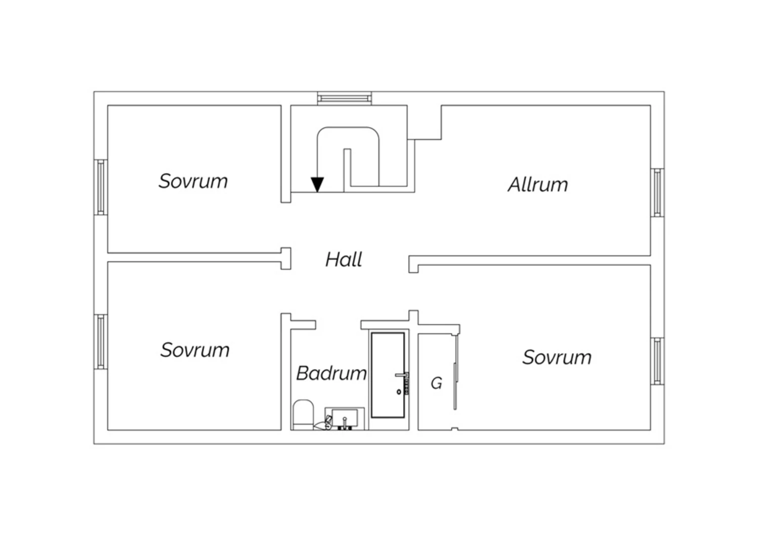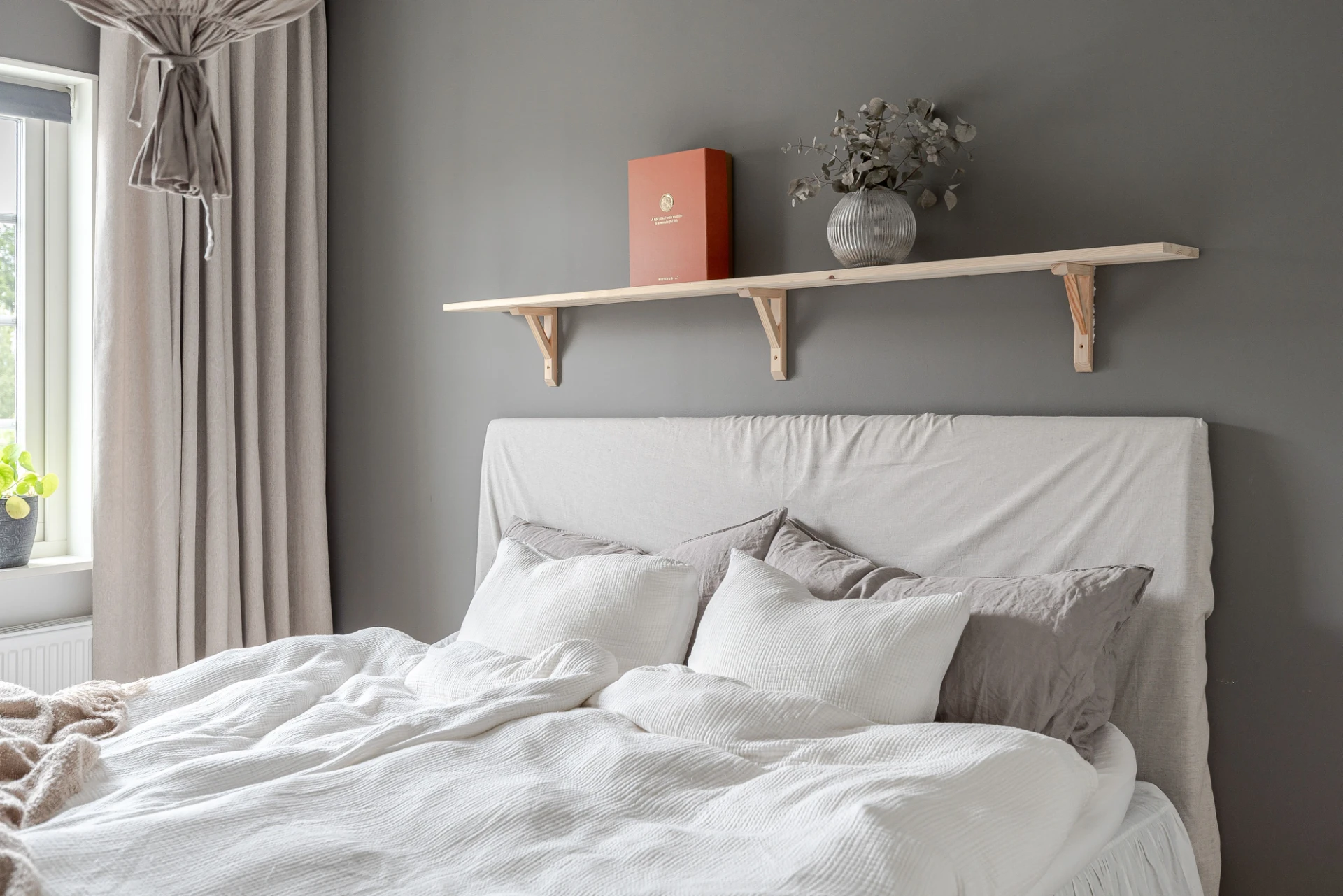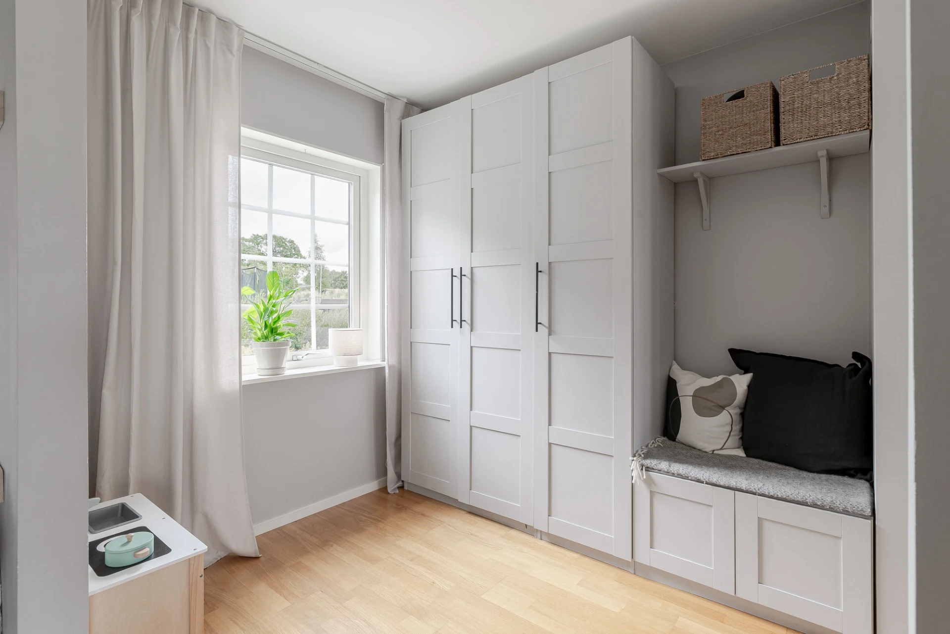 Målade väggar och parkettgolv. Plats för dubbelsäng. Garderob med skjutdörrar.