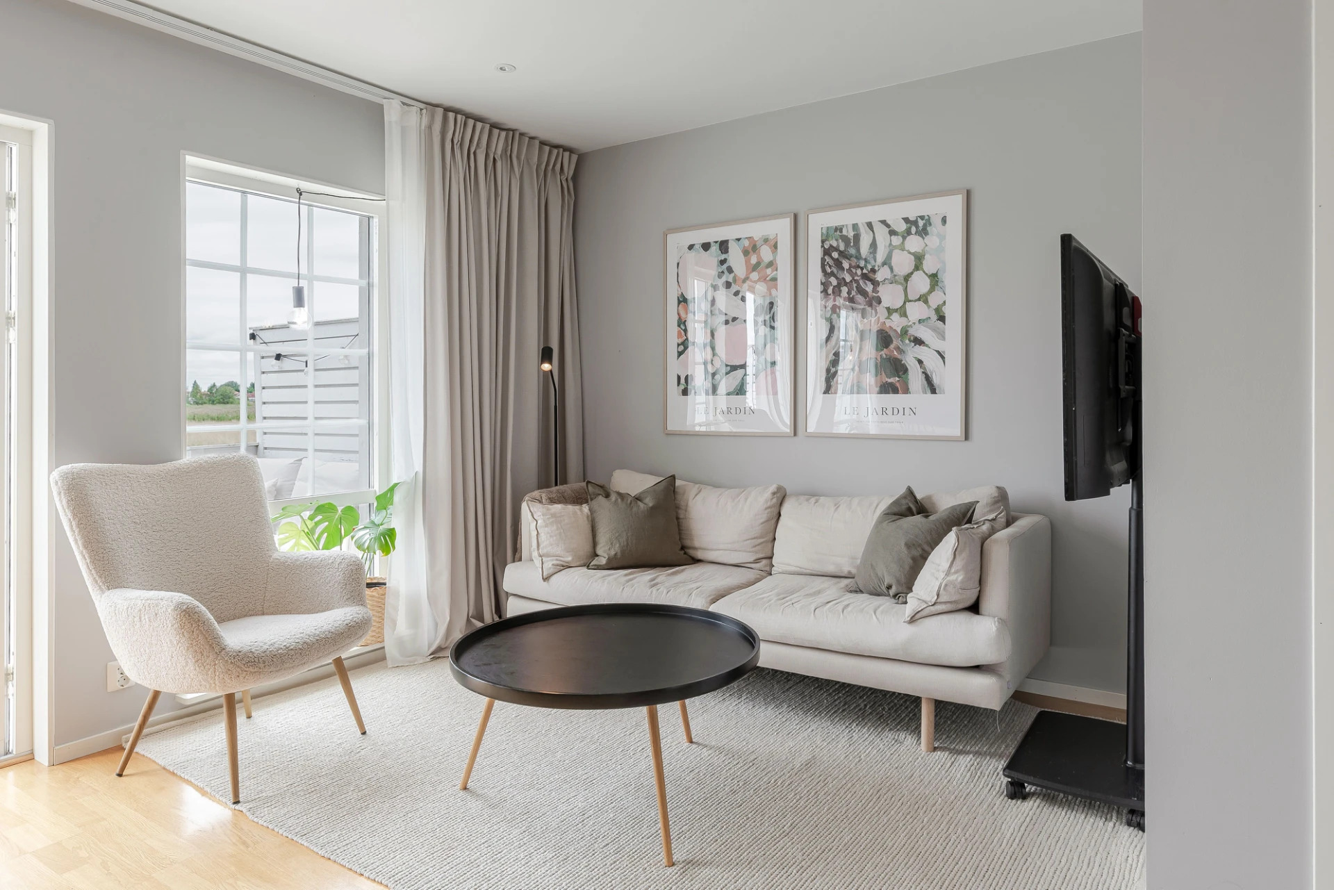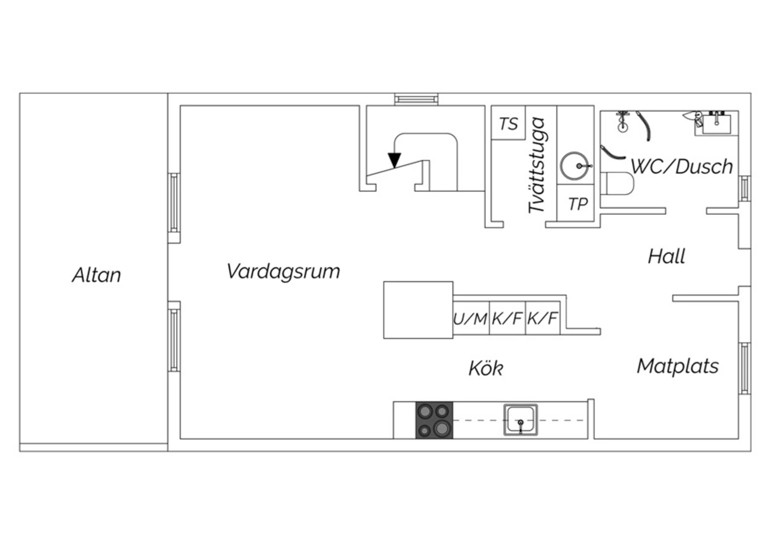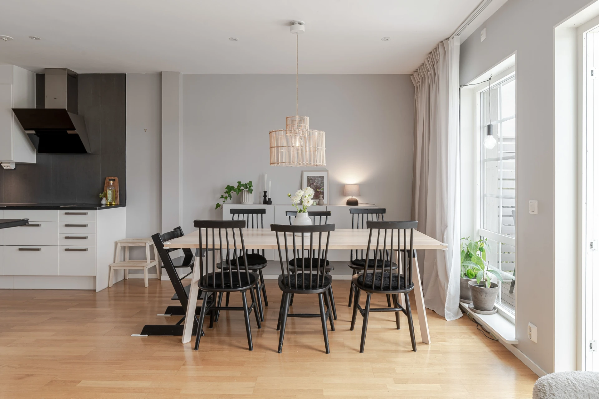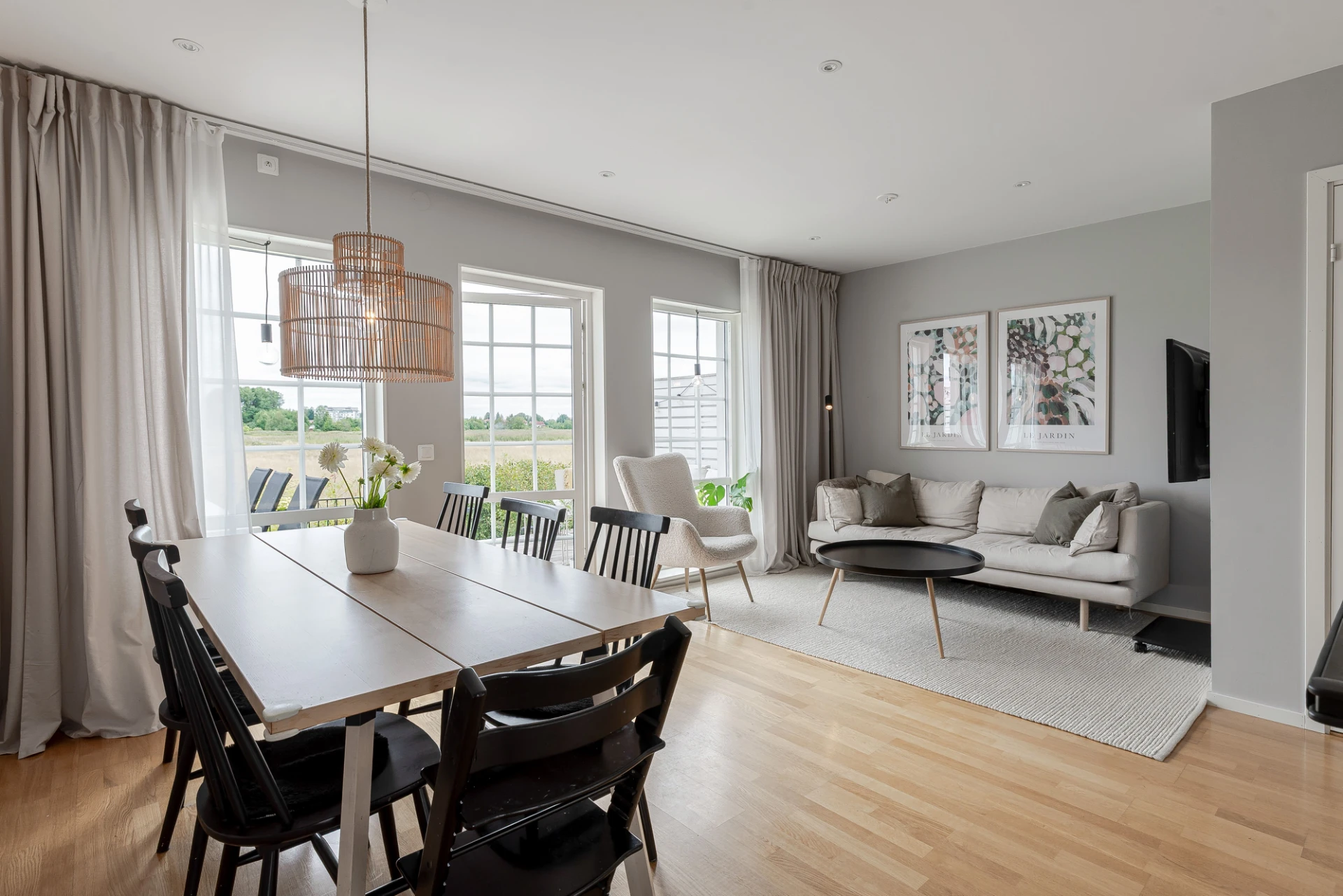 Målade väggar och parkettgolv. Utgång till altan. Här finns plats för både soffgrupp och matplats.