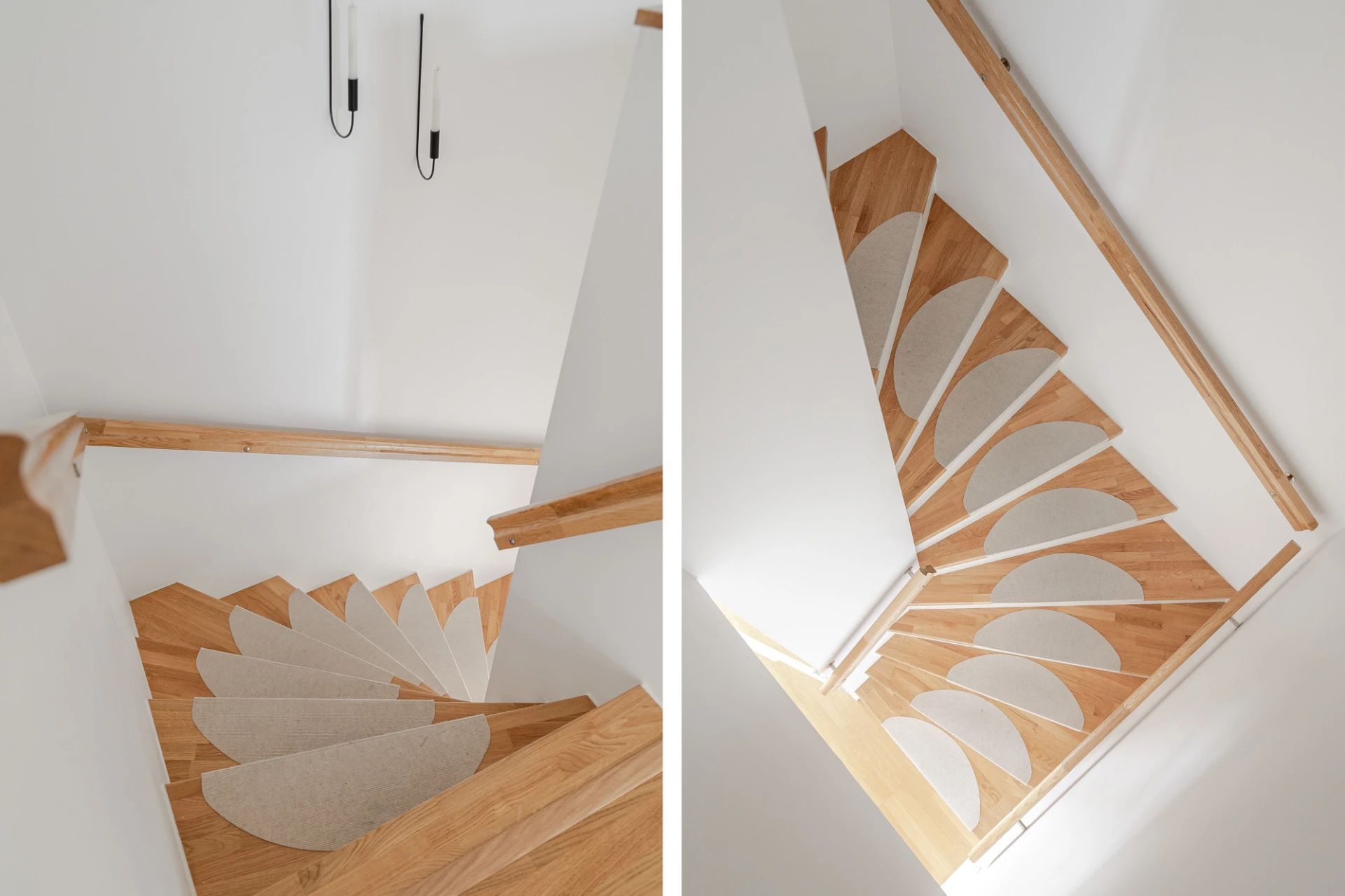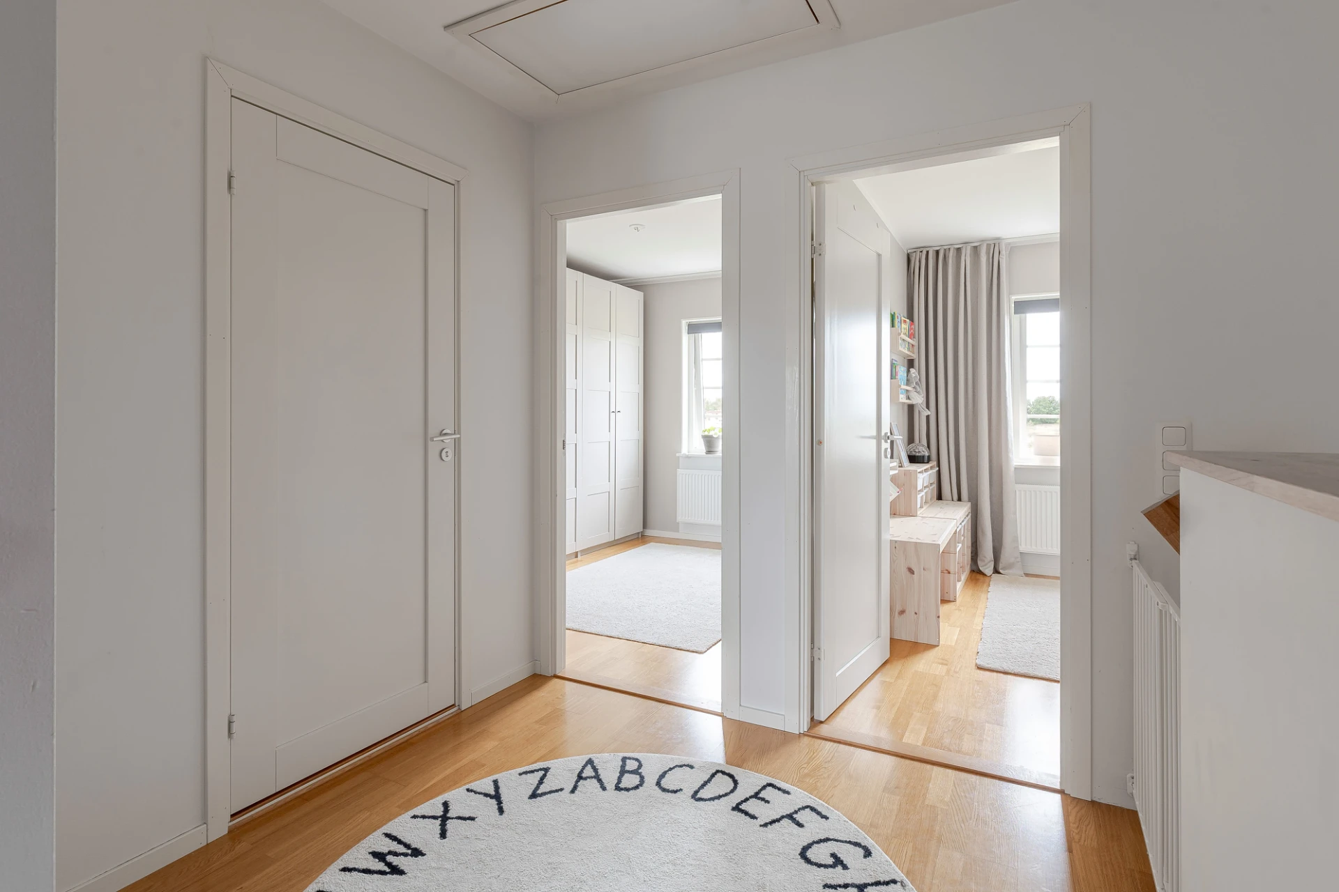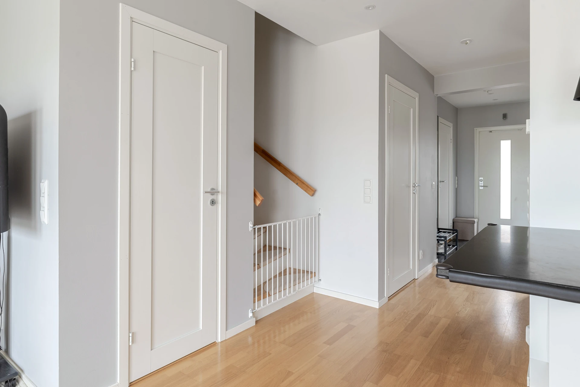 Målade väggar och parkettgolv. Under trappen så hittar du detta förråd.