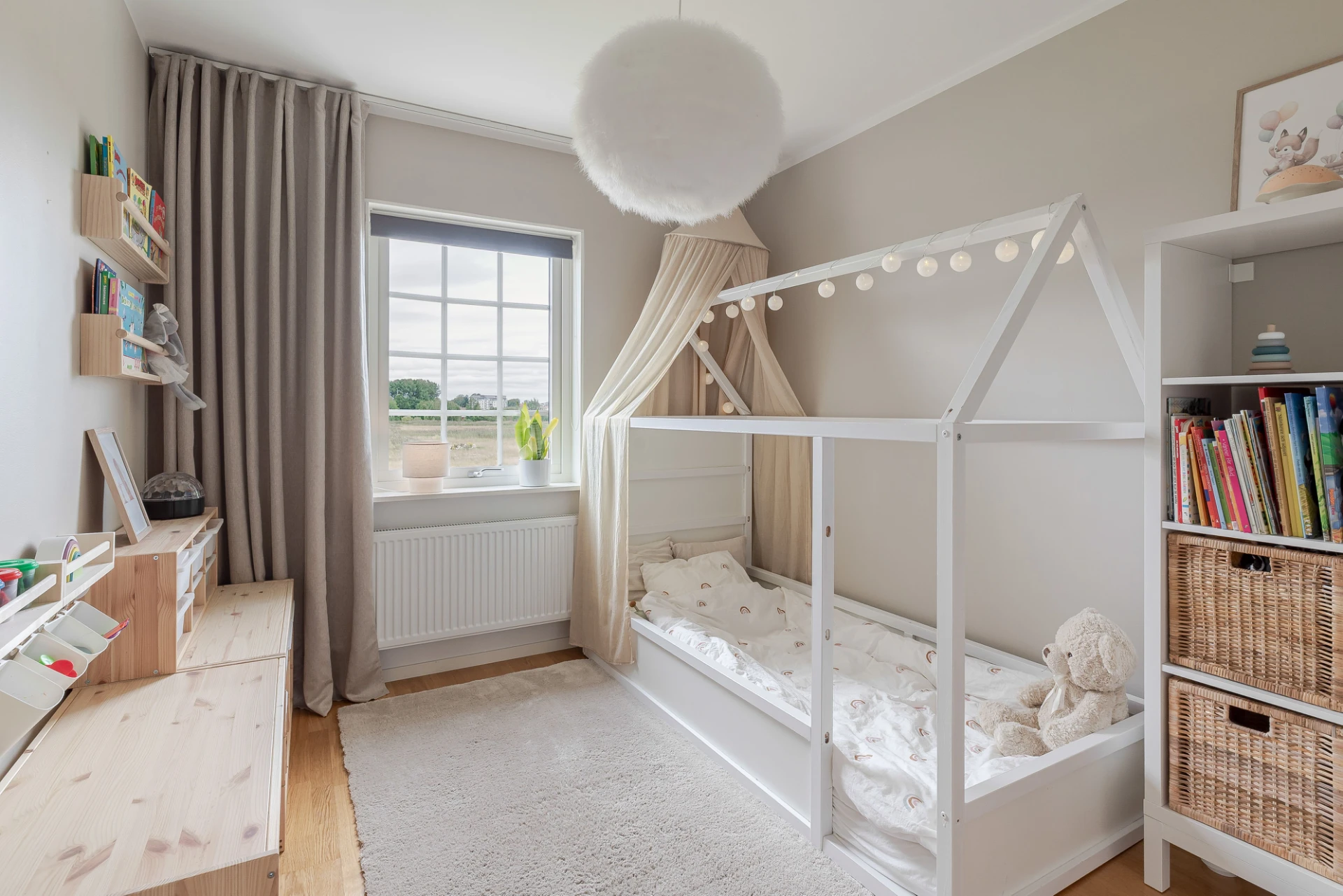 Målade väggar och parkettgolv. Plats för enkelsäng och liten arbetshörna.