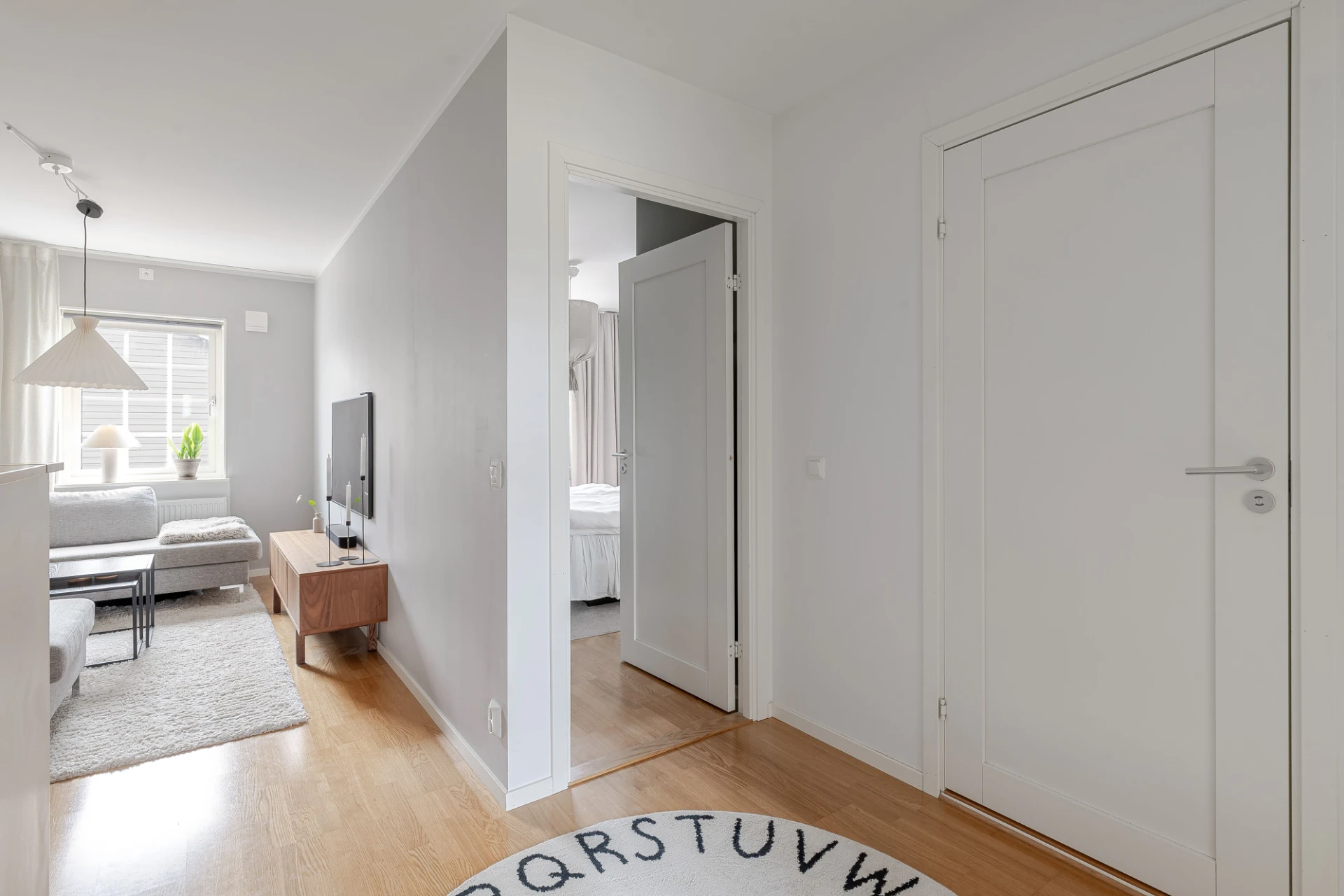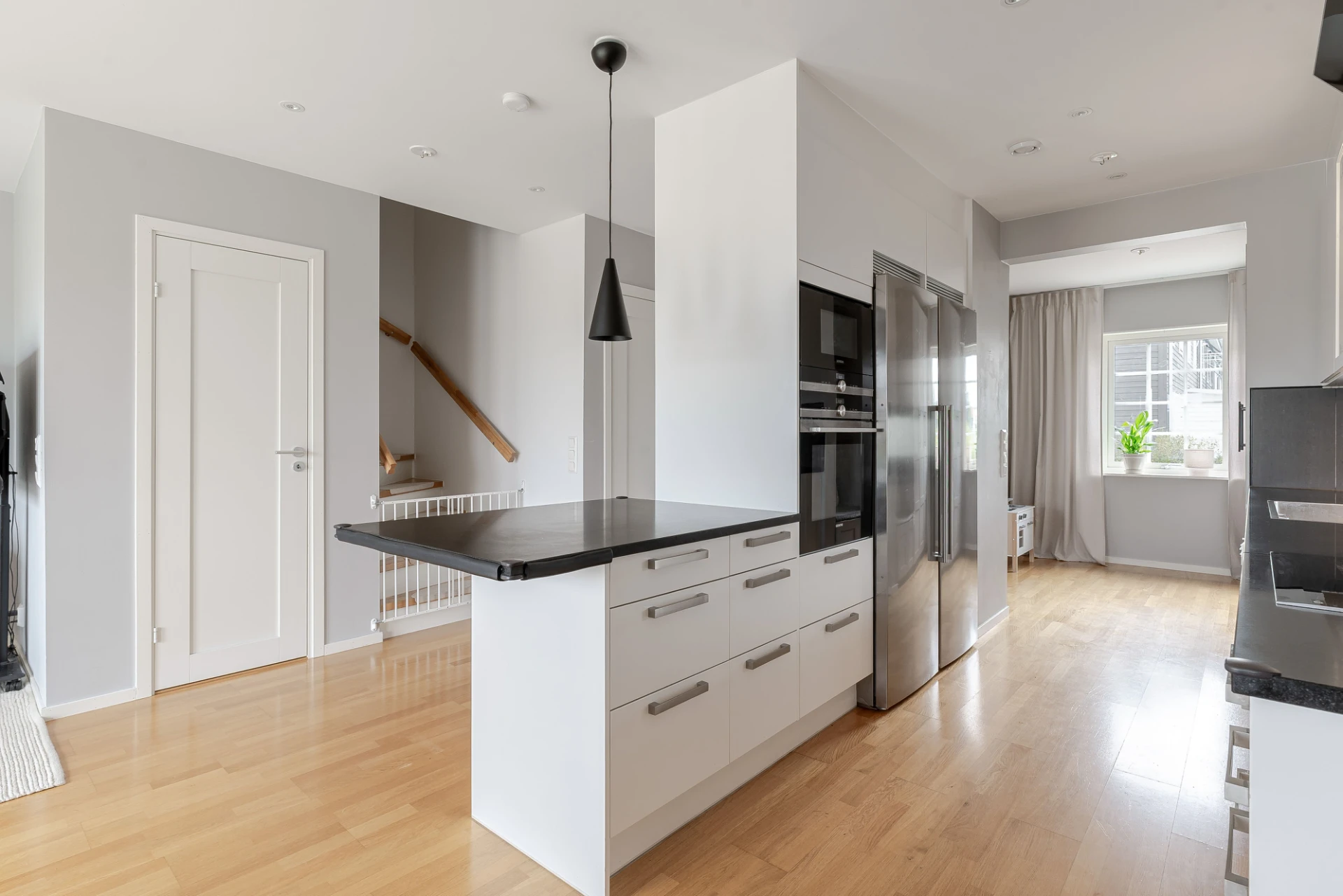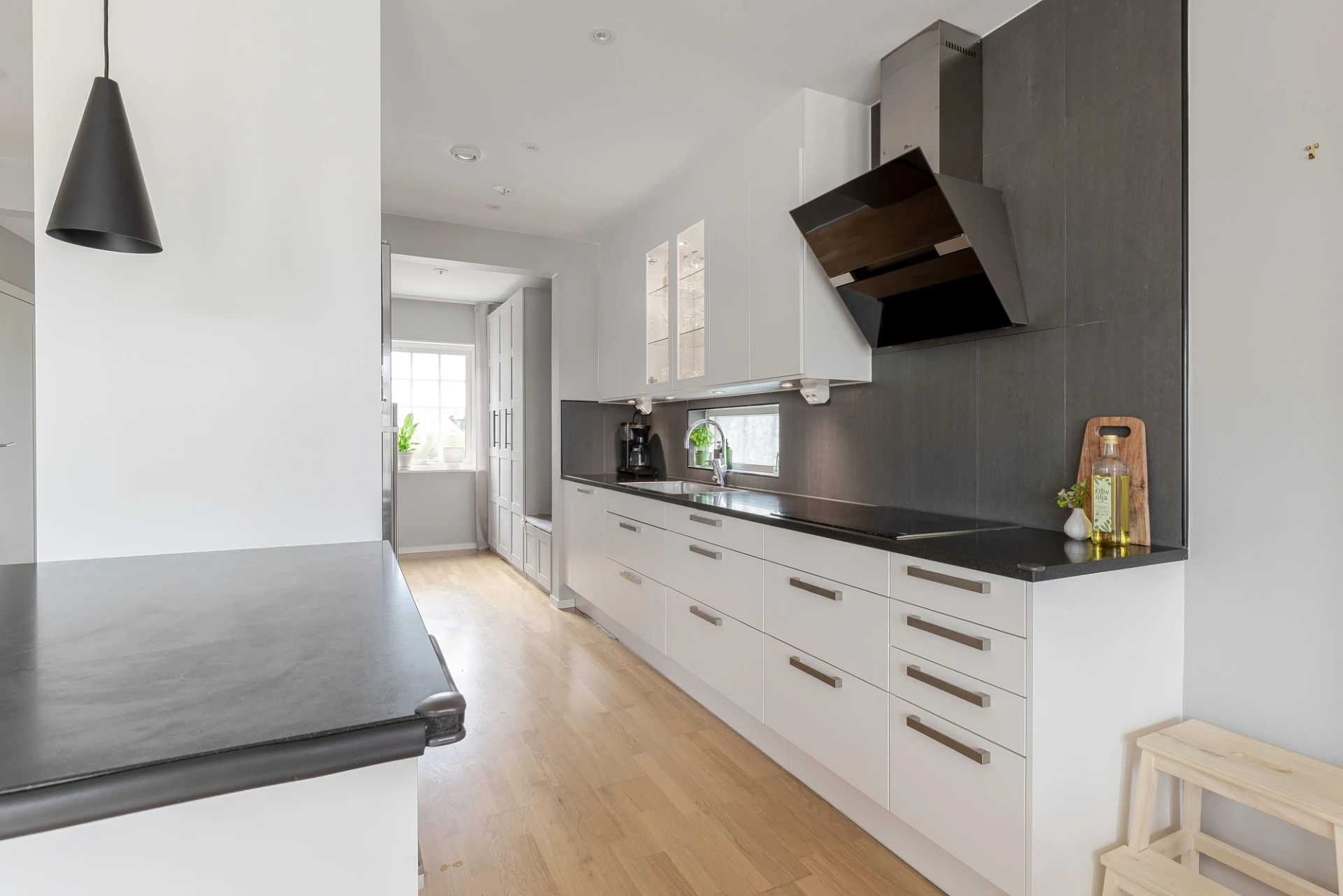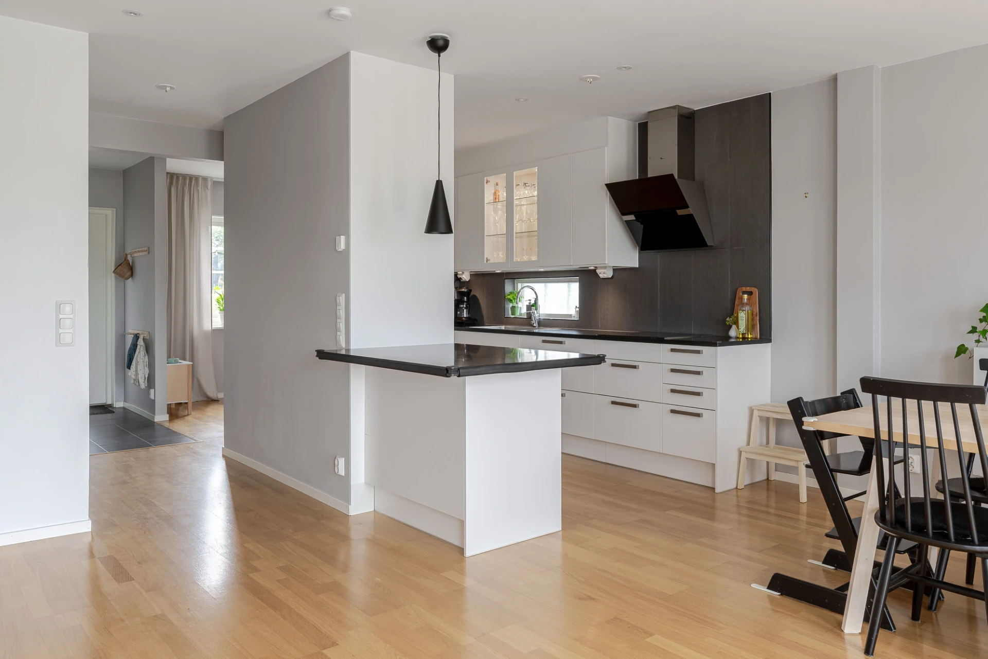 Målade väggar och parkettgolv. Kök i hög kvalitet från HTH, ljust kakel ovan bänk som möter den moderna laminatskivan Maskinell utrustning i form av induktionshäll, spisfläkt, integrerad diskmaskin, kyl/frys samt inbyggnadsugn och mikrovågsugn i högskåp. Spotlights under överskåp samt i taket. Samtliga vitvaror från 2016 Siemens.