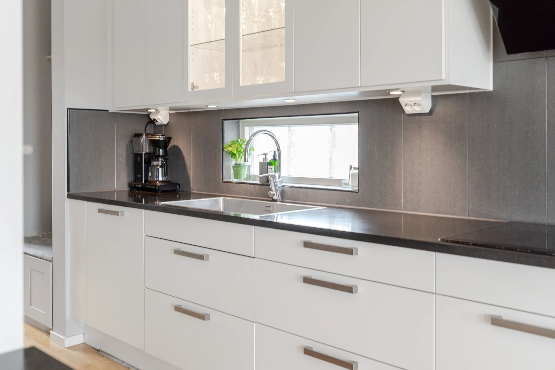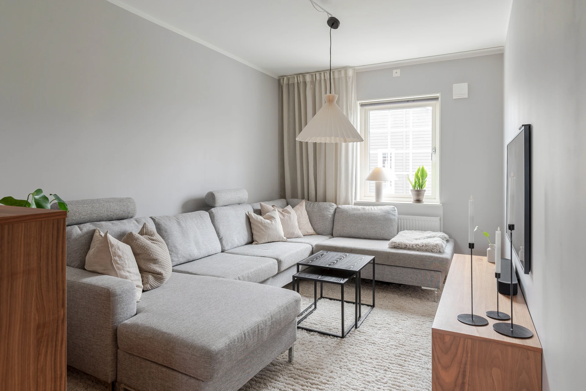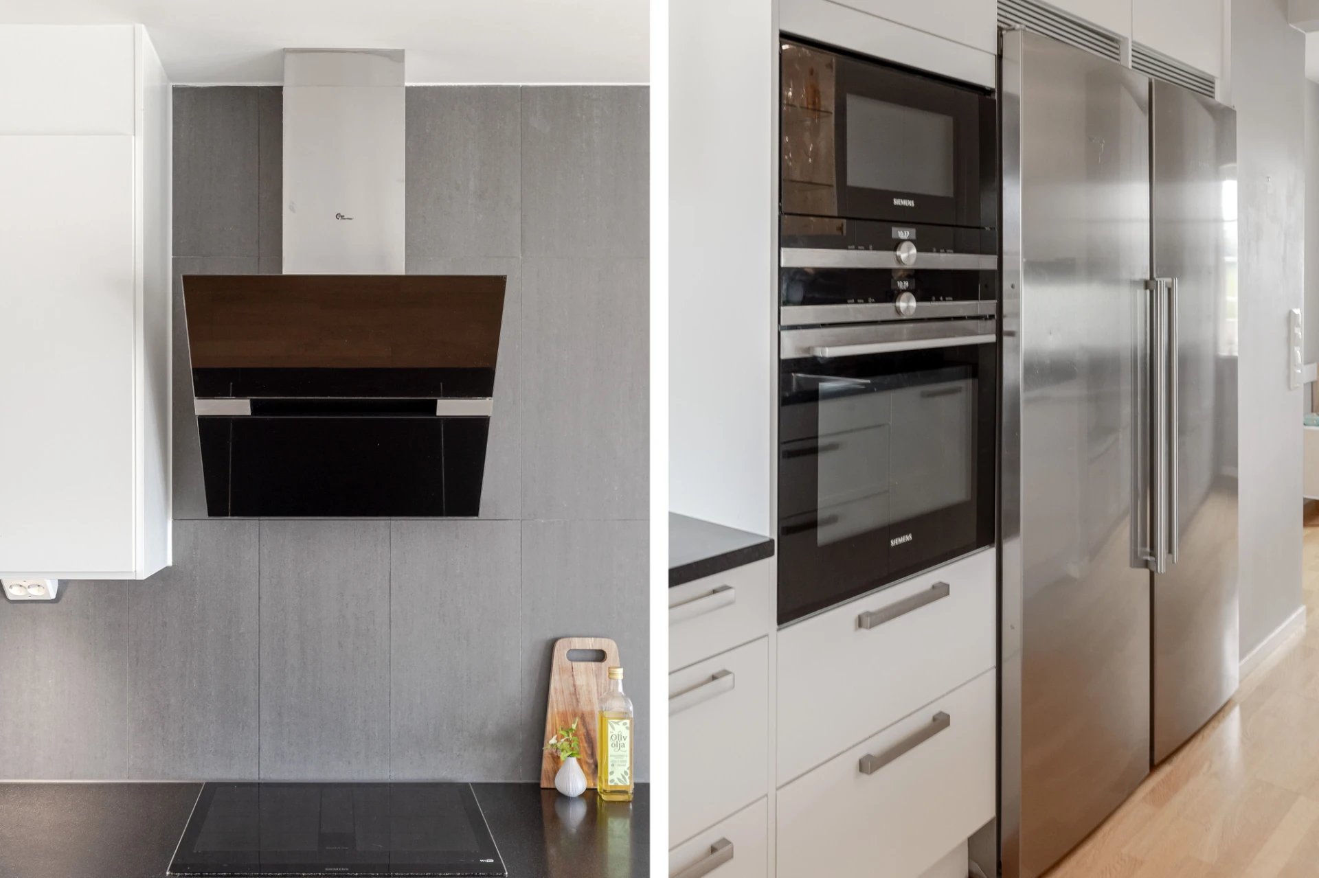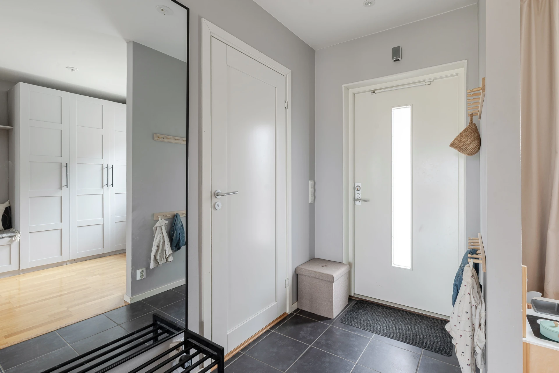 Målade väggar och parkettgolv. Kök i hög kvalitet från HTH, ljust kakel ovan bänk som möter den moderna laminatskivan Maskinell utrustning i form av induktionshäll, spisfläkt, integrerad diskmaskin, kyl/frys samt inbyggnadsugn och mikrovågsugn i högskåp. Spotlights under överskåp samt i taket. Samtliga vitvaror från 2016 Siemens.