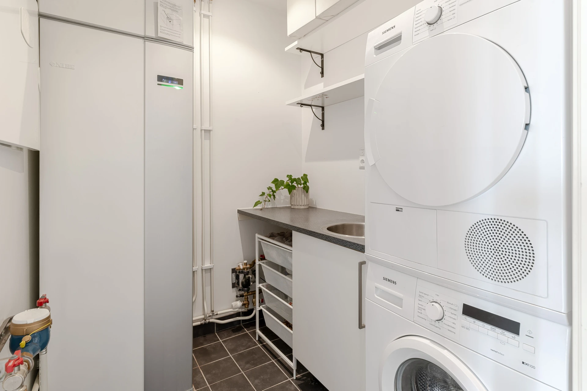 Målade väggar och klinkergolv. Här finns arbetsbänk med tvättho, förvaringsskåp, tvättmaskin och torktumlare.