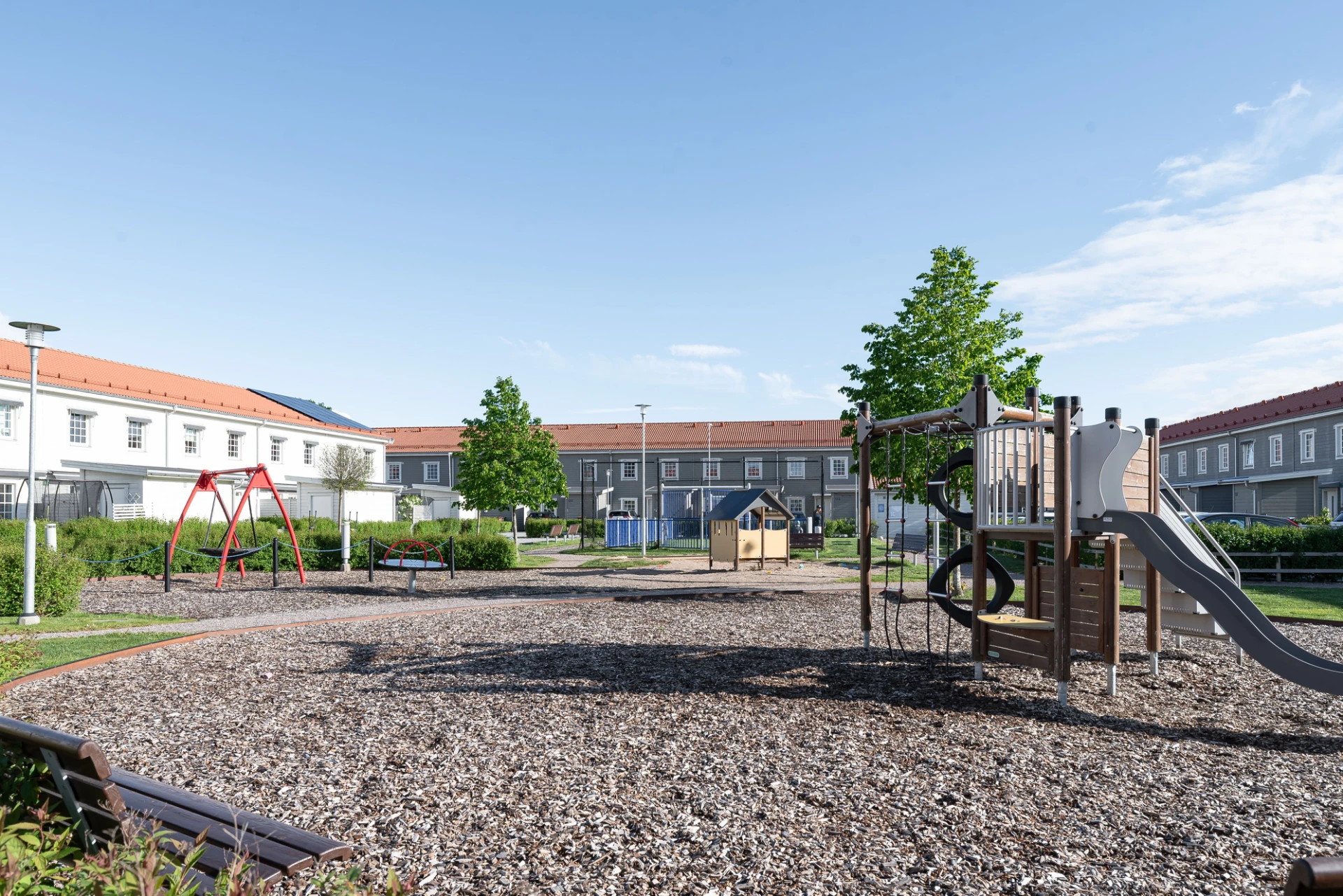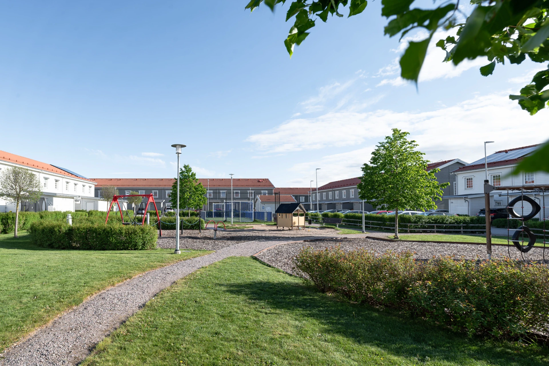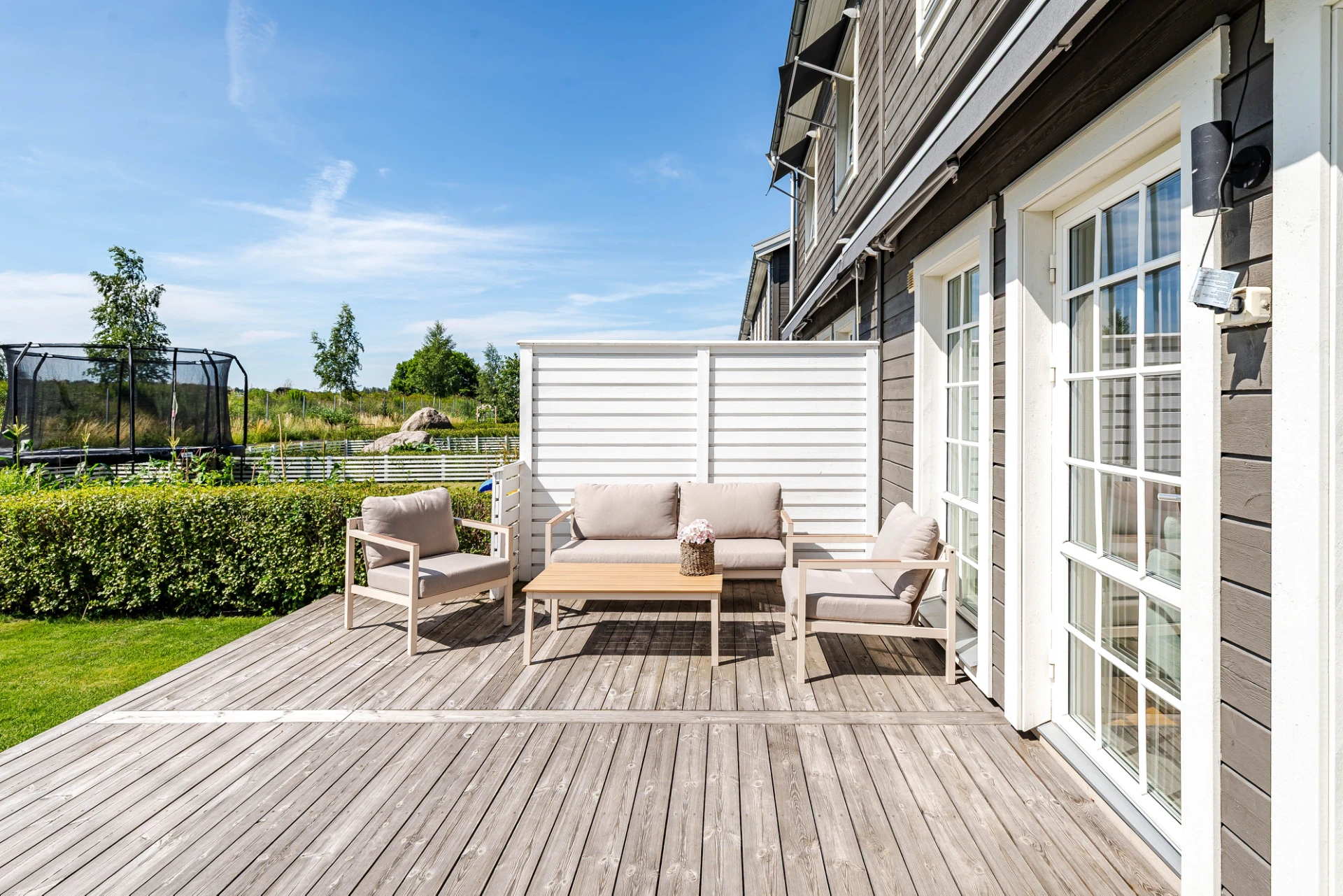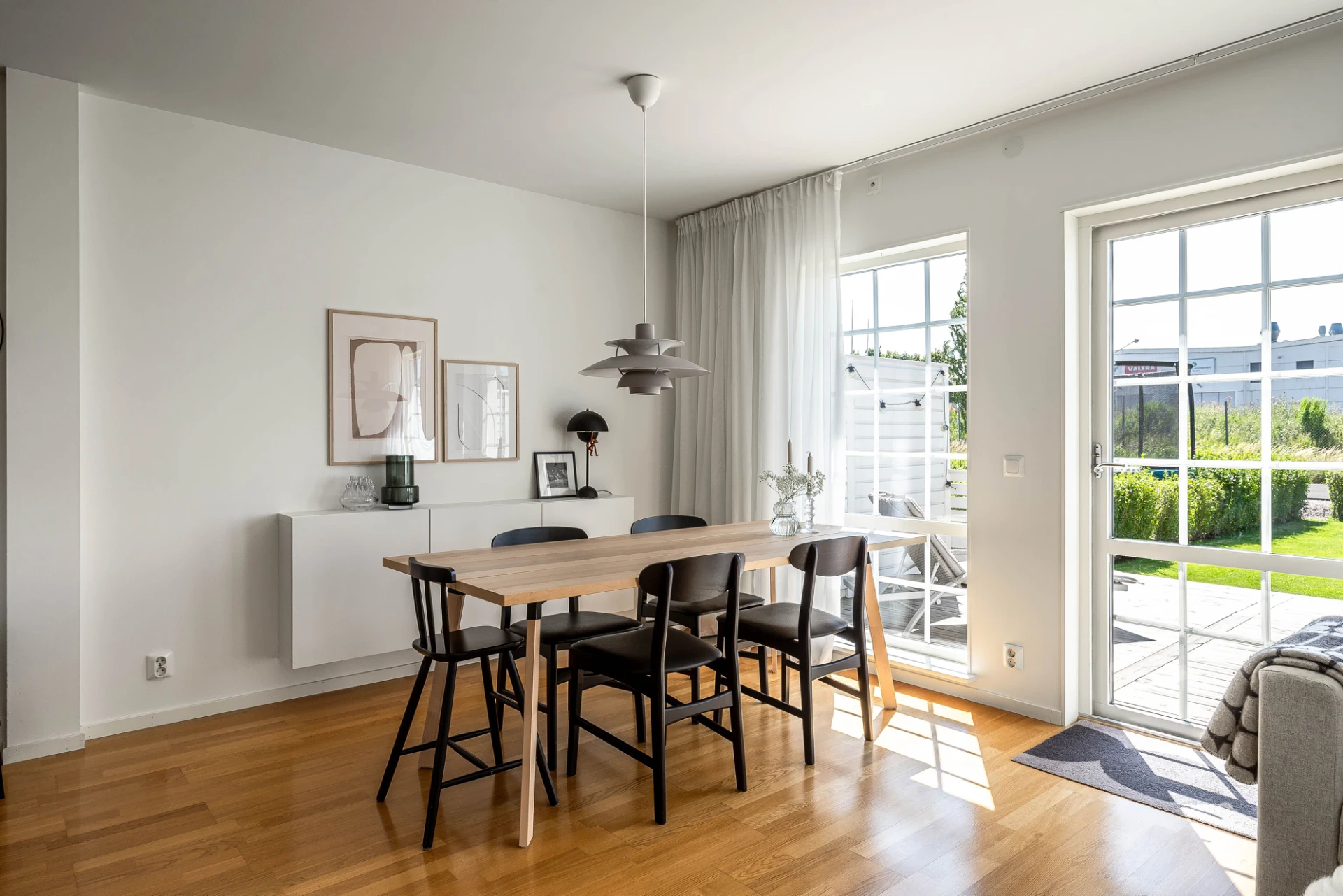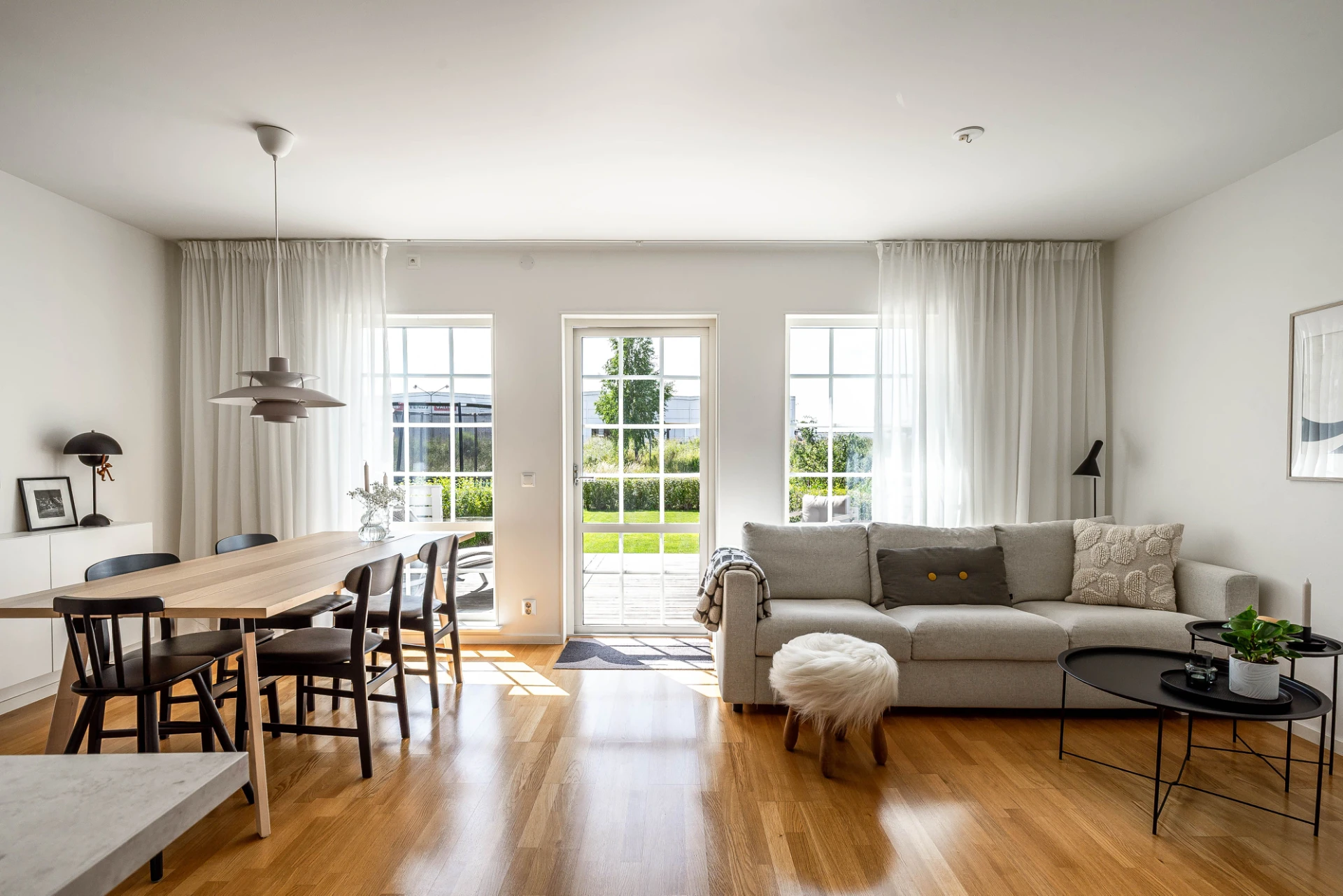 Ljust och luftigt vardagsrum med parkettgolv och målade väggar. Rummet har en öppen planlösning mot köket vilket skapar en social och inbjudande atmosfär. Här finns gott om plats för både matplats och soffgrupp. Från vardagsrummet nås även uteplatsen.