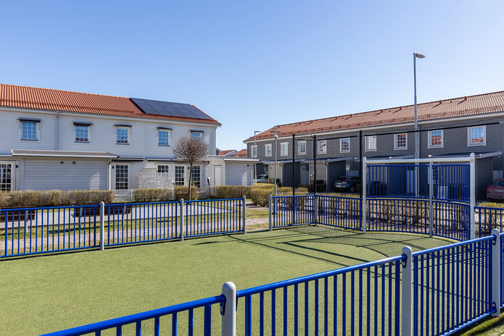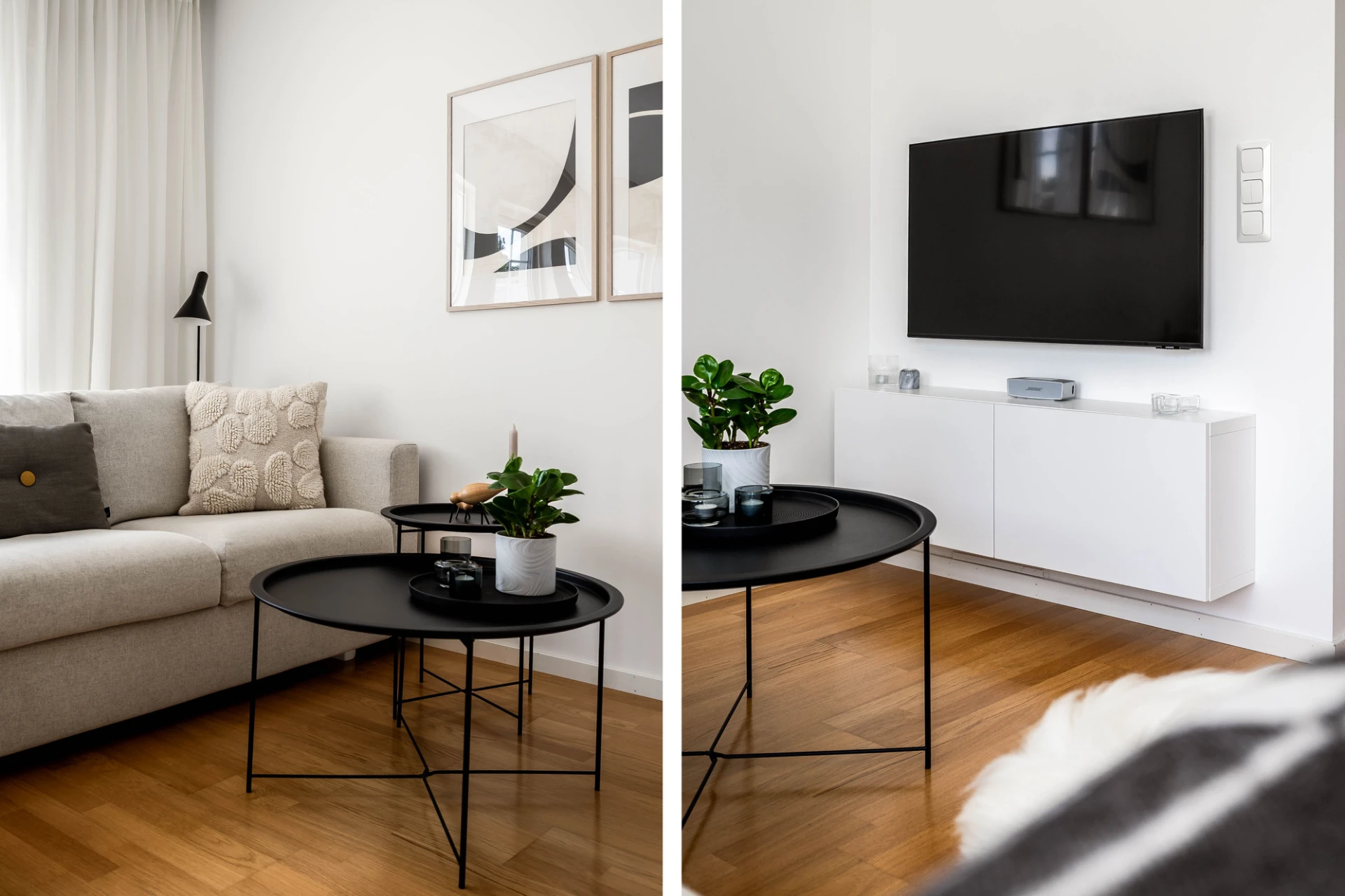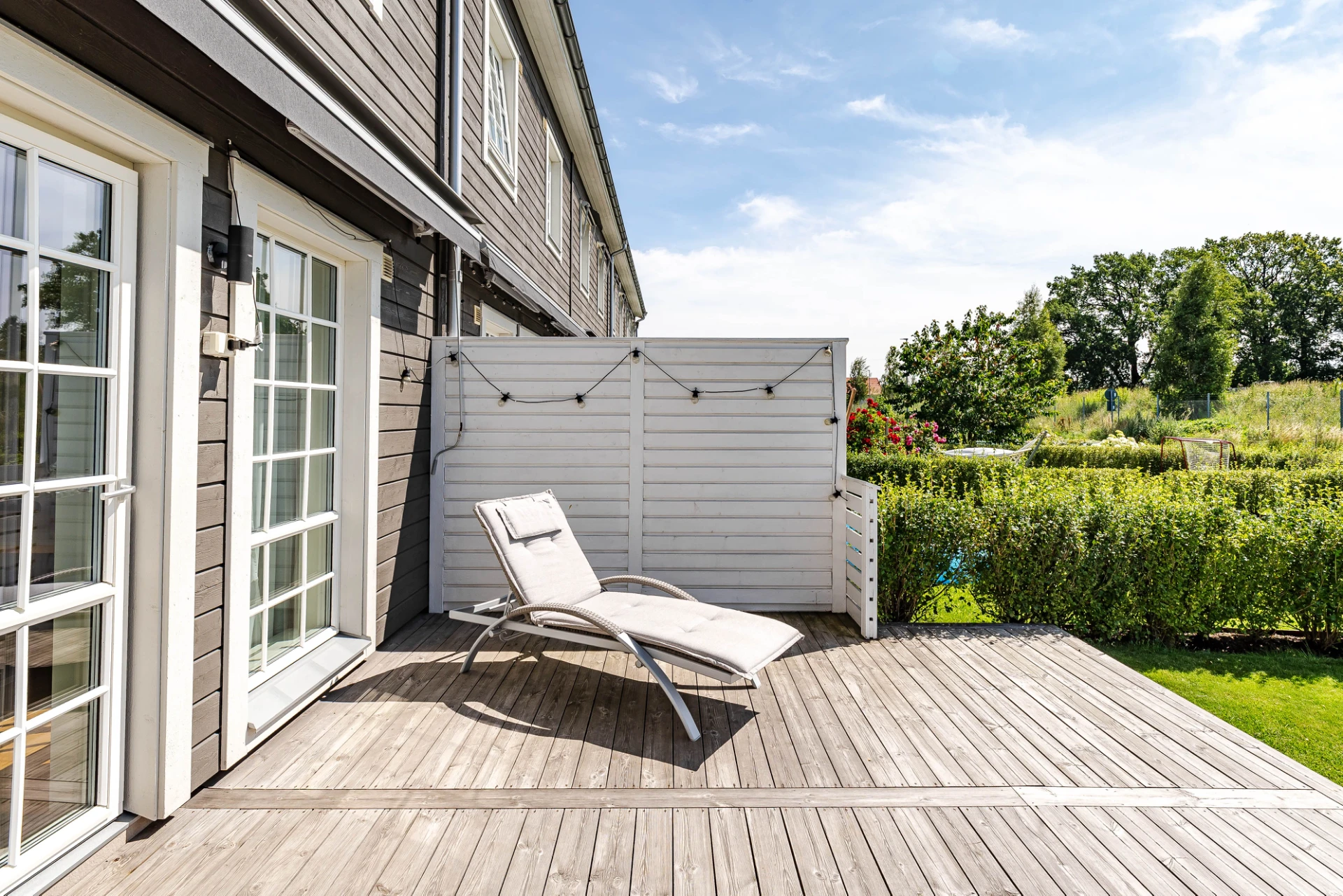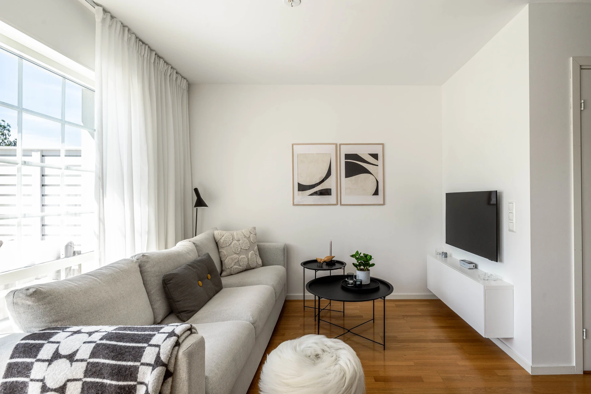 Ljust och luftigt vardagsrum med parkettgolv och målade väggar. Rummet har en öppen planlösning mot köket vilket skapar en social och inbjudande atmosfär. Här finns gott om plats för både matplats och soffgrupp. Från vardagsrummet nås även uteplatsen.