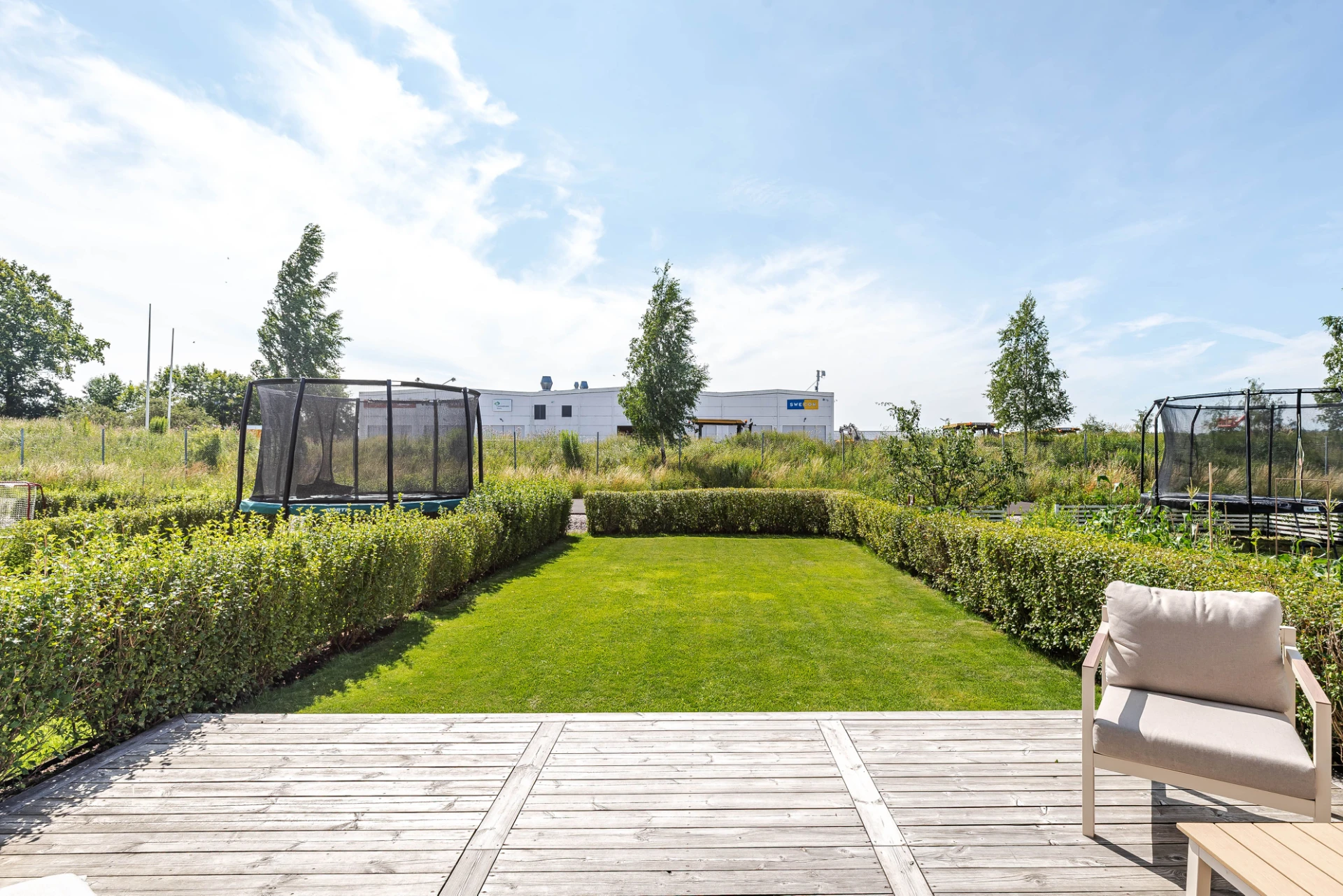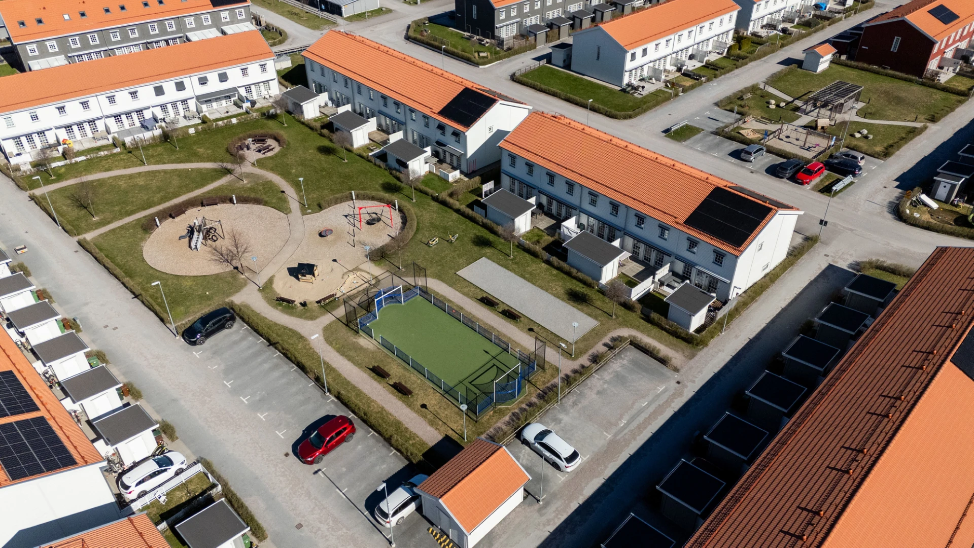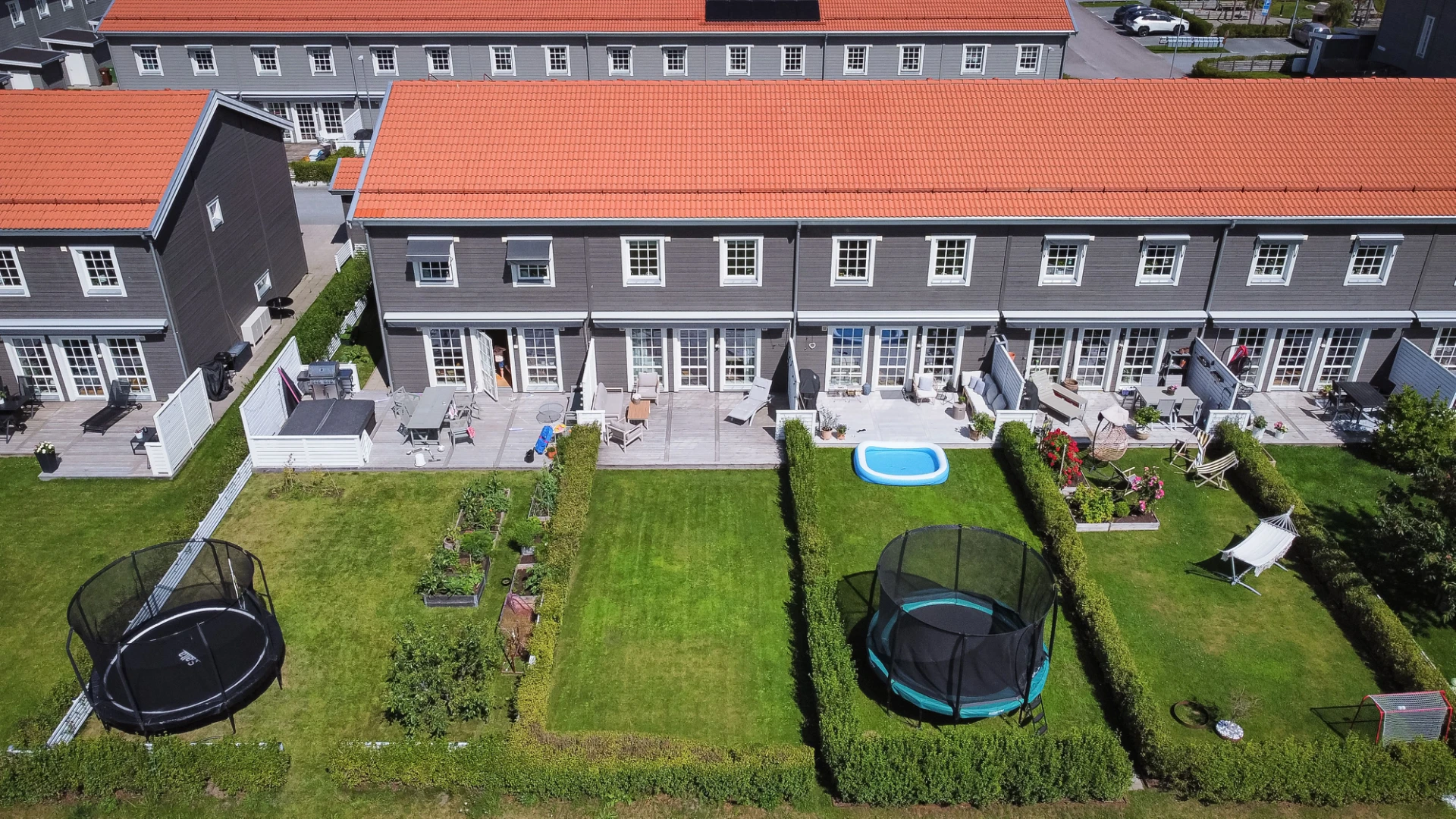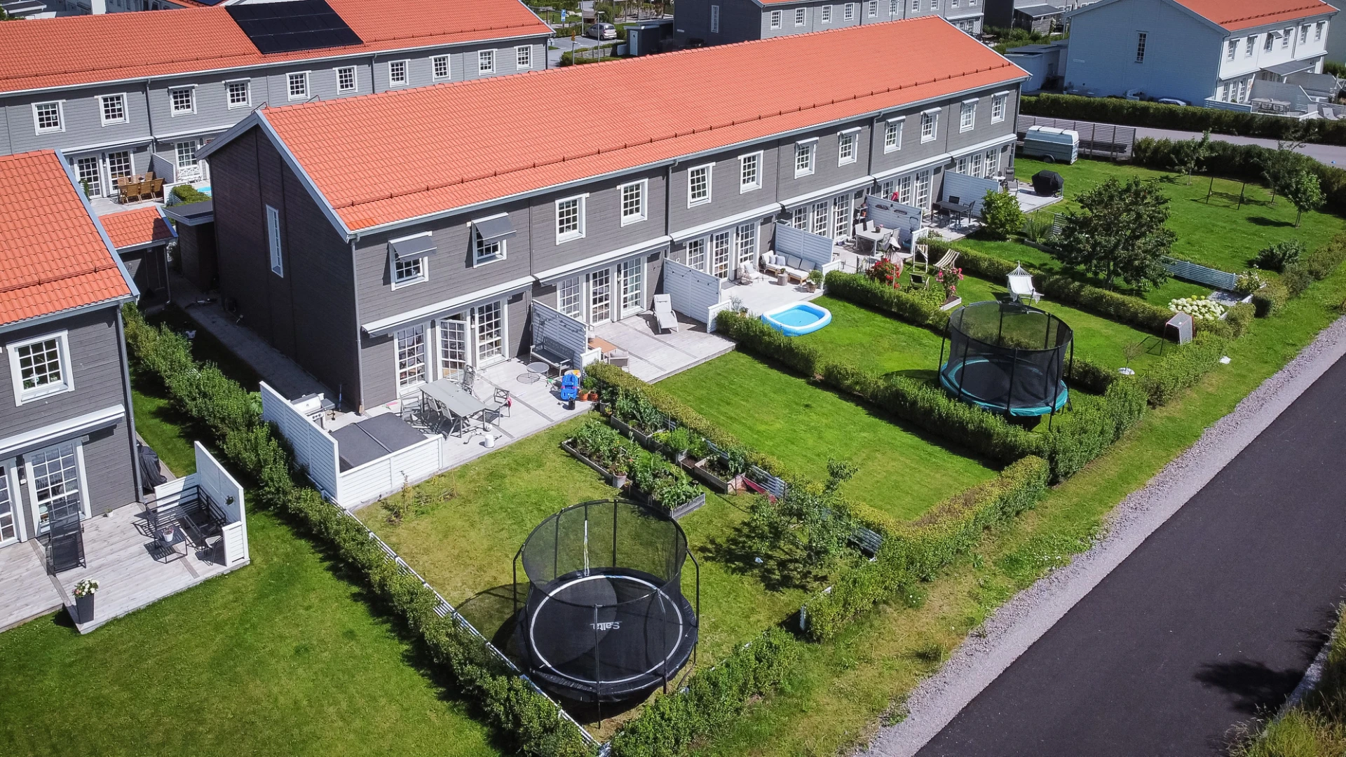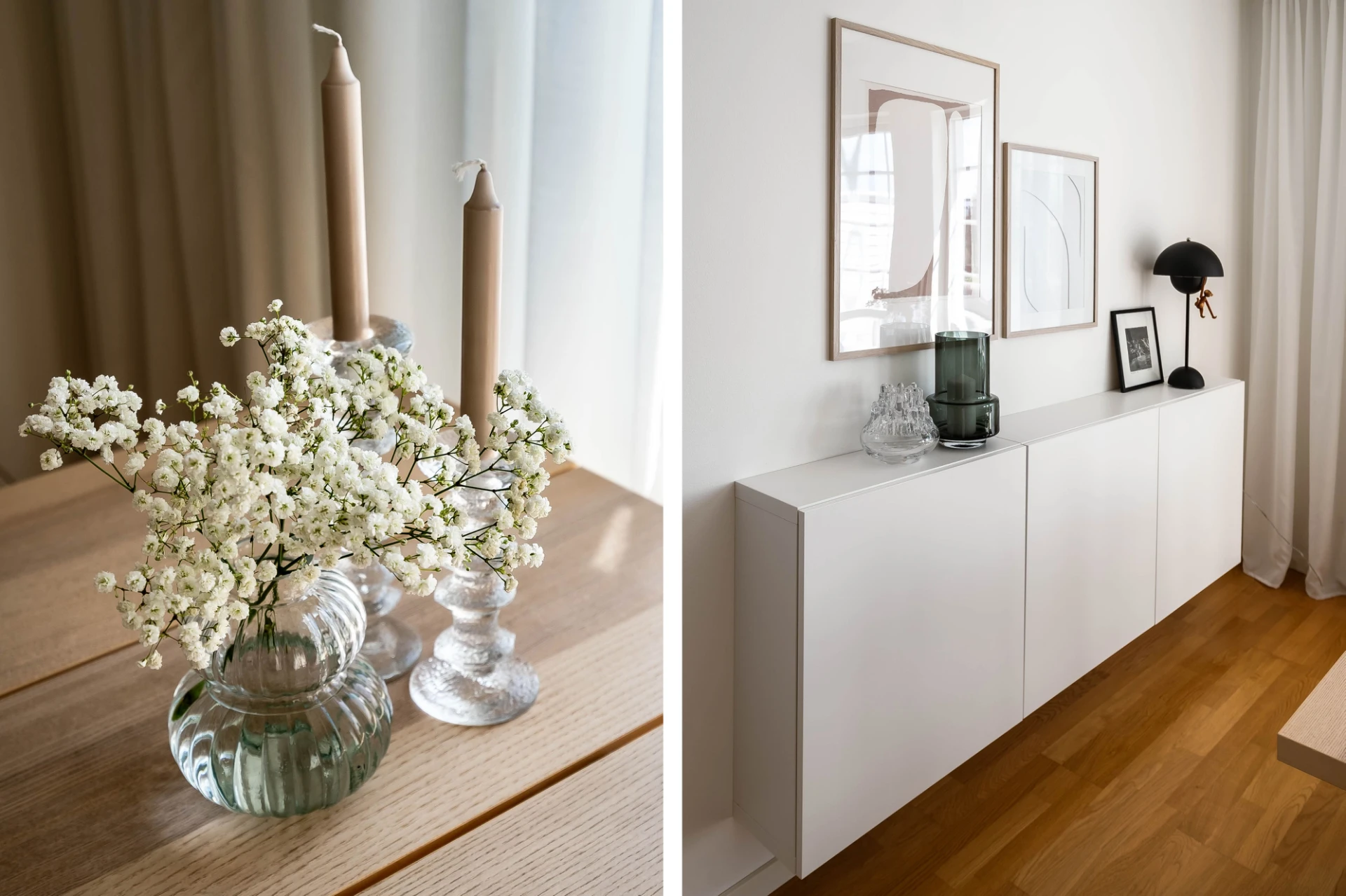Ljust och luftigt vardagsrum med parkettgolv och målade väggar. Rummet har en öppen planlösning mot köket vilket skapar en social och inbjudande atmosfär. Här finns gott om plats för både matplats och soffgrupp. Från vardagsrummet nås även uteplatsen.