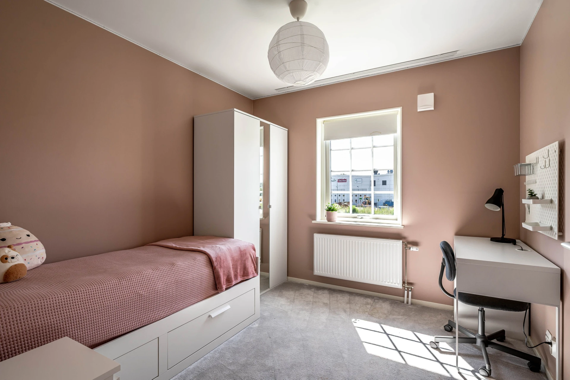 Praktiskt sovrum med parkettgolv, täckt av matta och målade väggar. Rummet erbjuder gott om plats för enkelsäng och skrivbord.