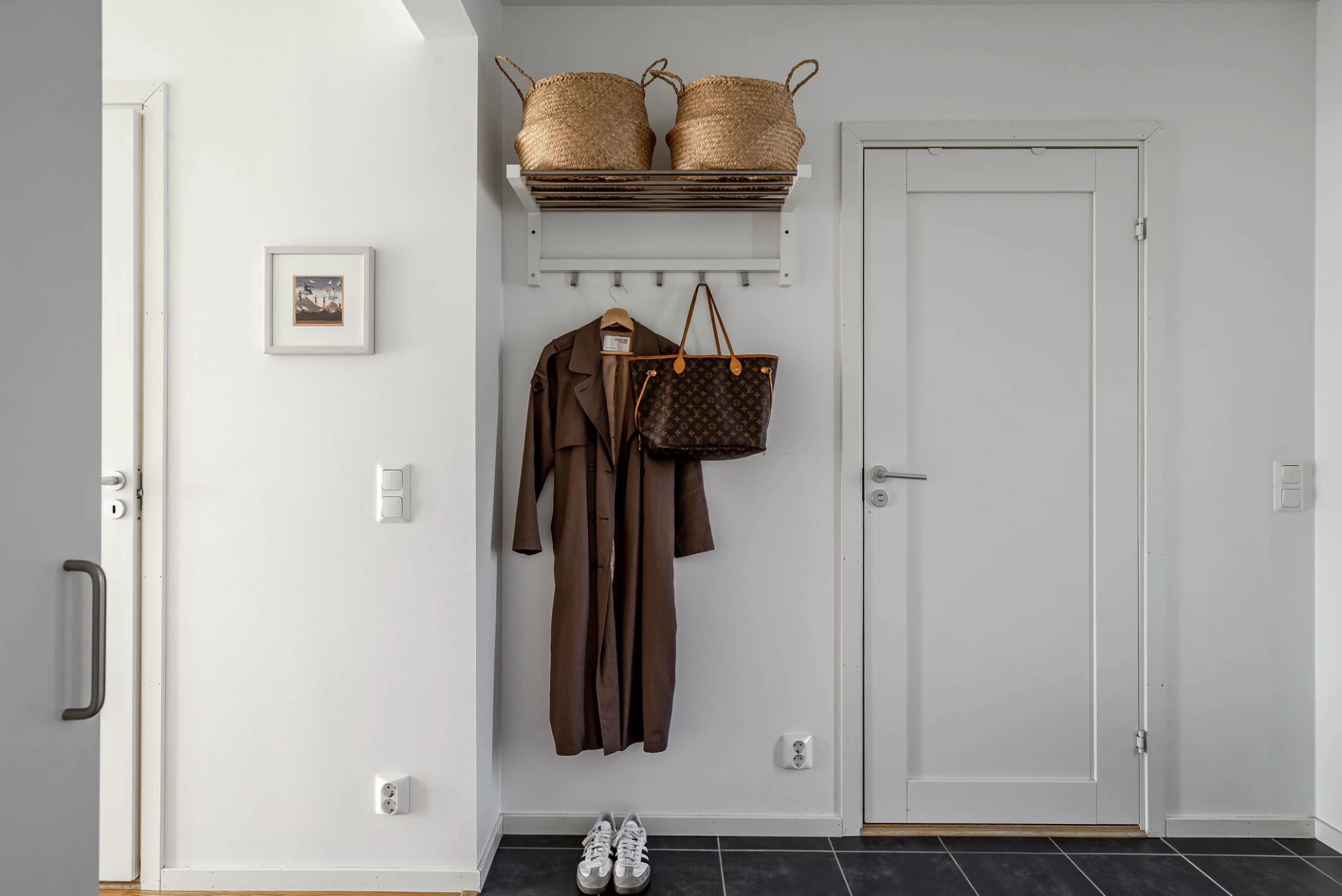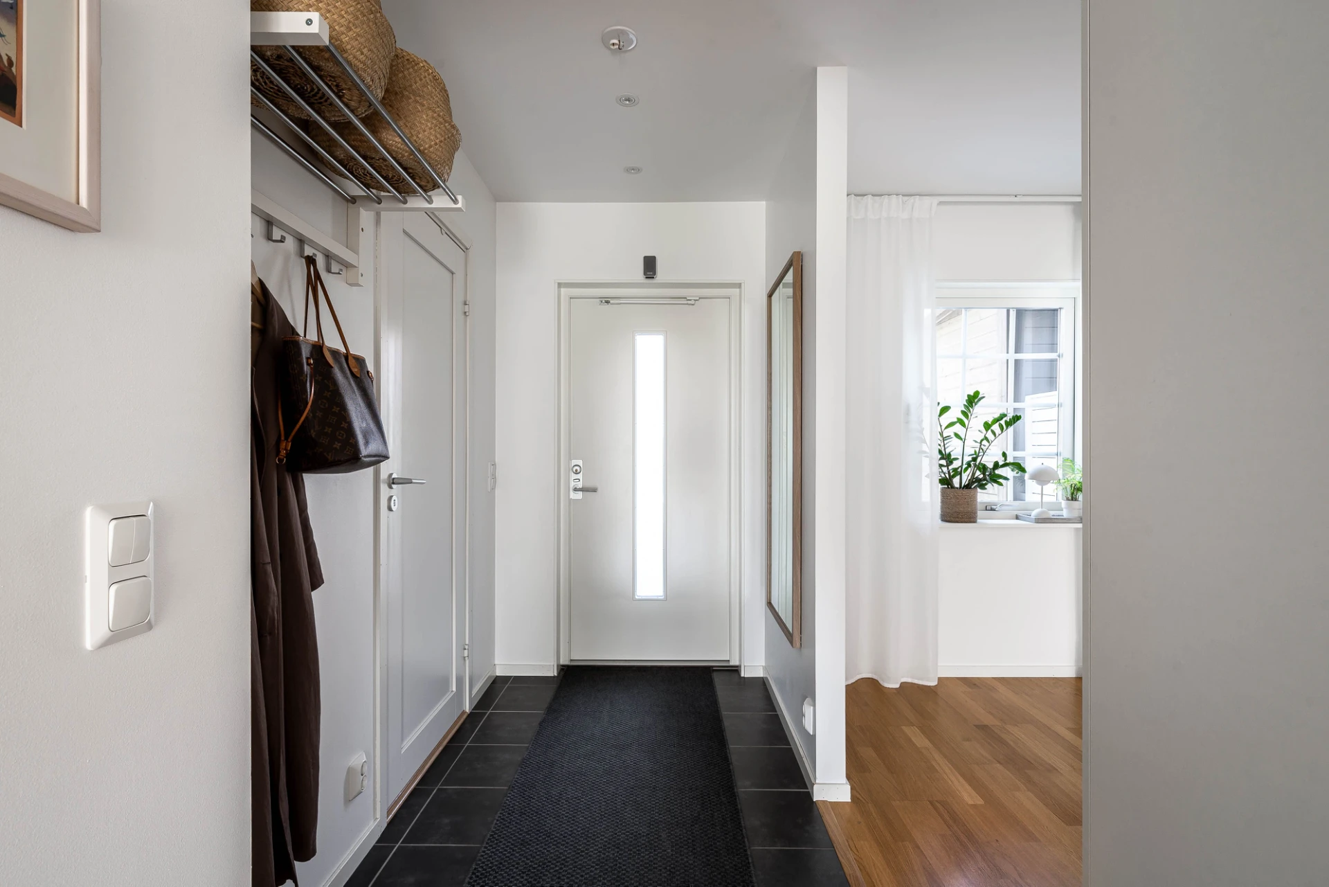 Välkomnande hall med slitstarkt klinkergolv och målade väggar i en neutral kulör. Här finns goda förvaringsmöjligheter i form av två garderober.