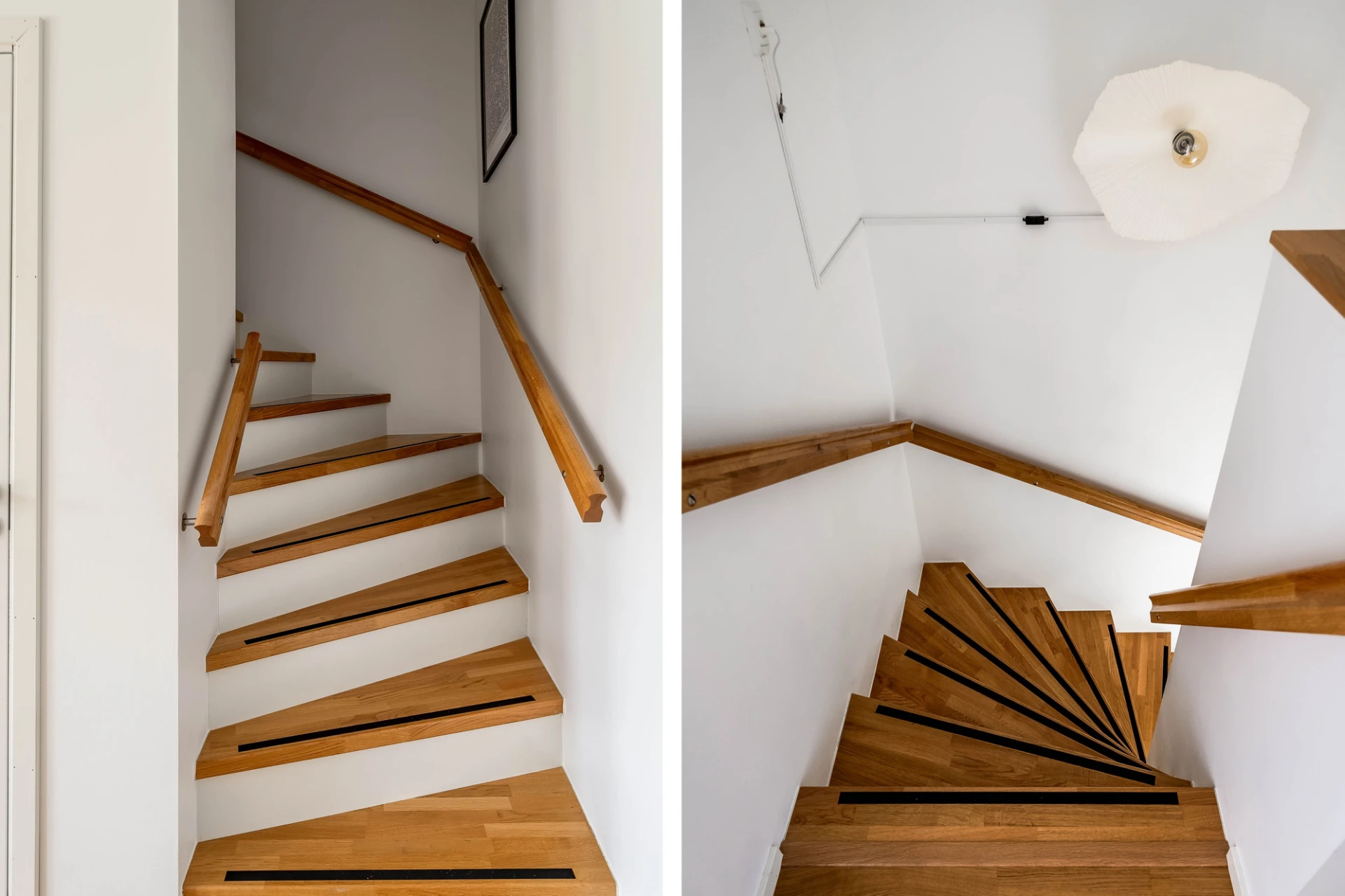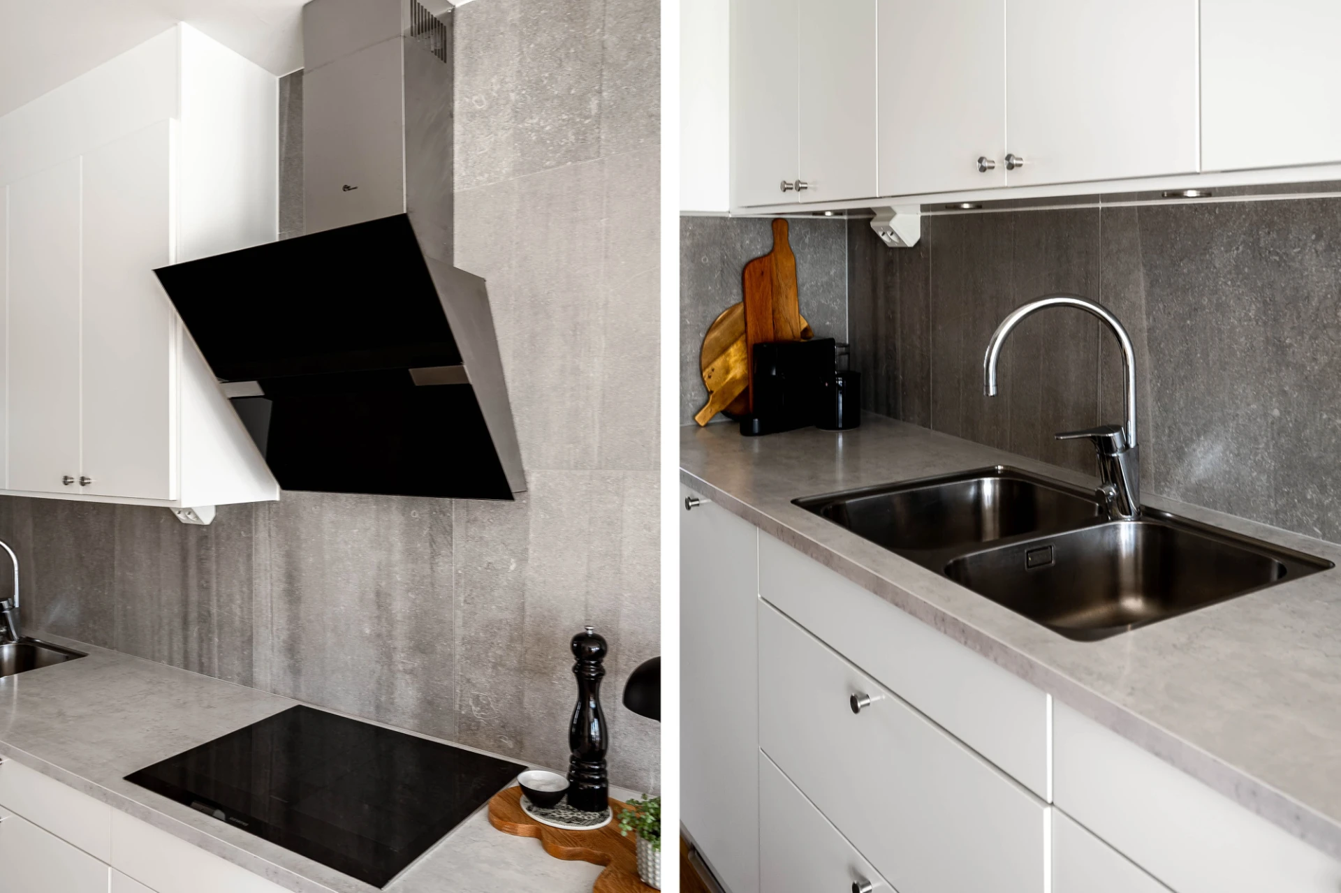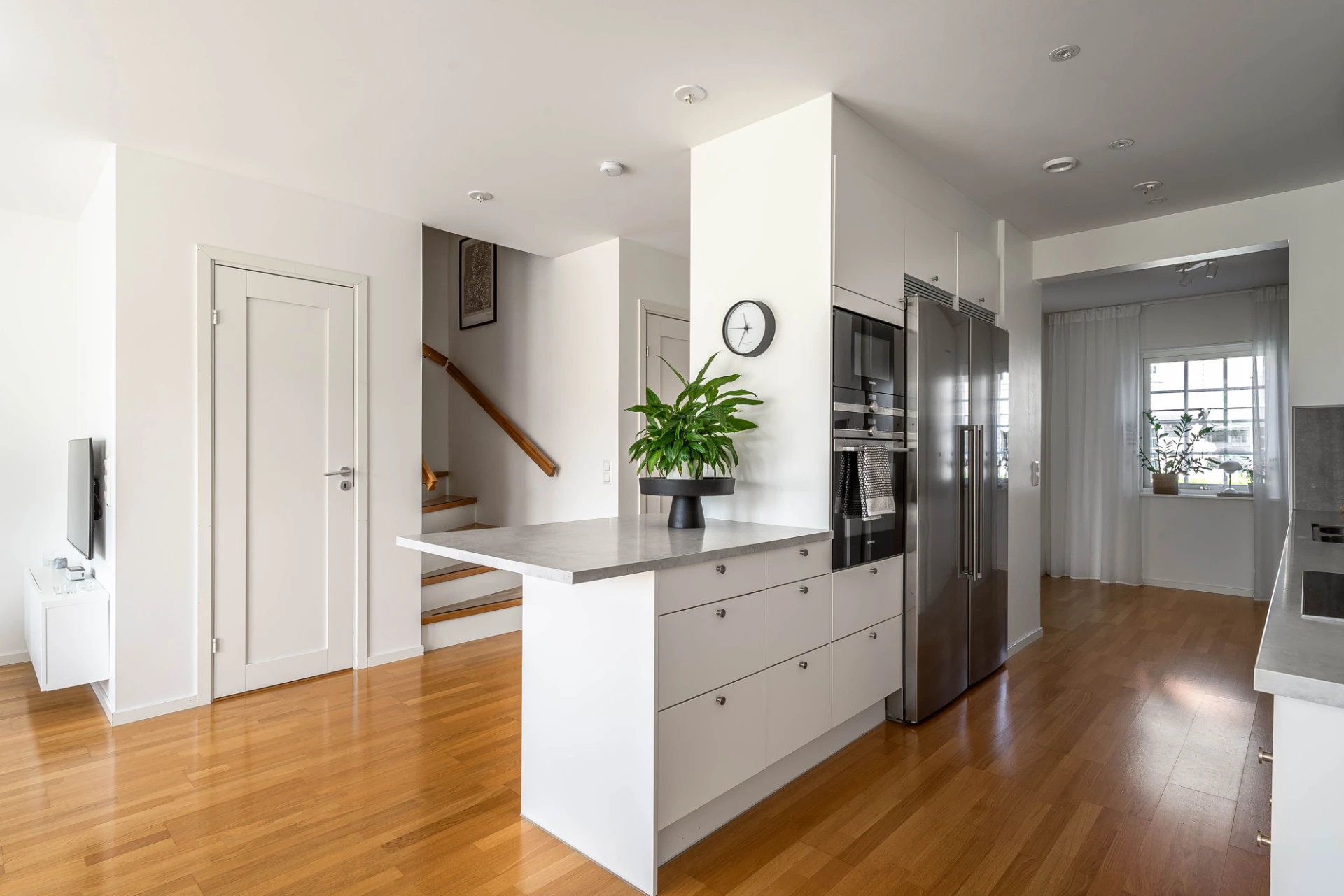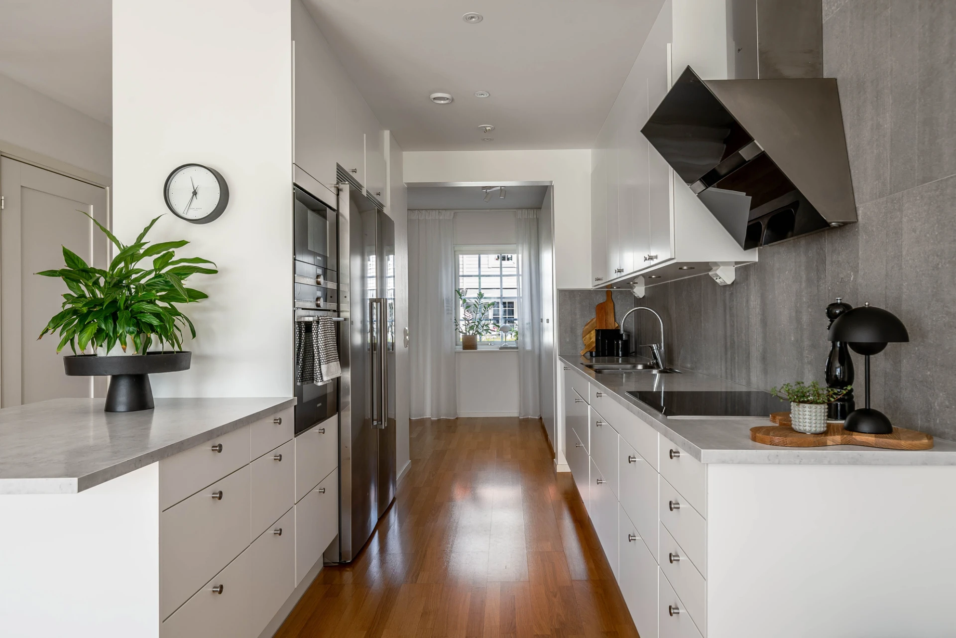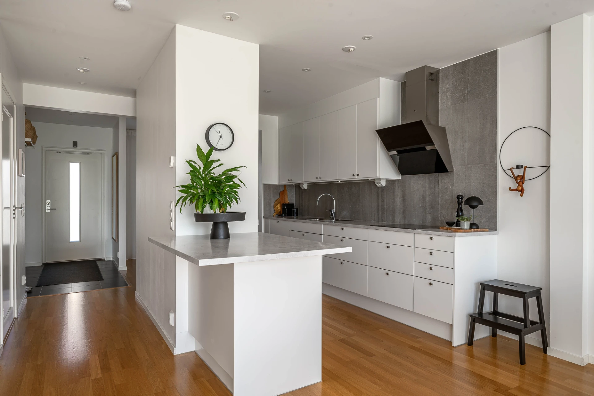 Stilrent kök med parkettgolv och målade väggar. Den vita köksinredningen ger ett ljust och modernt intryck. Köket är utrustat med kyl, frys, induktionshäll, inbyggd ugn, fläkt, inbyggd mikrovågsugn samt diskmaskin – allt du behöver för en bekväm vardag.