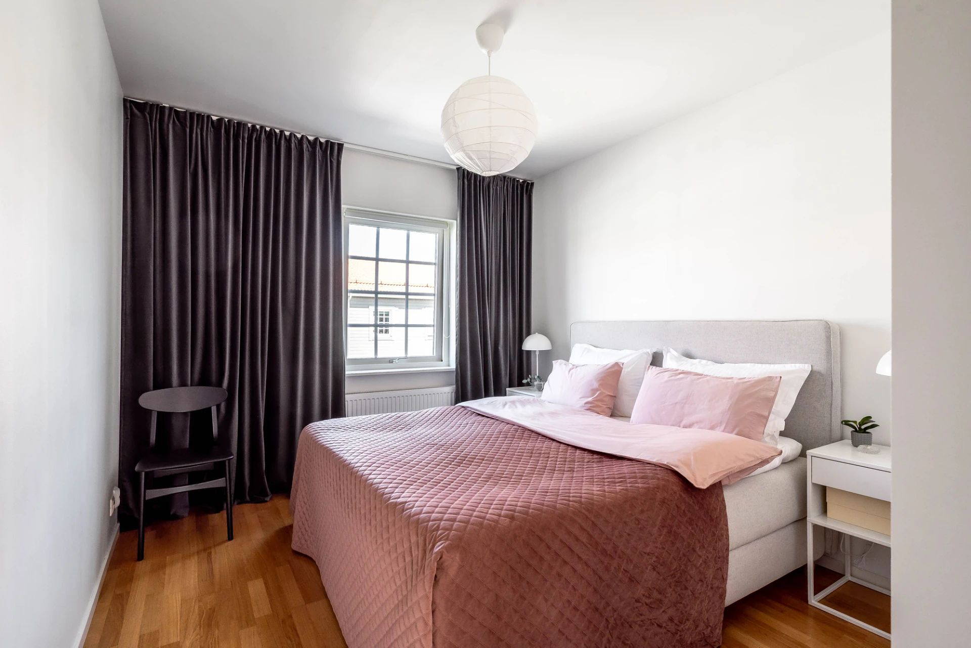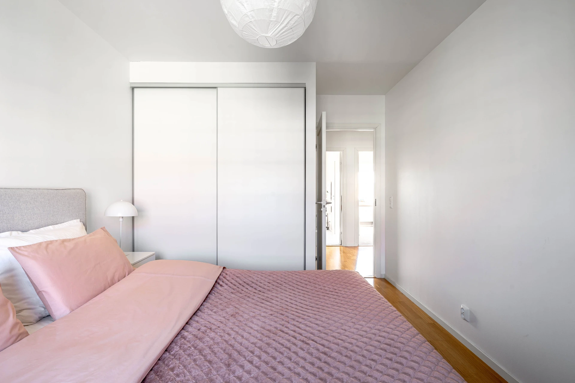 Trivsamt sovrum med parkettgolv och målade väggar. Rummet erbjuder plats för en dubbelsäng och har förvaring i en praktisk skjutdörrsgarderob.