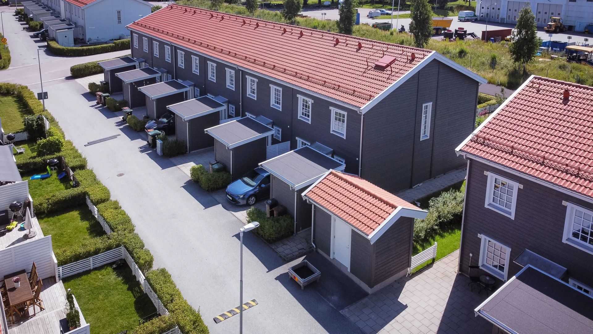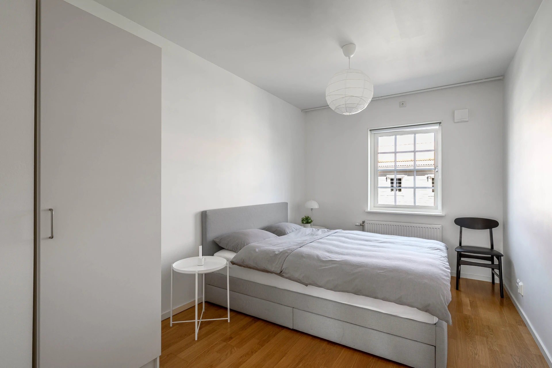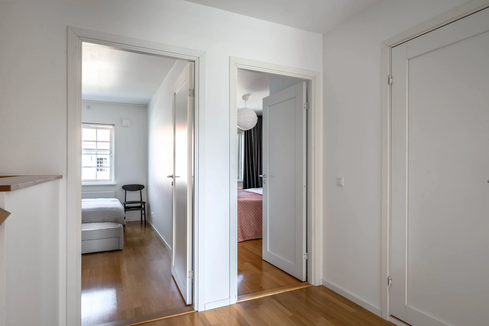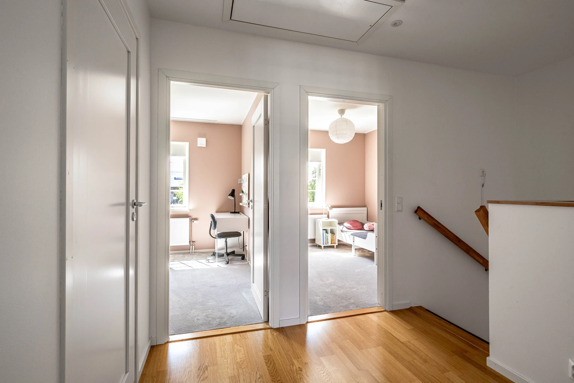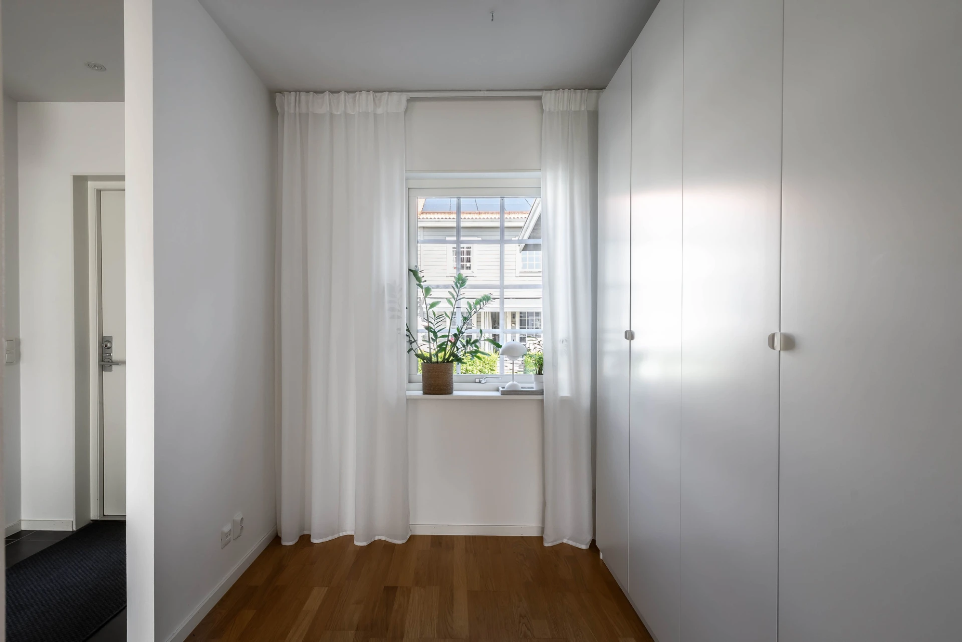 Ljust sovrum med parkettgolv och målade väggar. Rummet rymmer en dubbelsäng och har förvaring i form av en garderob. Kan med fördel nyttjas som ett allrum vid behov.