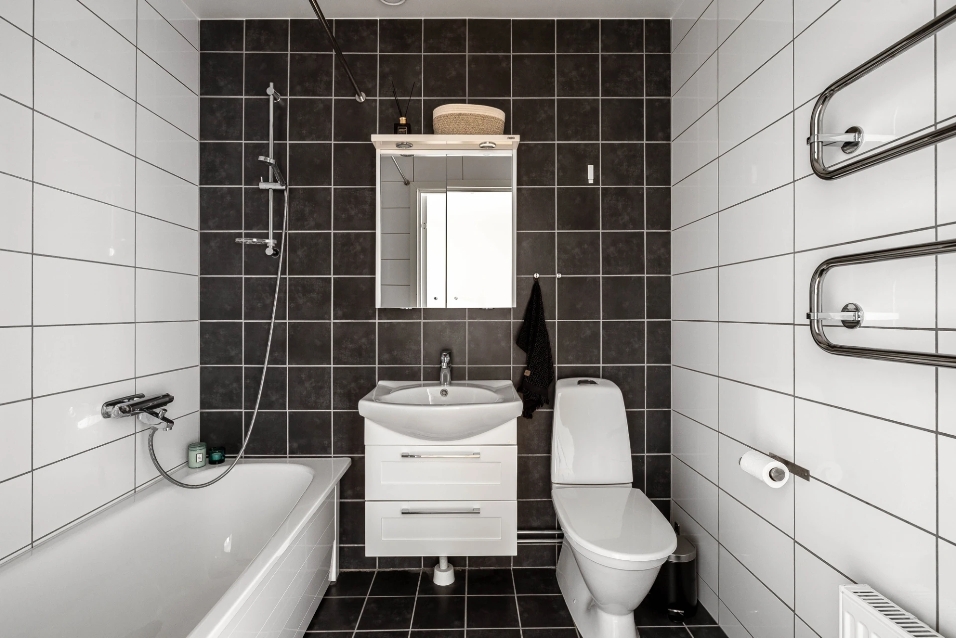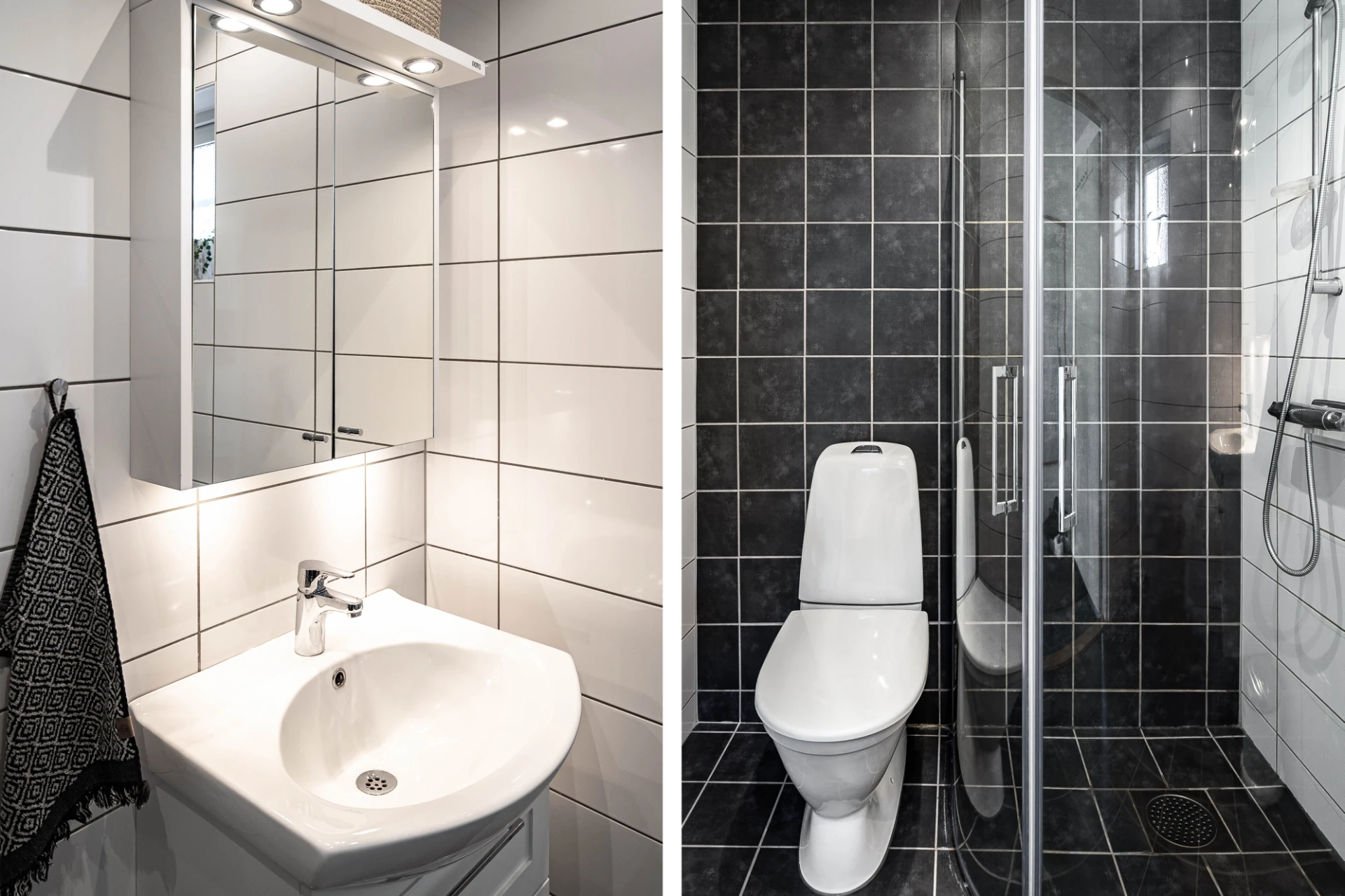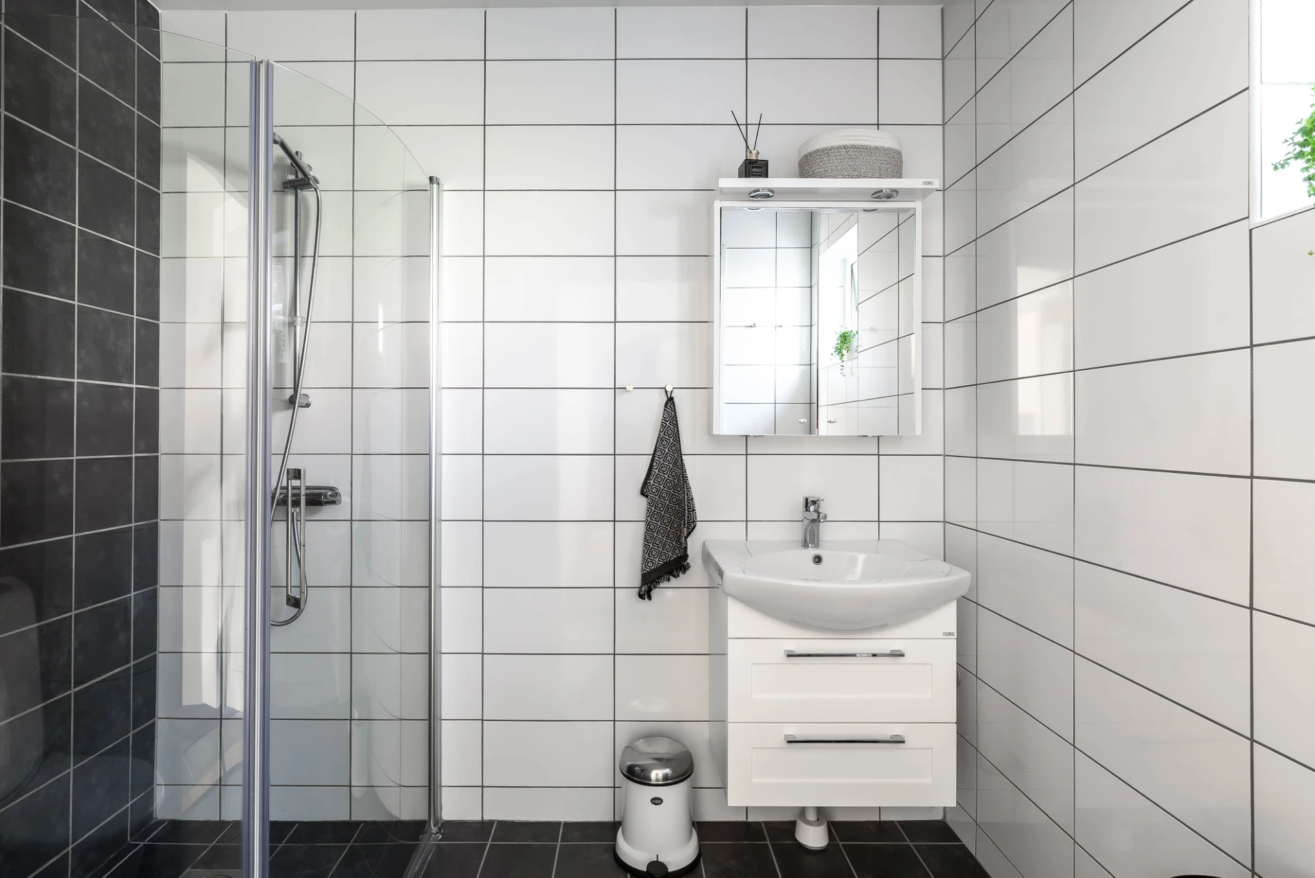 Helkaklat badrum med wc, handfat, spegelskåp och dusch.