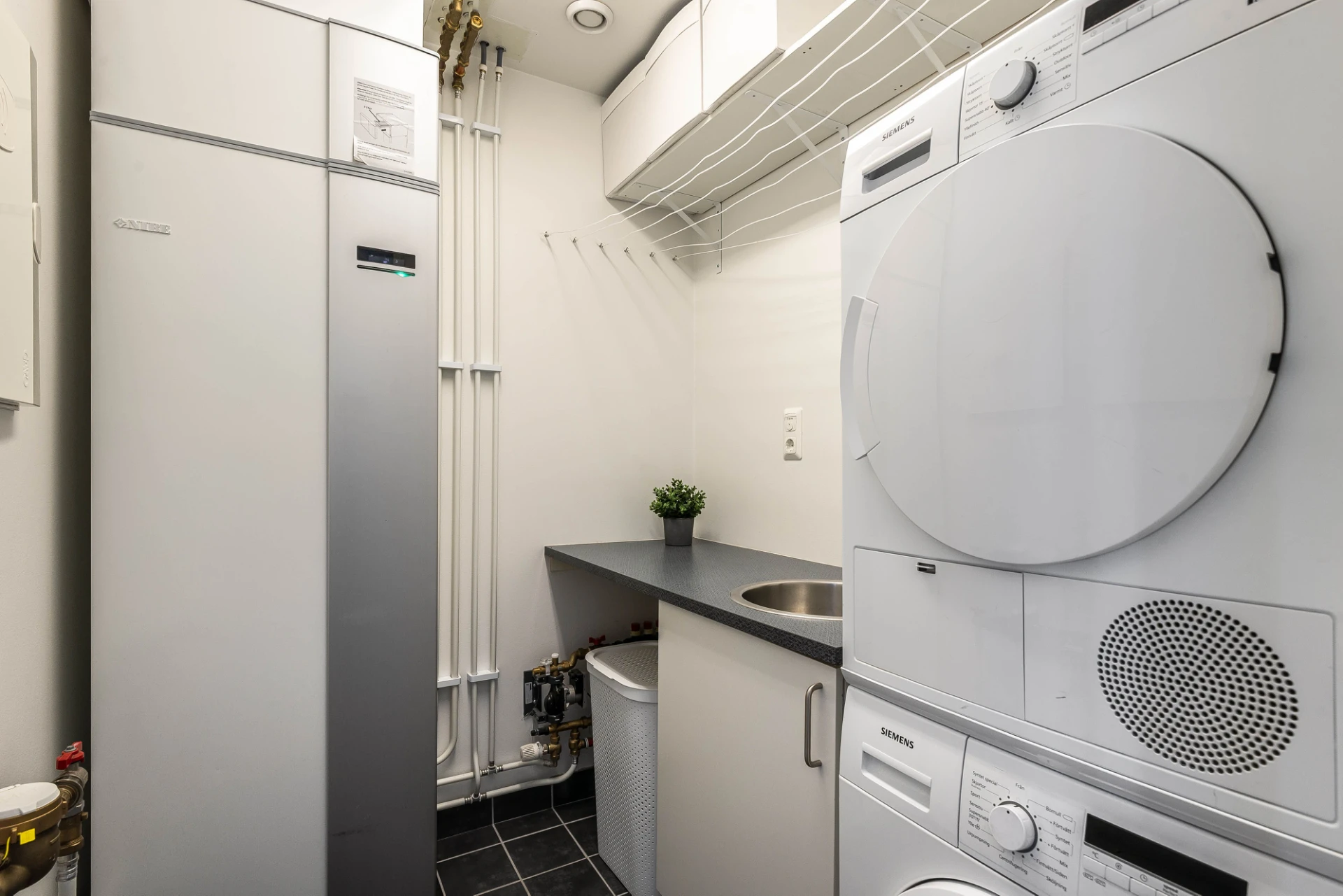 Tvättstugan har kaklat golv, tvättmaskin och torktumlare.