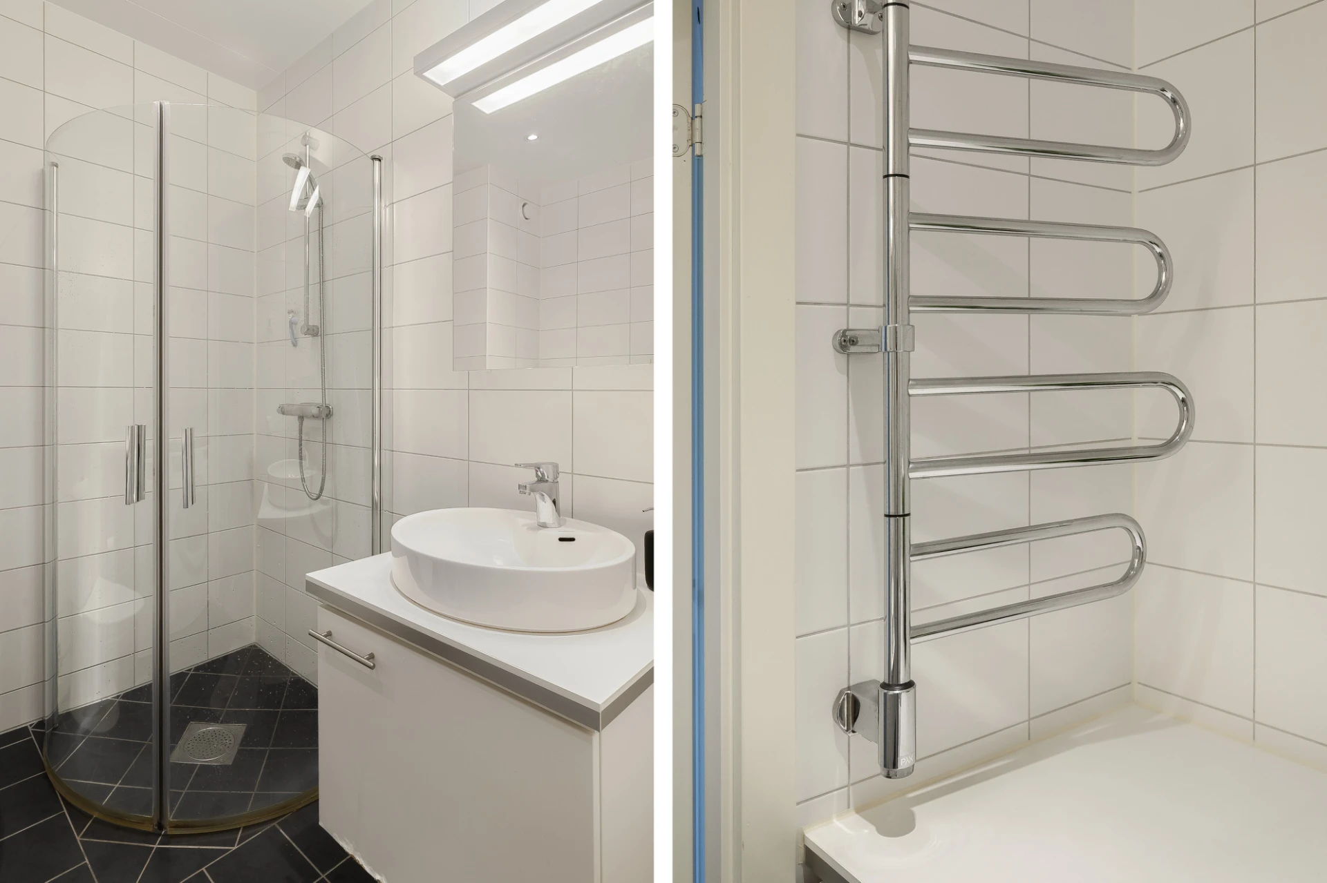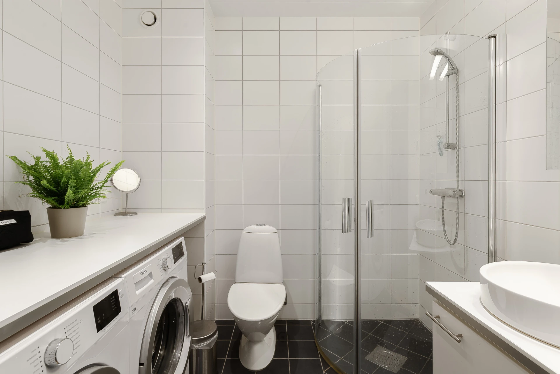 Handfat med kommod, spegel, handukstork, Wc samt dusch med vikdörrar i glas. Tvättavdelning med tvättmaskin och torktumlare med arbetsbänk ovan.Helkaklat badrum med golvvärme.