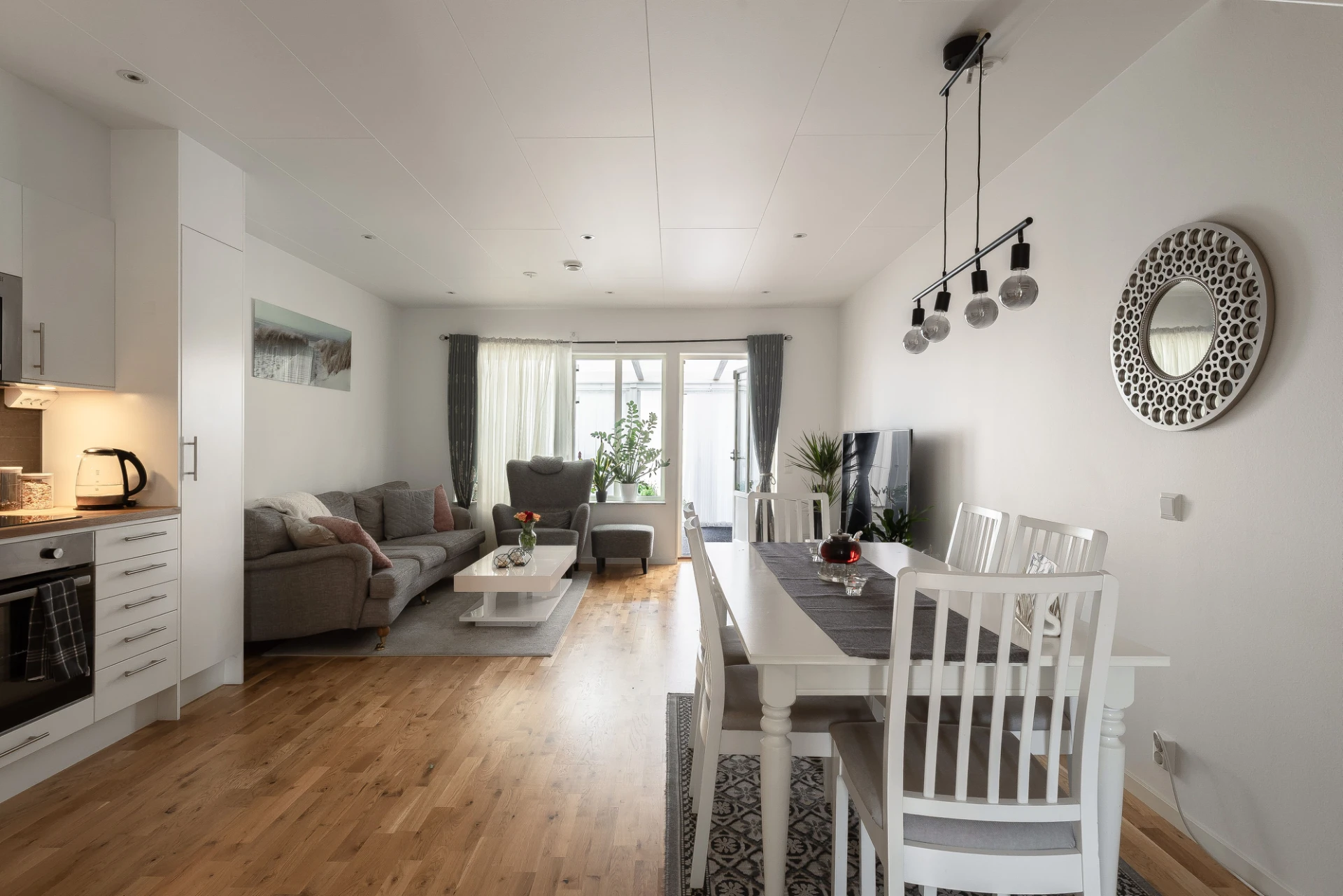 Vardagsrum med plats för både matplats och soffgrupp. Utgång till uteplats. Målade väggar och parkettgolv.