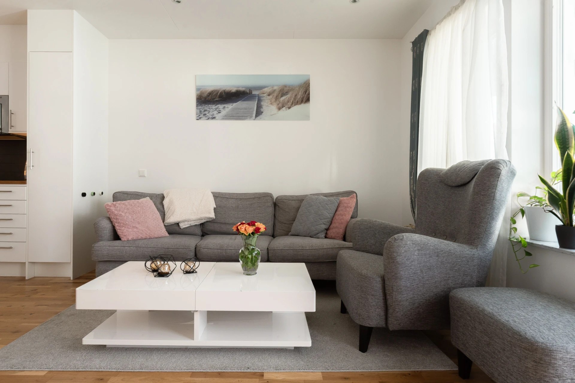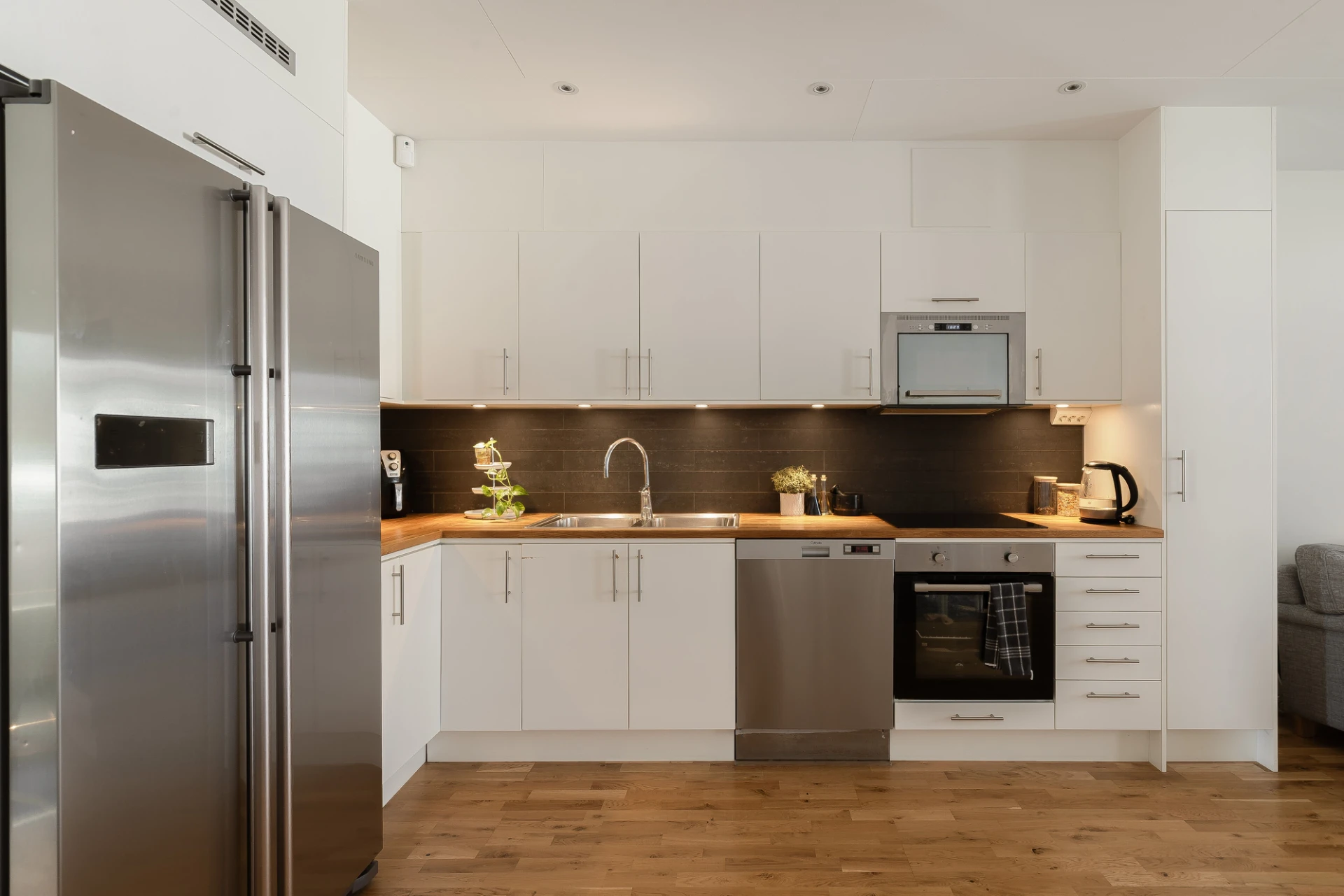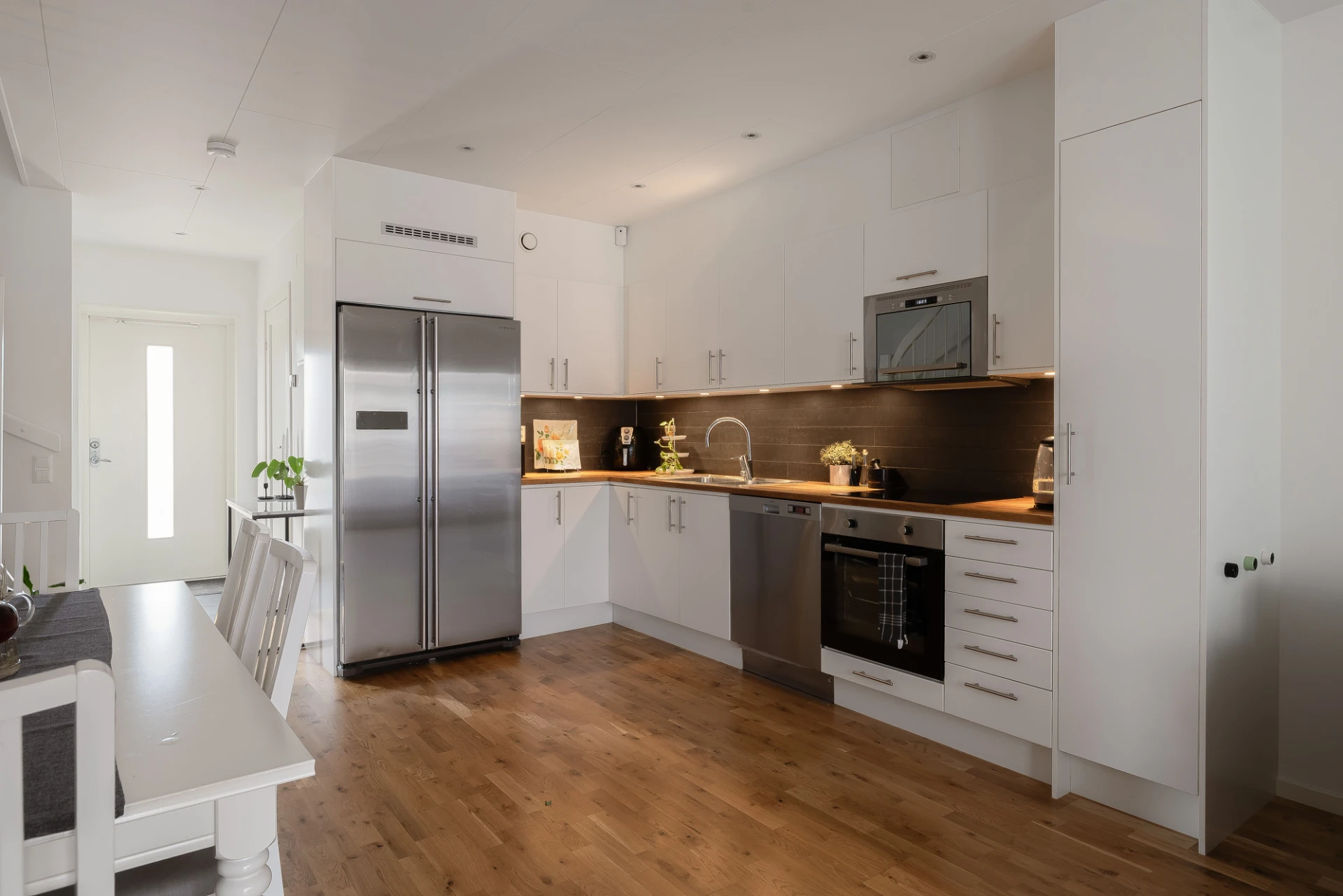 Den öppna planlösningen mellan kök och vardagsrum ger härliga sociala ytor. Designkök från Kungsäter Kök, diskmaskin, kyl/frys, spishäll, inbyggnadsugn och mikro i rostfritt. Målade väggar och ekparkett. Utgång till uteplats.