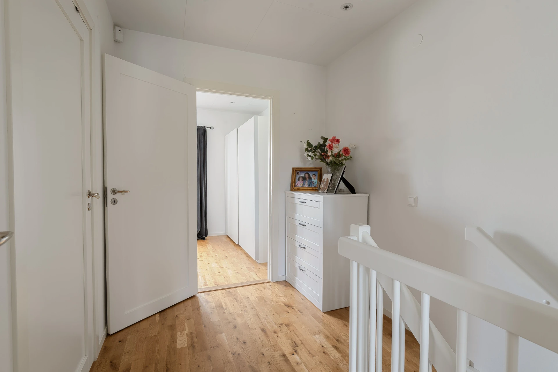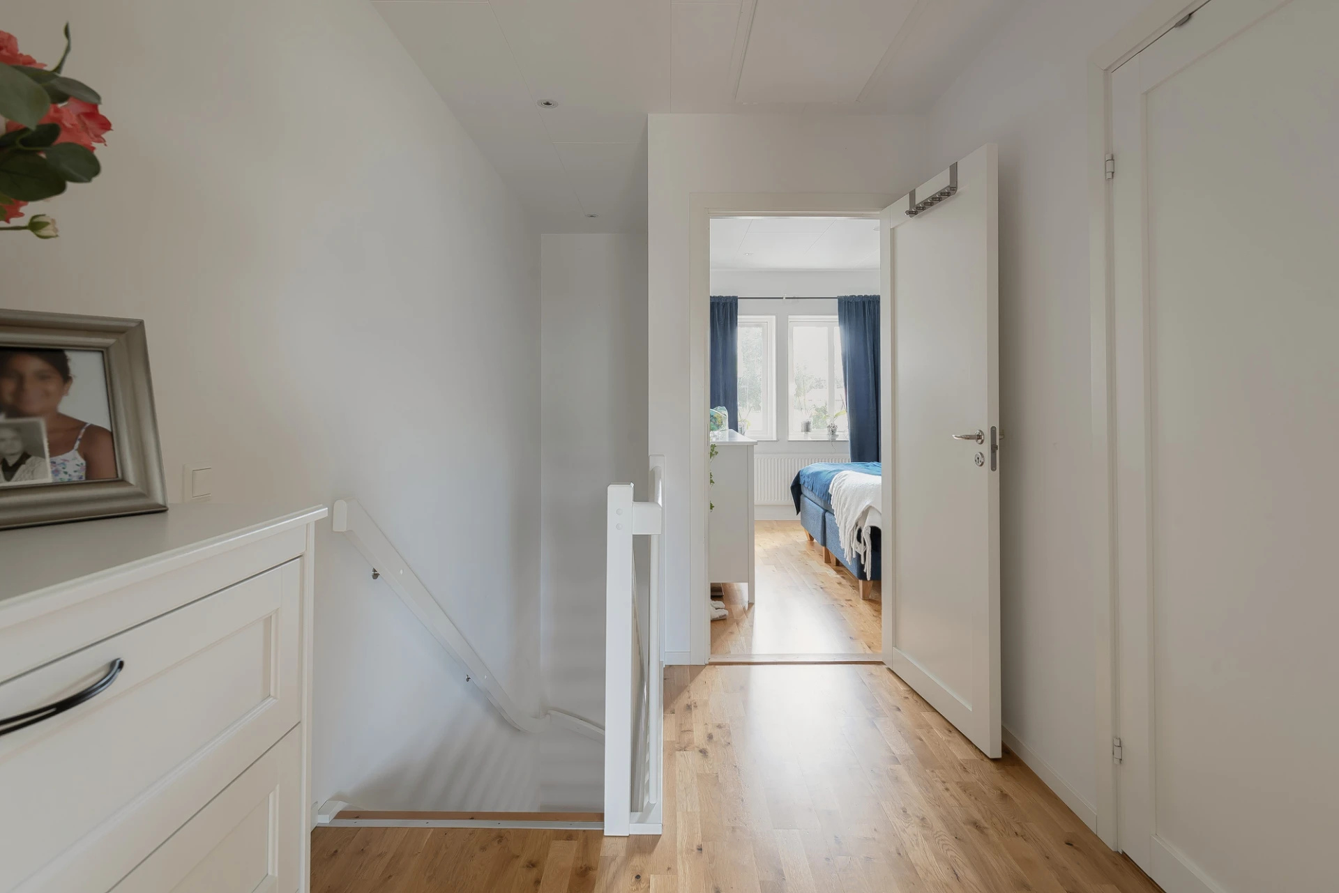 Övre plan bjuder på två bra sovrum – ett rymligt master bedroom med god förvaring och plats för både dubbelsäng och arbetsyta samt ett flexibelt sovrum som passar lika bra som barnrum eller kontor. Här finns även ett helkaklat badrum med dusch och tvättavdelning, praktiskt utrustad med både tvättmaskin och torktumlare.