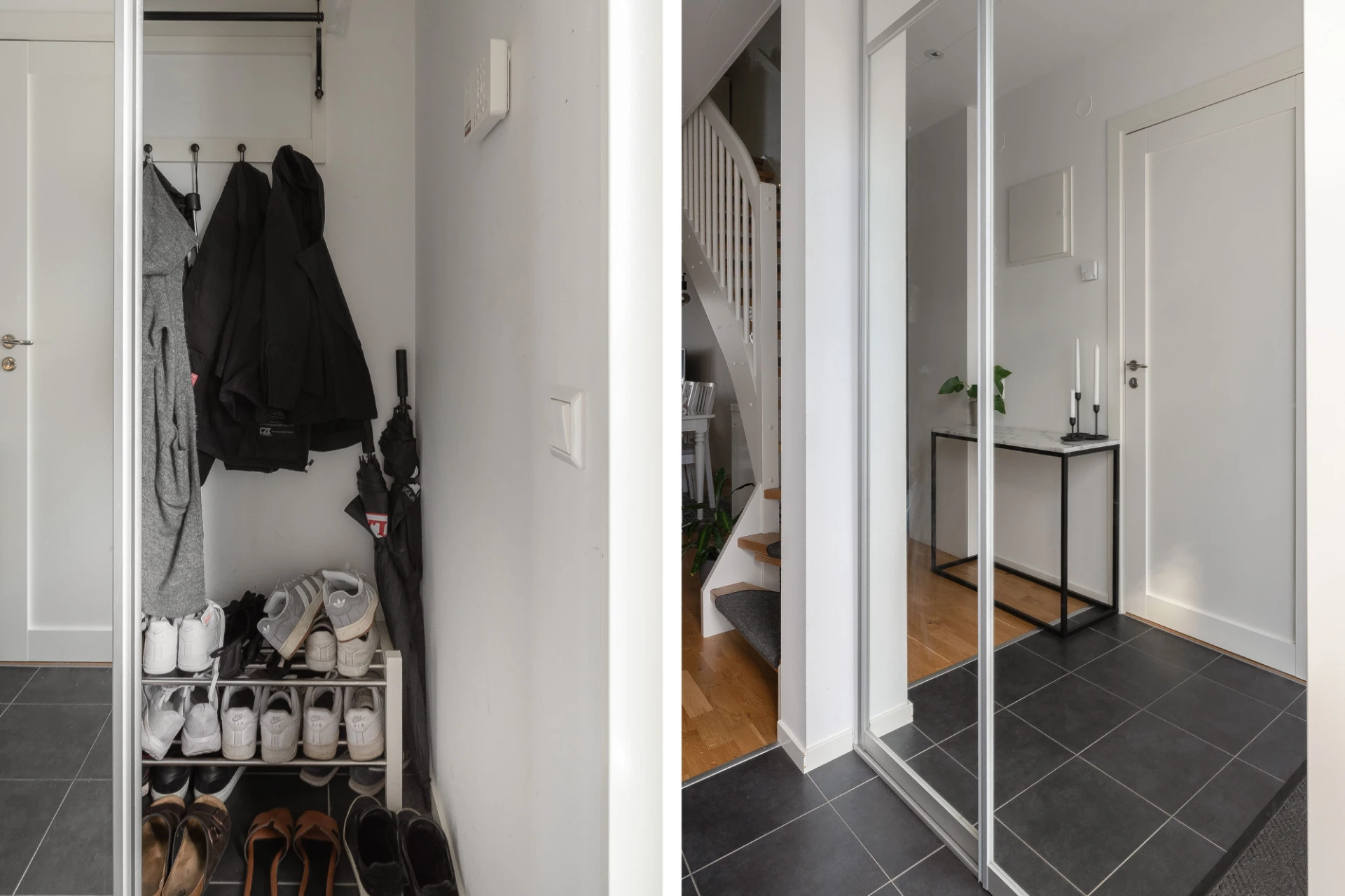 Hall med bra avhängningsytor. Målade väggar och klinkergolv.