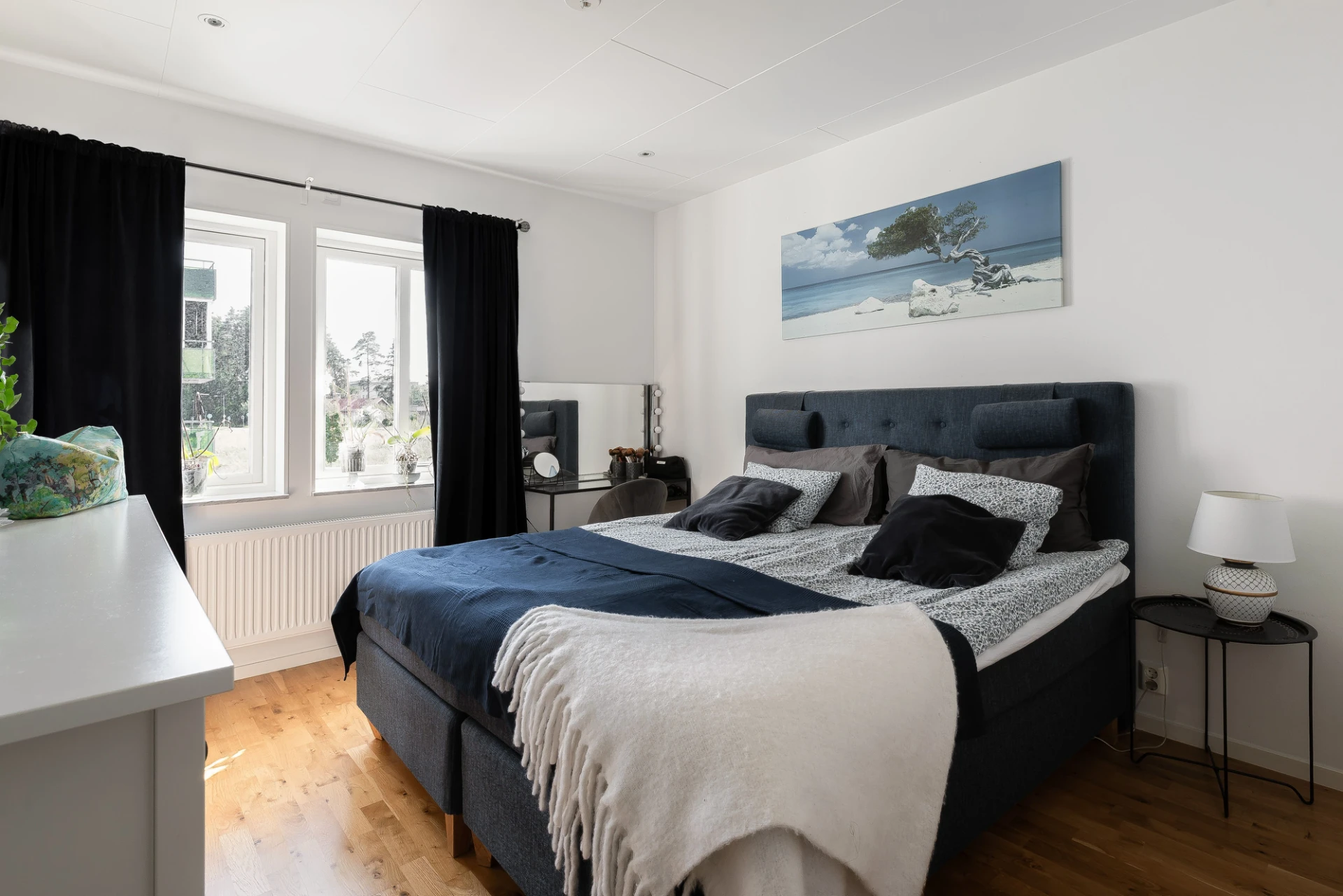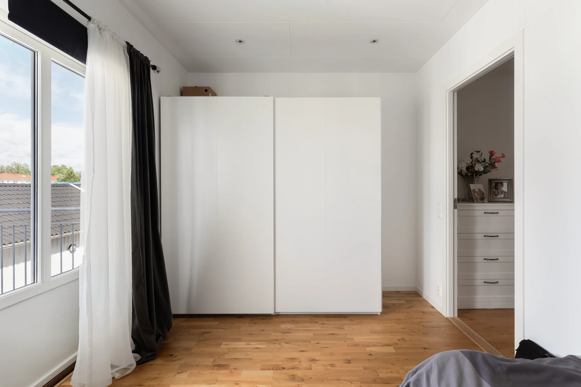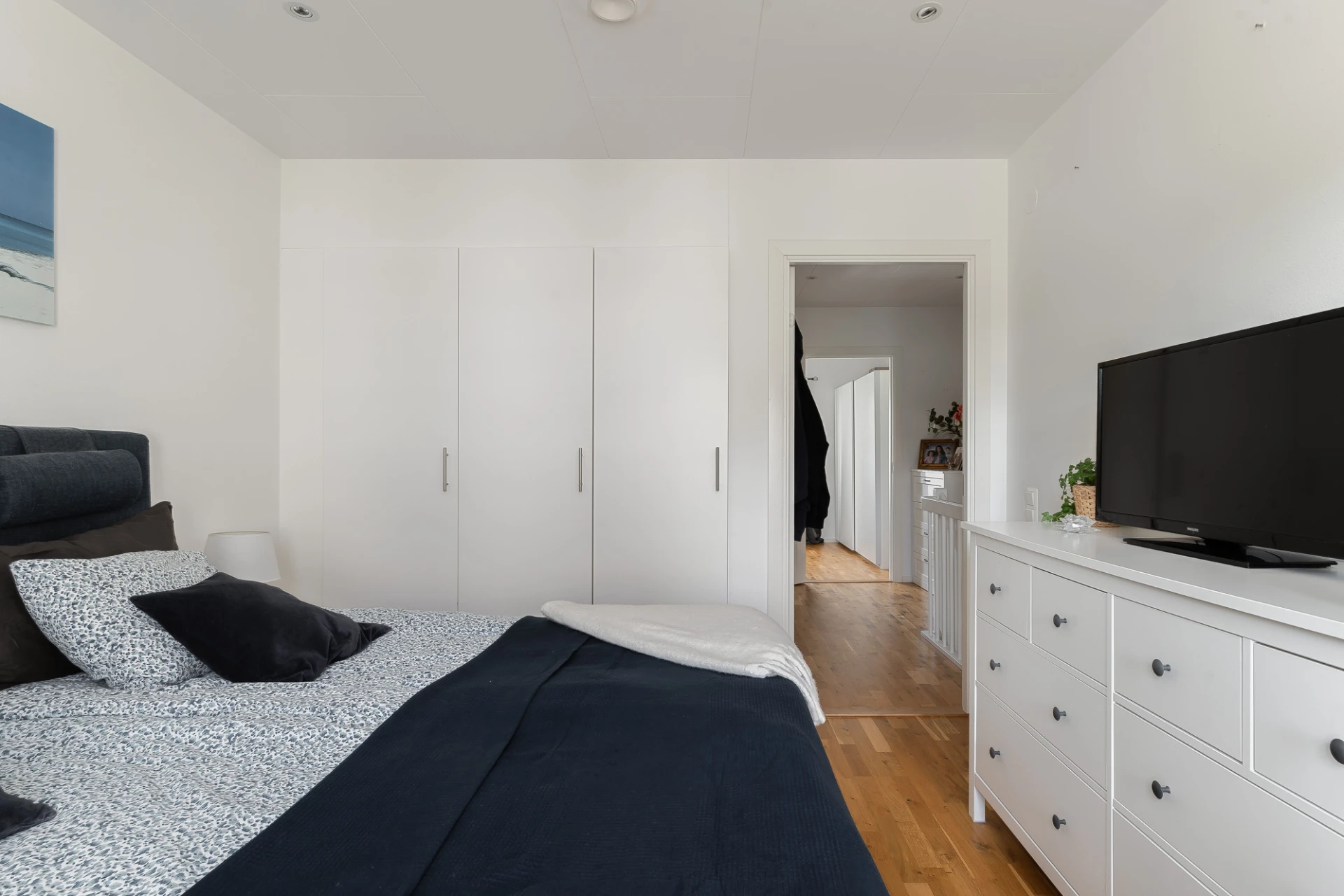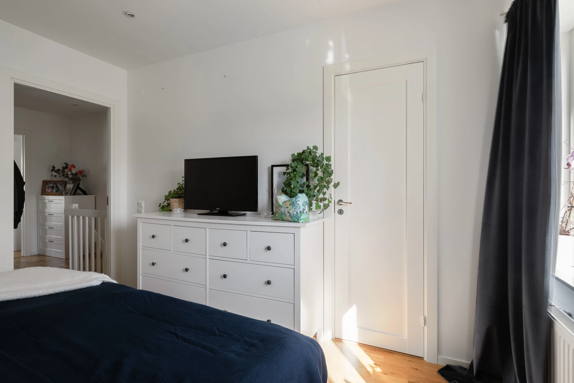 Rymligt sovrum med plats för dubbelsäng och skrivbord. Här finns gott om förvaring i de tre inbyggda garderoberna. Målade väggar och parkettgolv.