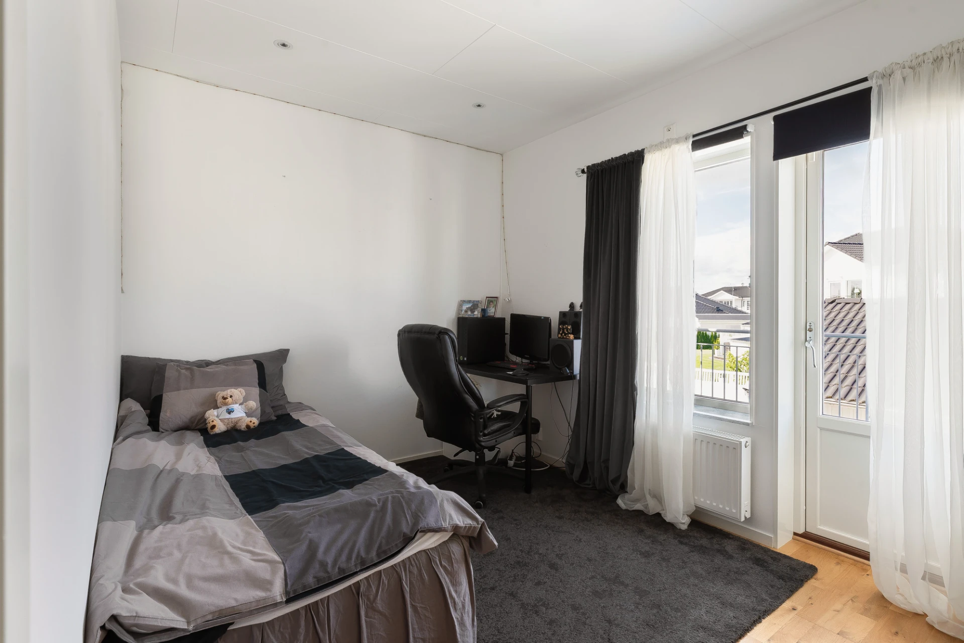 Ett mångsidigt sovrum med utrymme för en enkelsäng och en praktisk arbetshörna. Perfekt som barnrum eller hemmakontor. Målade väggar och parkettgolv.