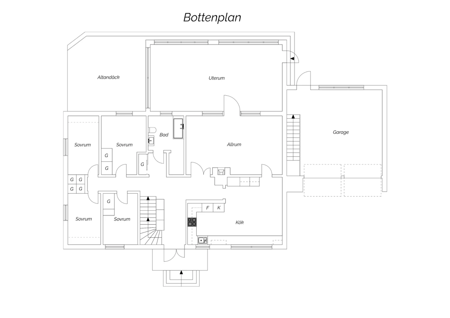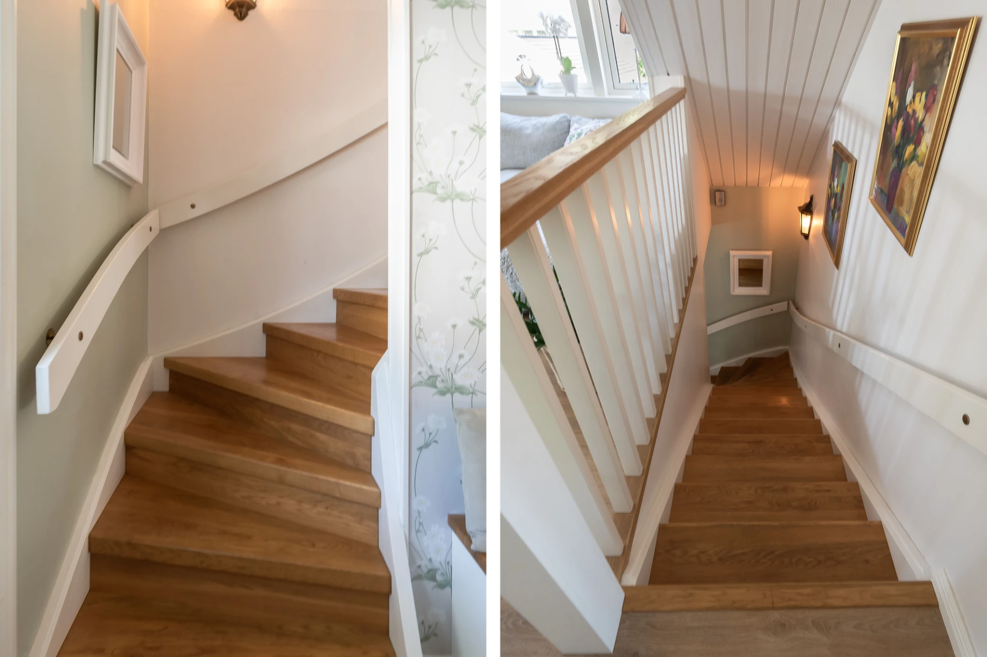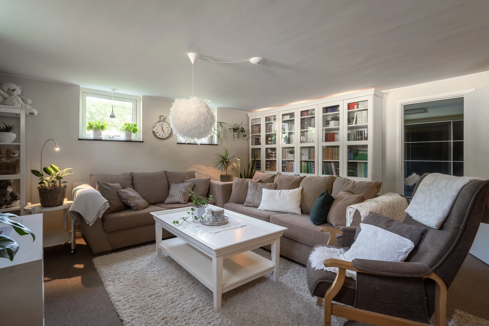 Vacker ektrapp leder ner till den mysiga gillestugan. Här finns en bekväm textilmatta och ett fint ljusinsläpp via stora fönster.