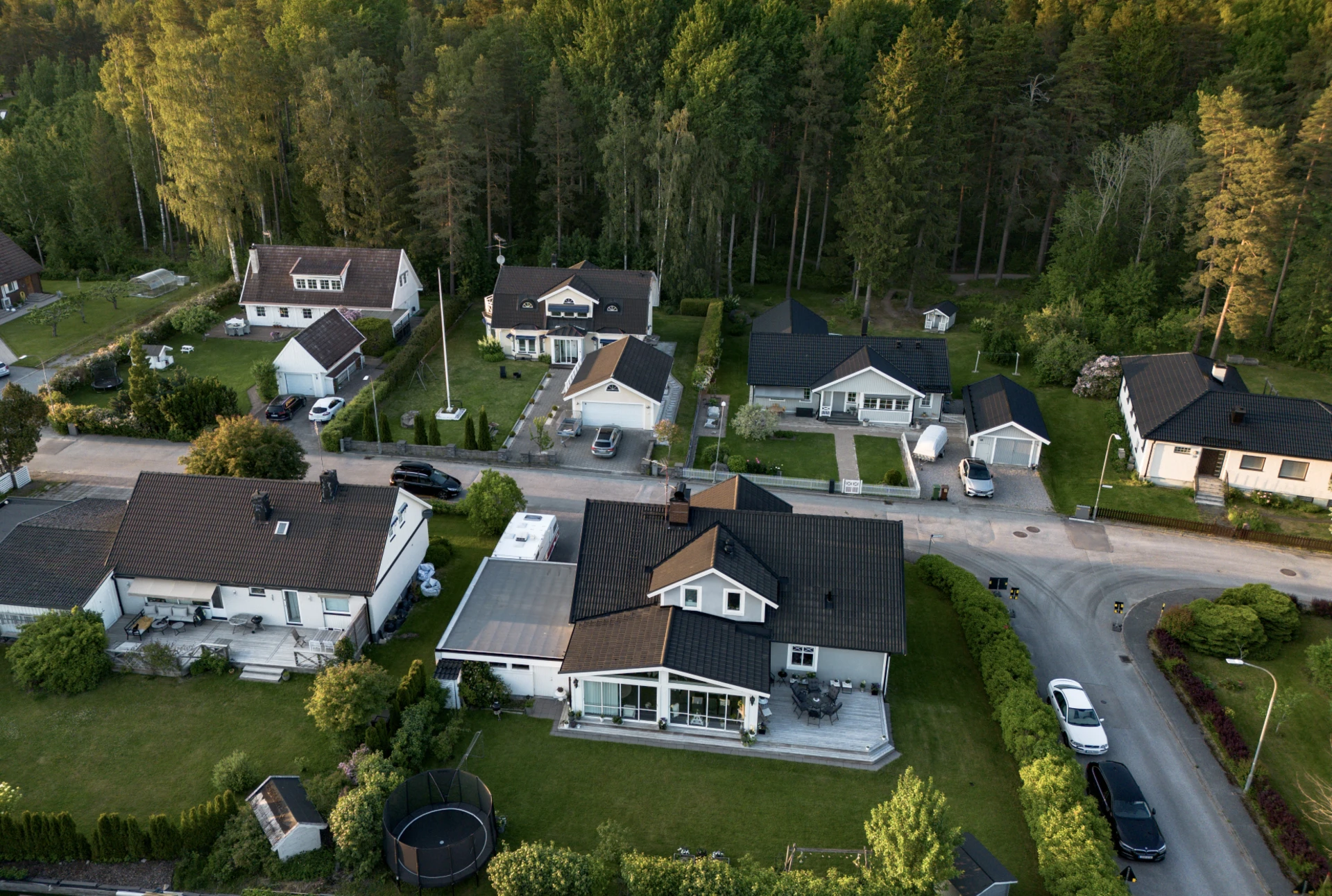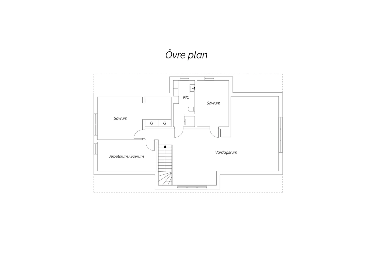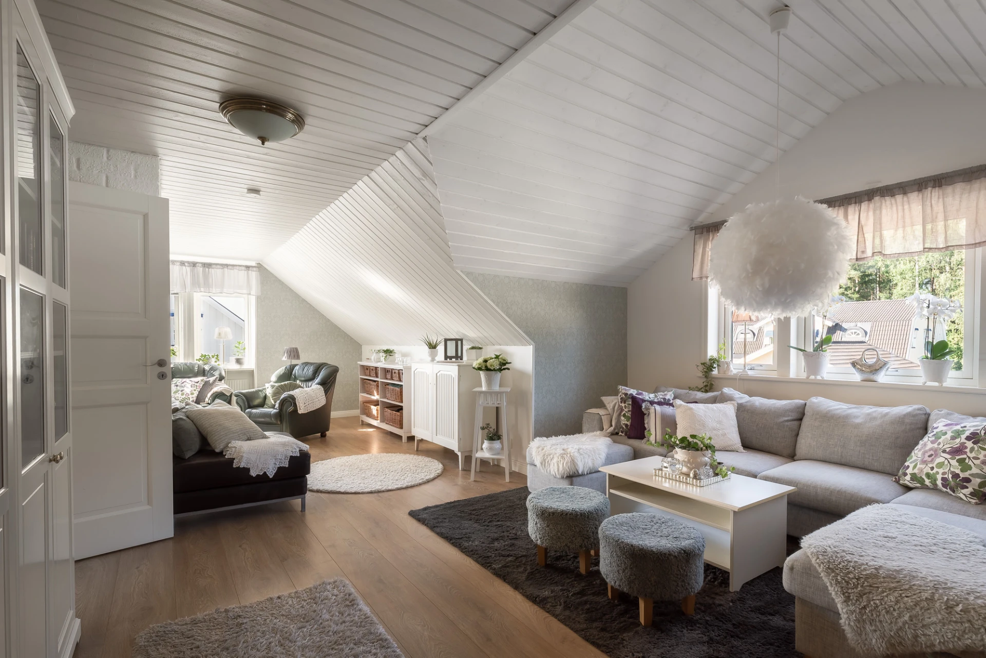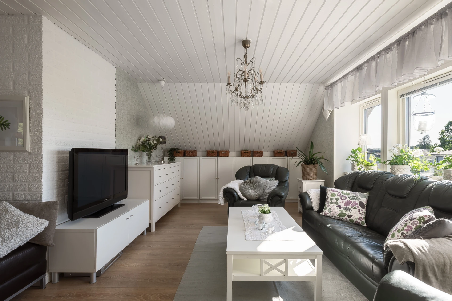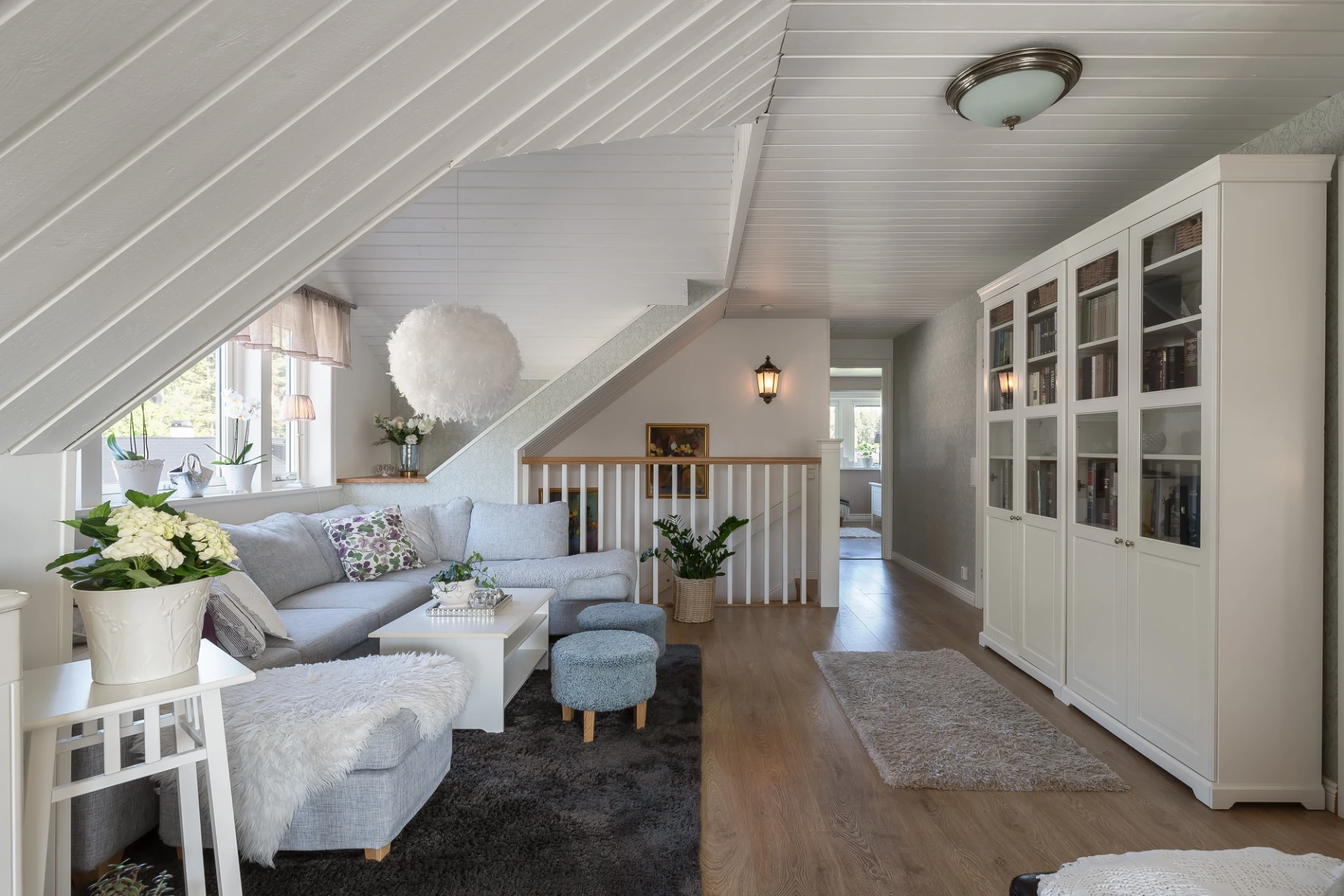 Generöst tilltaget allrum i vinkel med takkupa. Vackert ljusinsläpp via stora fönster mot väster och skogen i norr. Laminatgolv och tapetserade väggar. Spotlights i fönstersmygar.