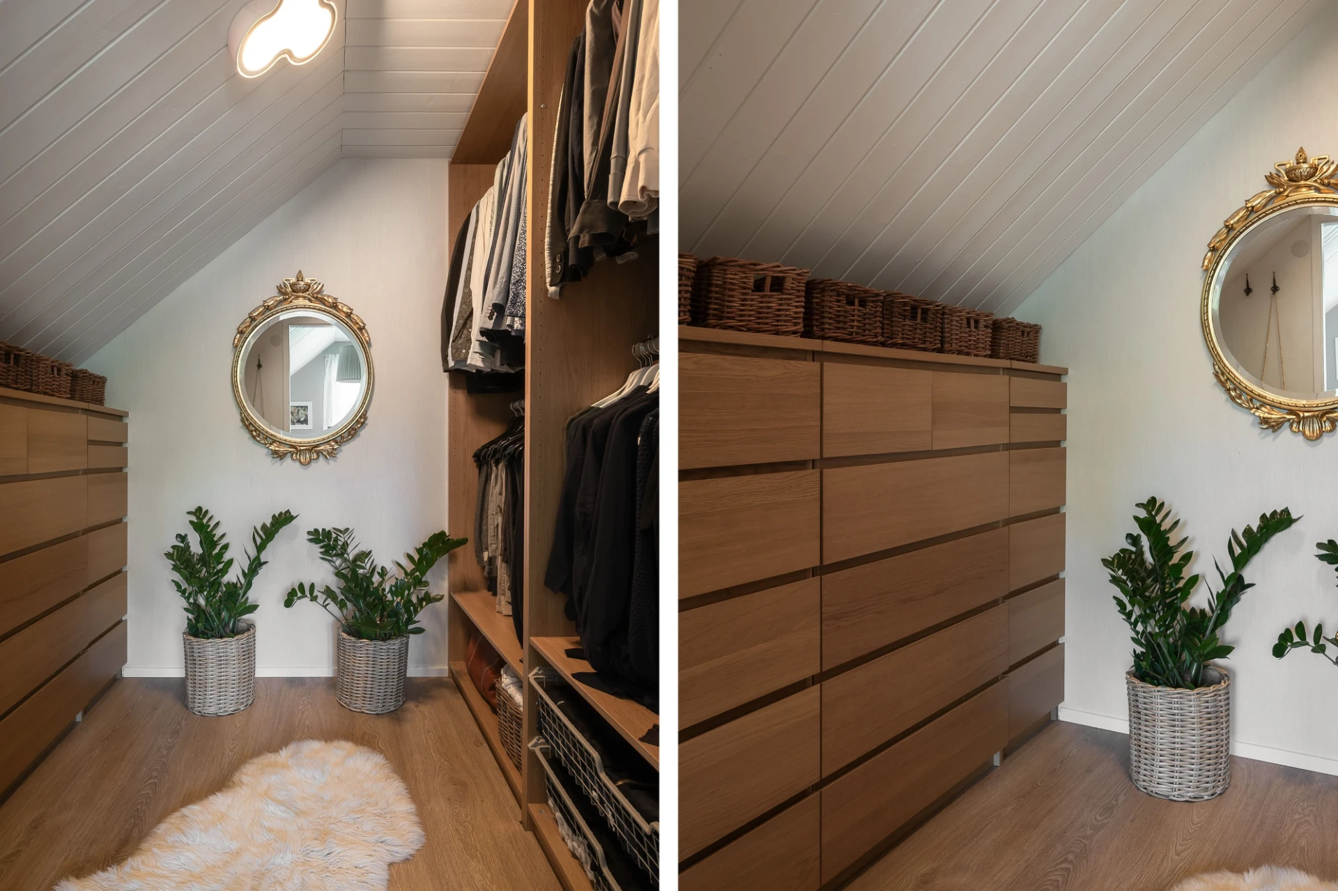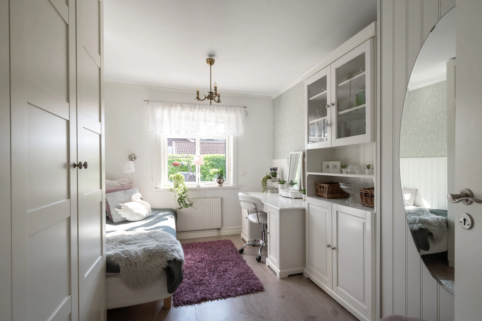 Sovrum med en dubbelgarderob och en enkelgarderob. Bröstpanel i pärlspont. Laminatgolv och tapetserade väggar. Stämningsfulla spotlights i fönstersmygen.