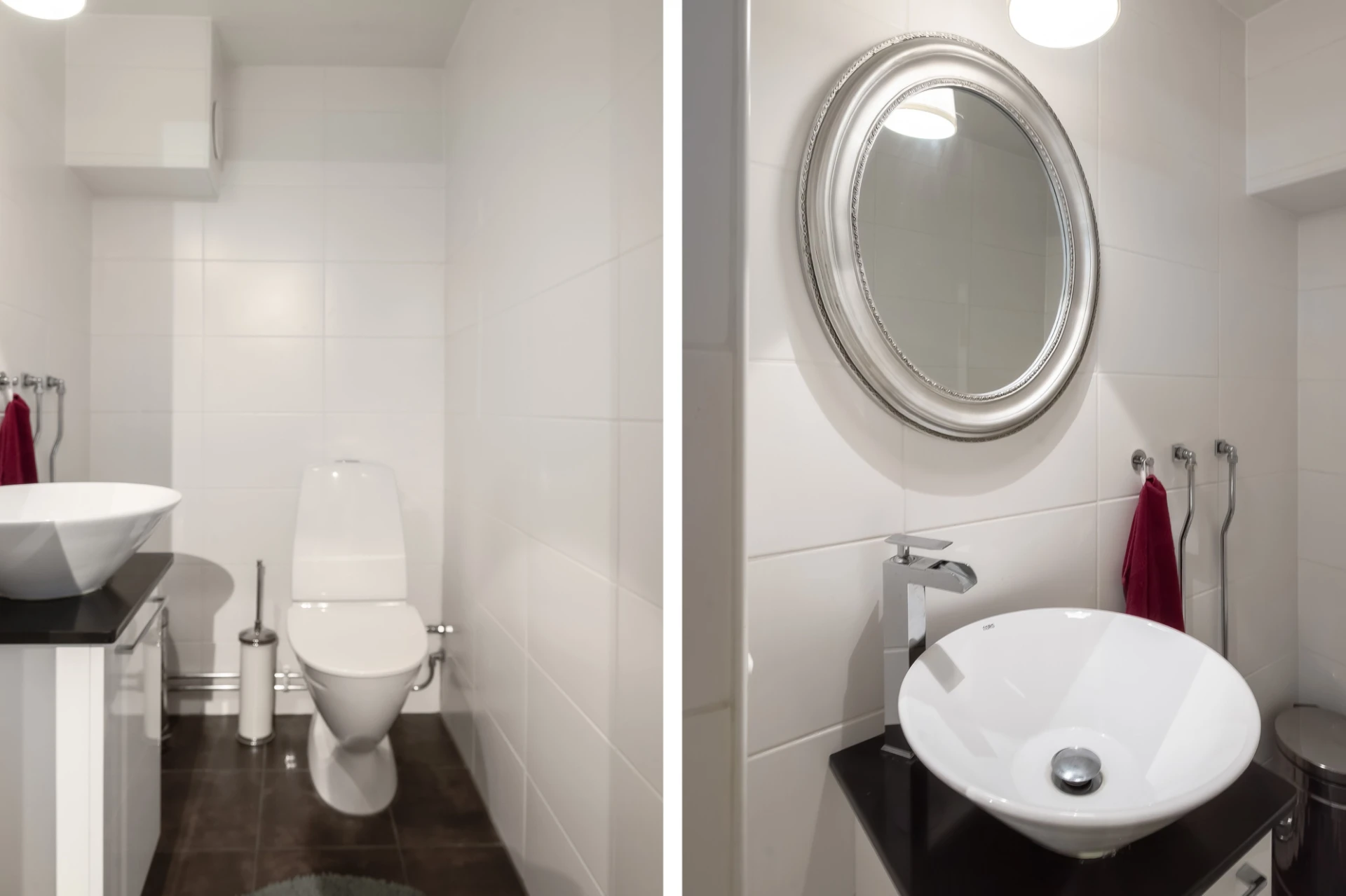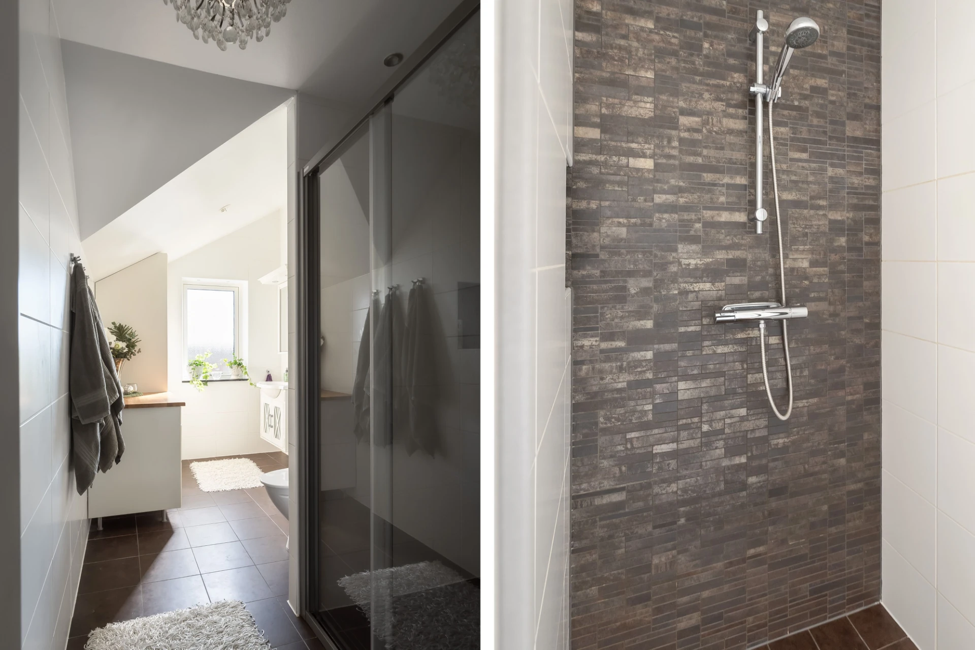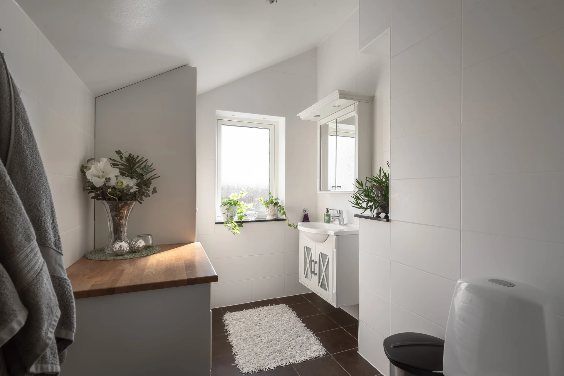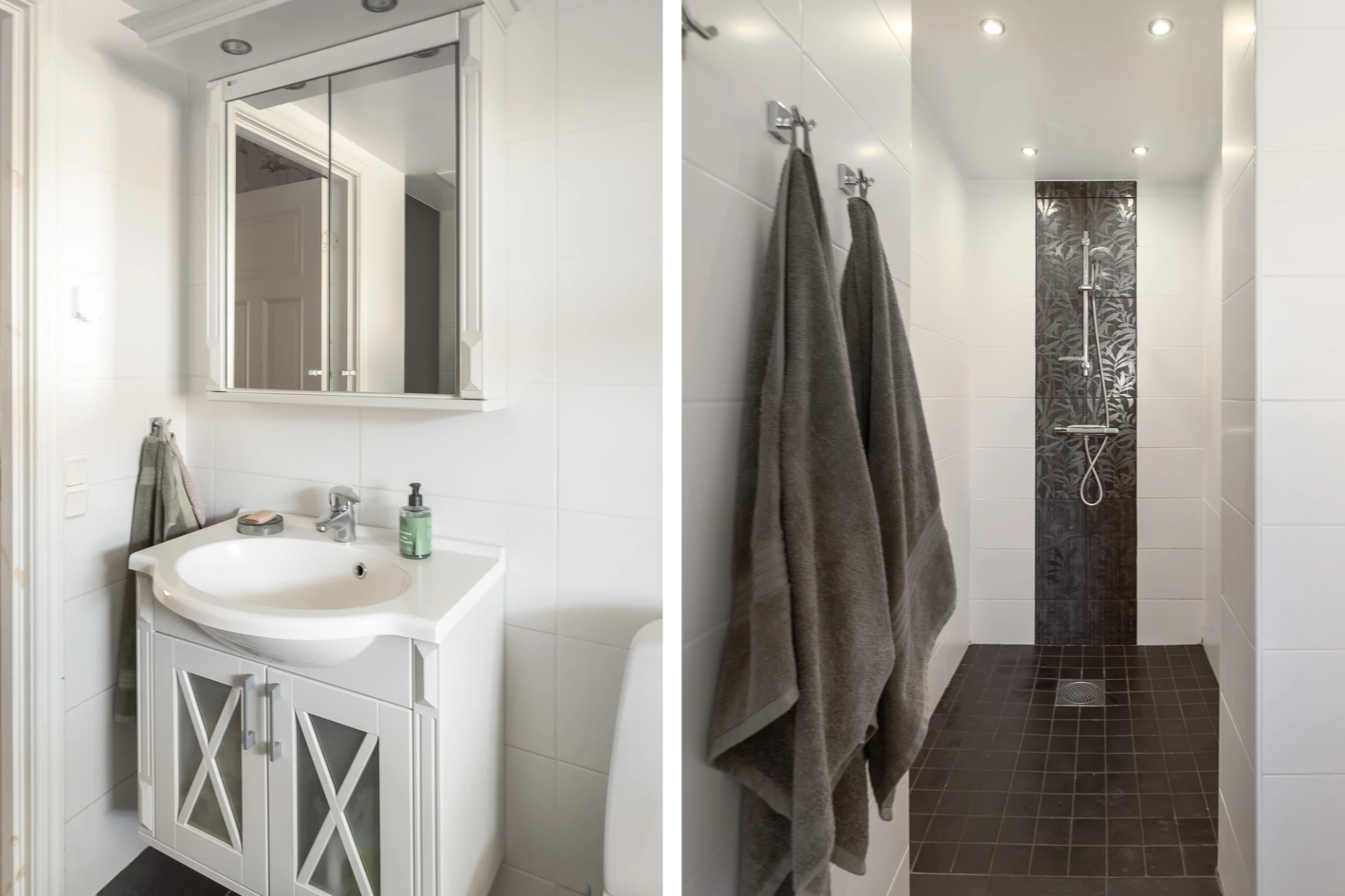 Stilrent badrum med kaklade väggar och ett snyggt klinkergolv. Här finns en platsbygd dusch, wc, handfat med kommod samt ett praktiskt spegelskåp. Badrummet har även goda förvaringsmöjligheter i flera skåp. Badrummet är från 2013. Infällda spotlights i duschplats och fönstersmyg ger en lyxig touch. Vattenburen golvvärme med egen termostat.