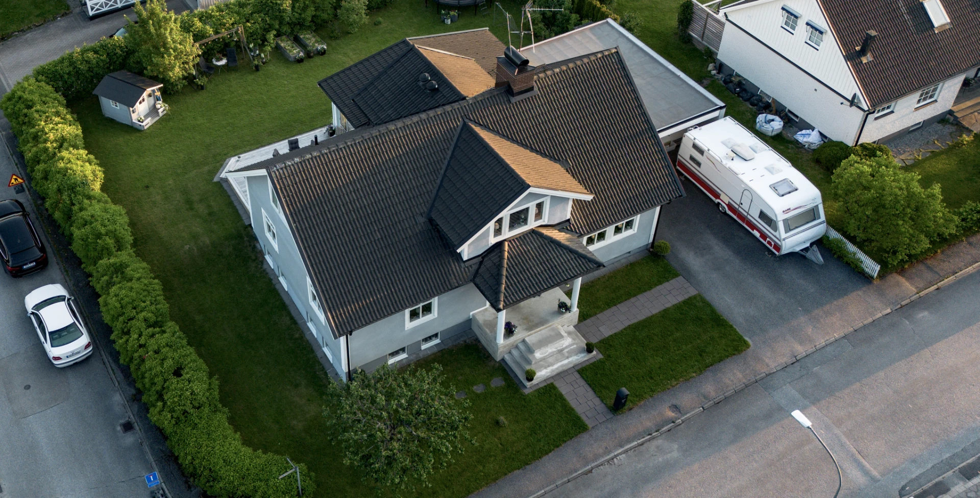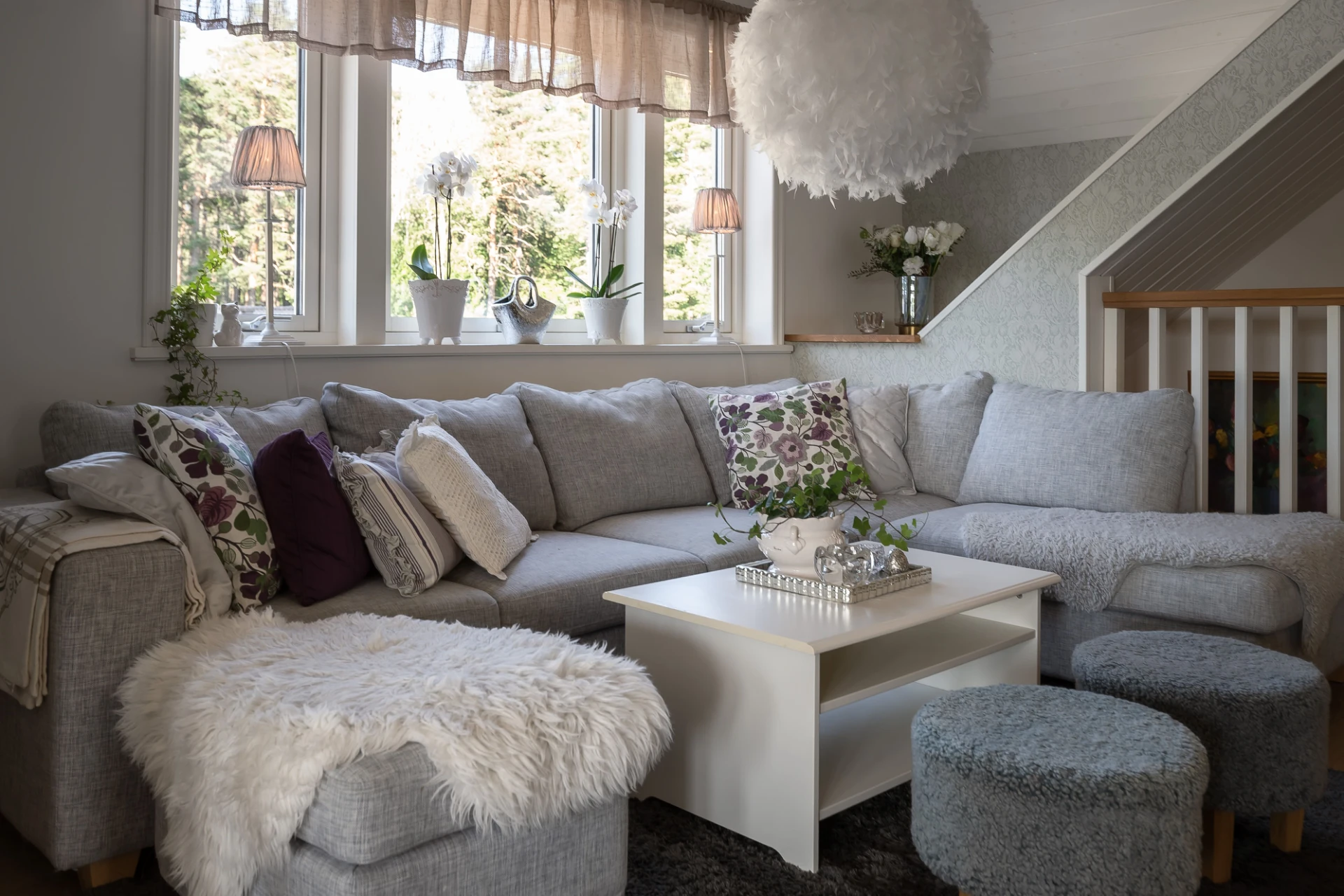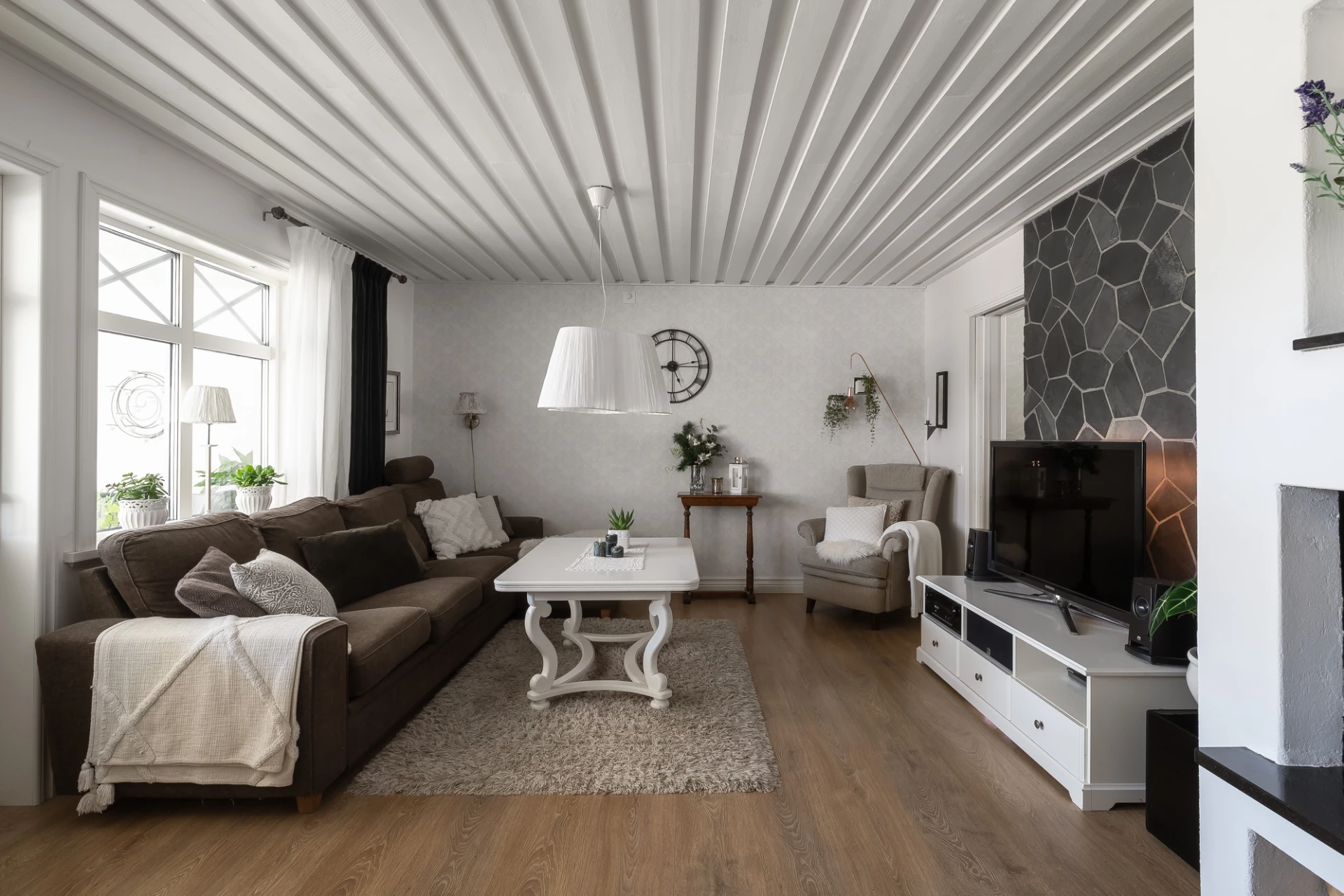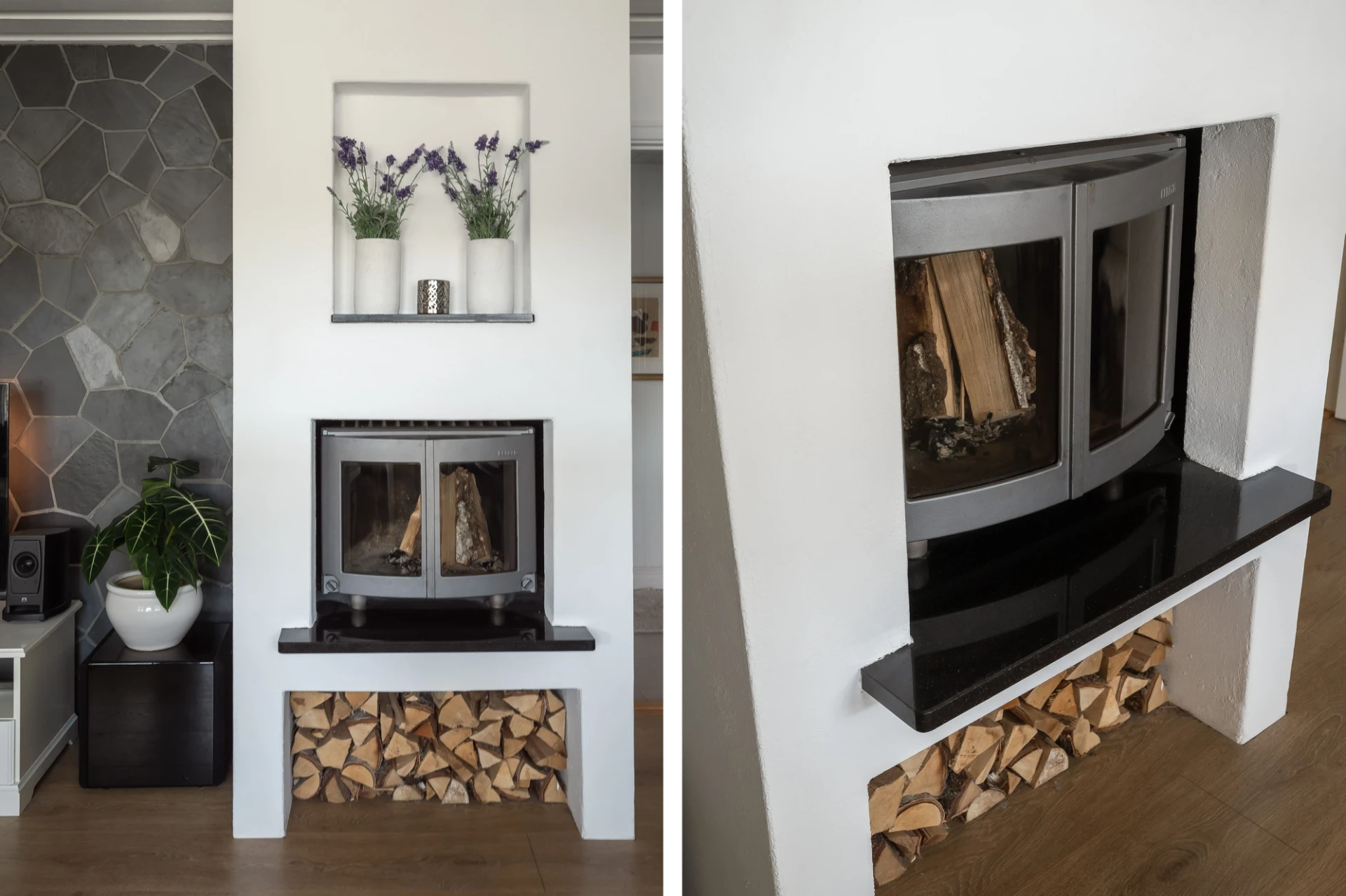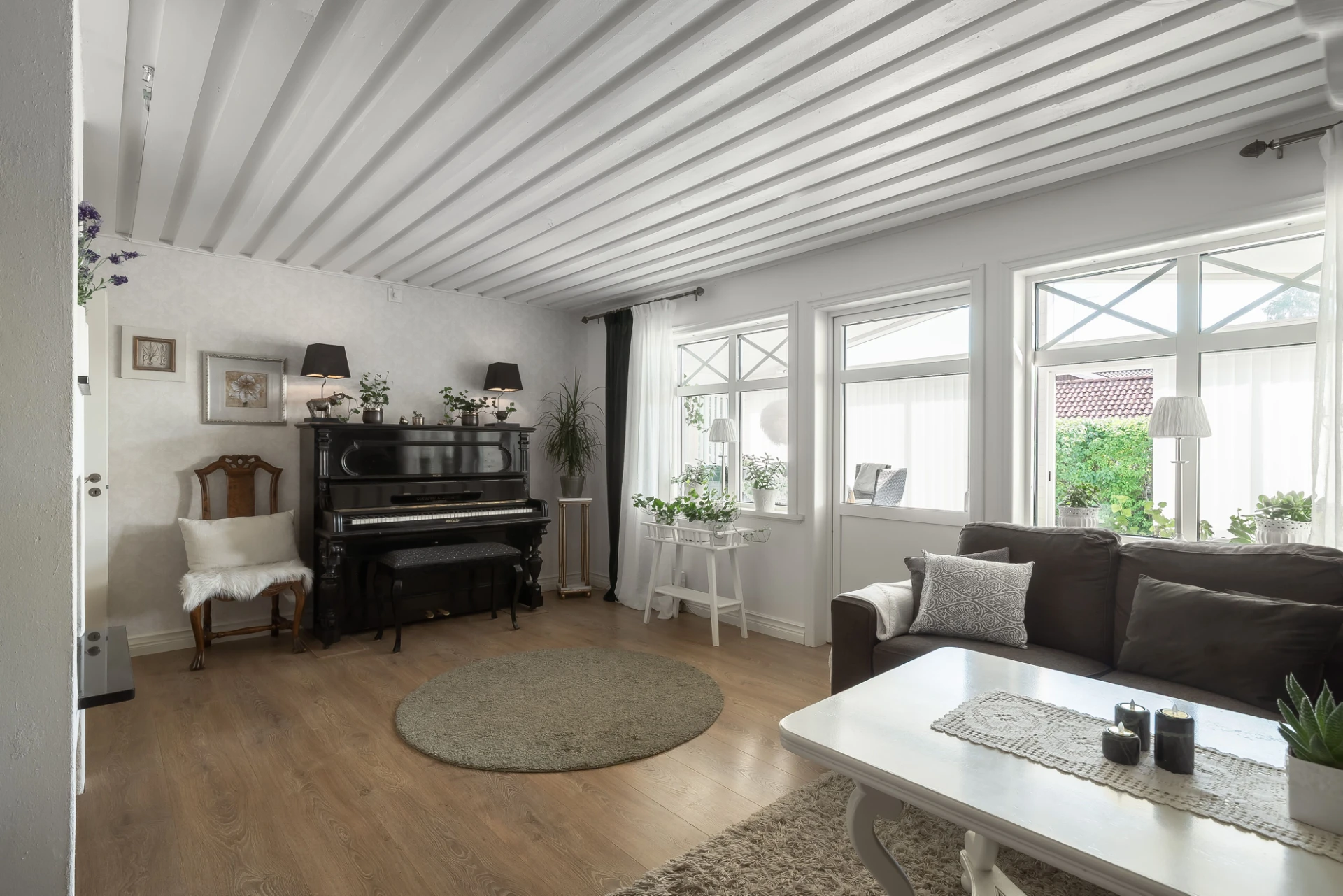 Vardagsrummet har tapetserade väggar med en fondvägg i skiffer som skapar en rustik och stilfull känsla. Laminatgolvet ger en neutral bas. En mysig kamin ger både värme och stämning. Här finns vattenburen golvvärme. Utgången till uterummet ger även en direkt praktisk access till utomhusmiljön.