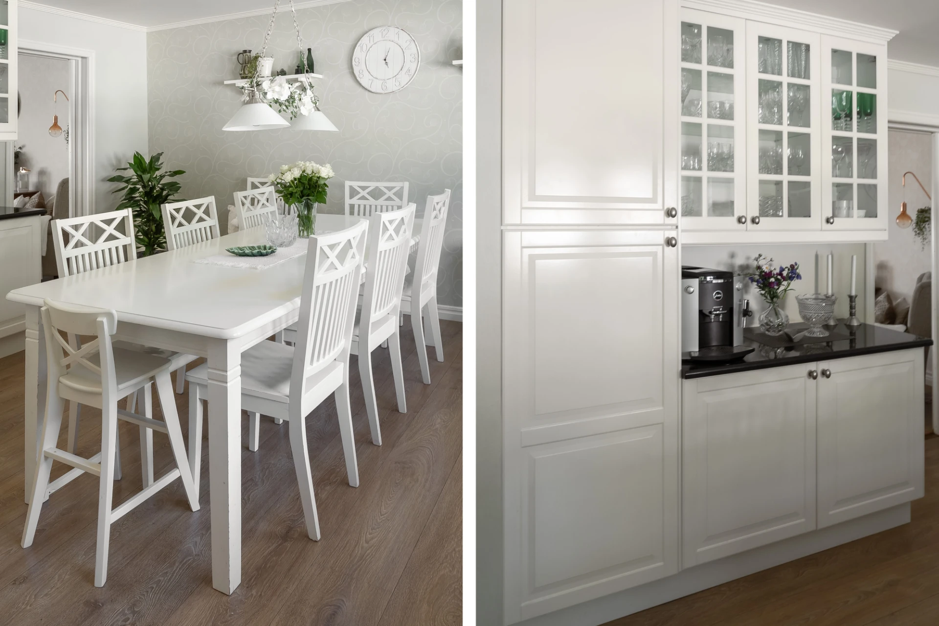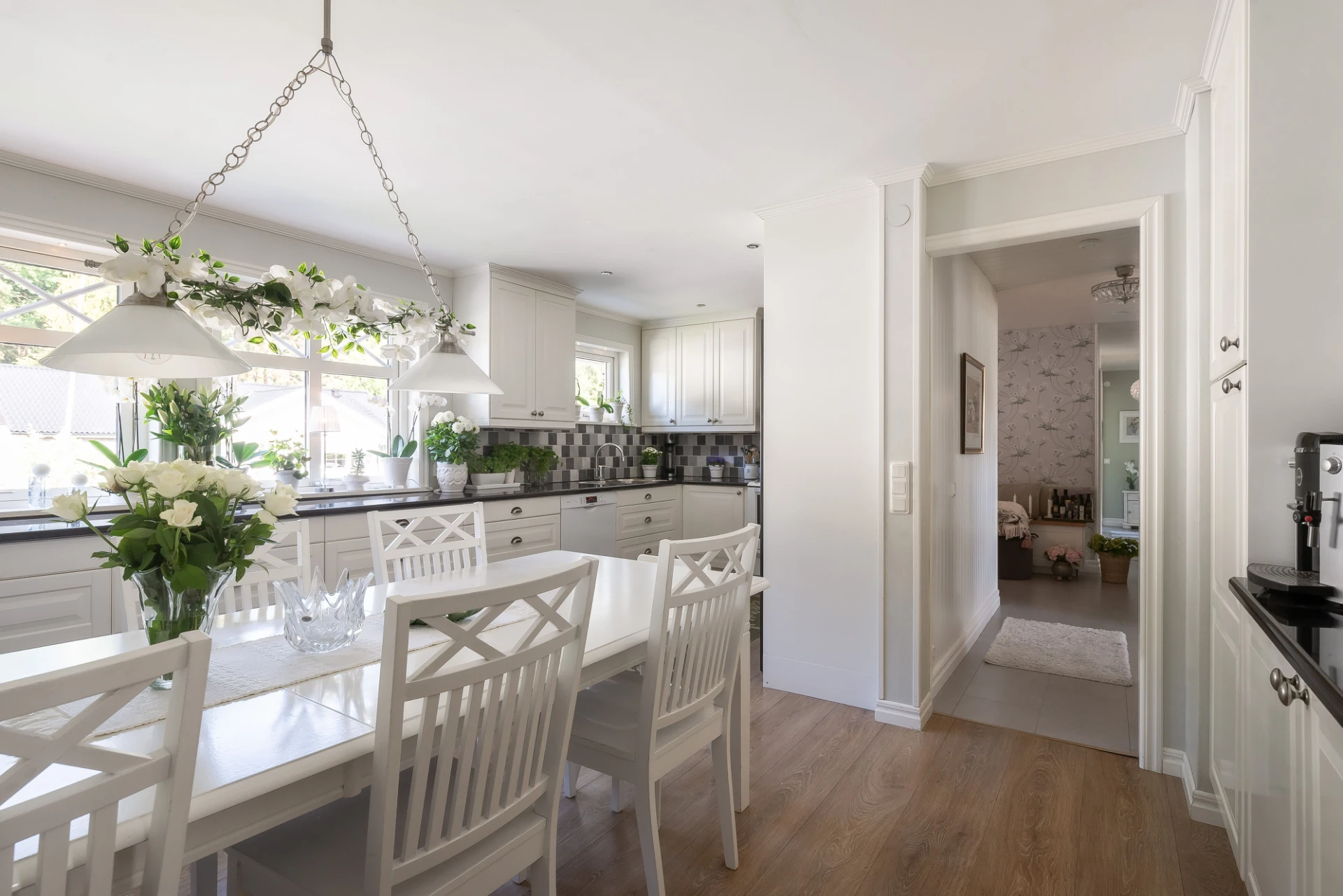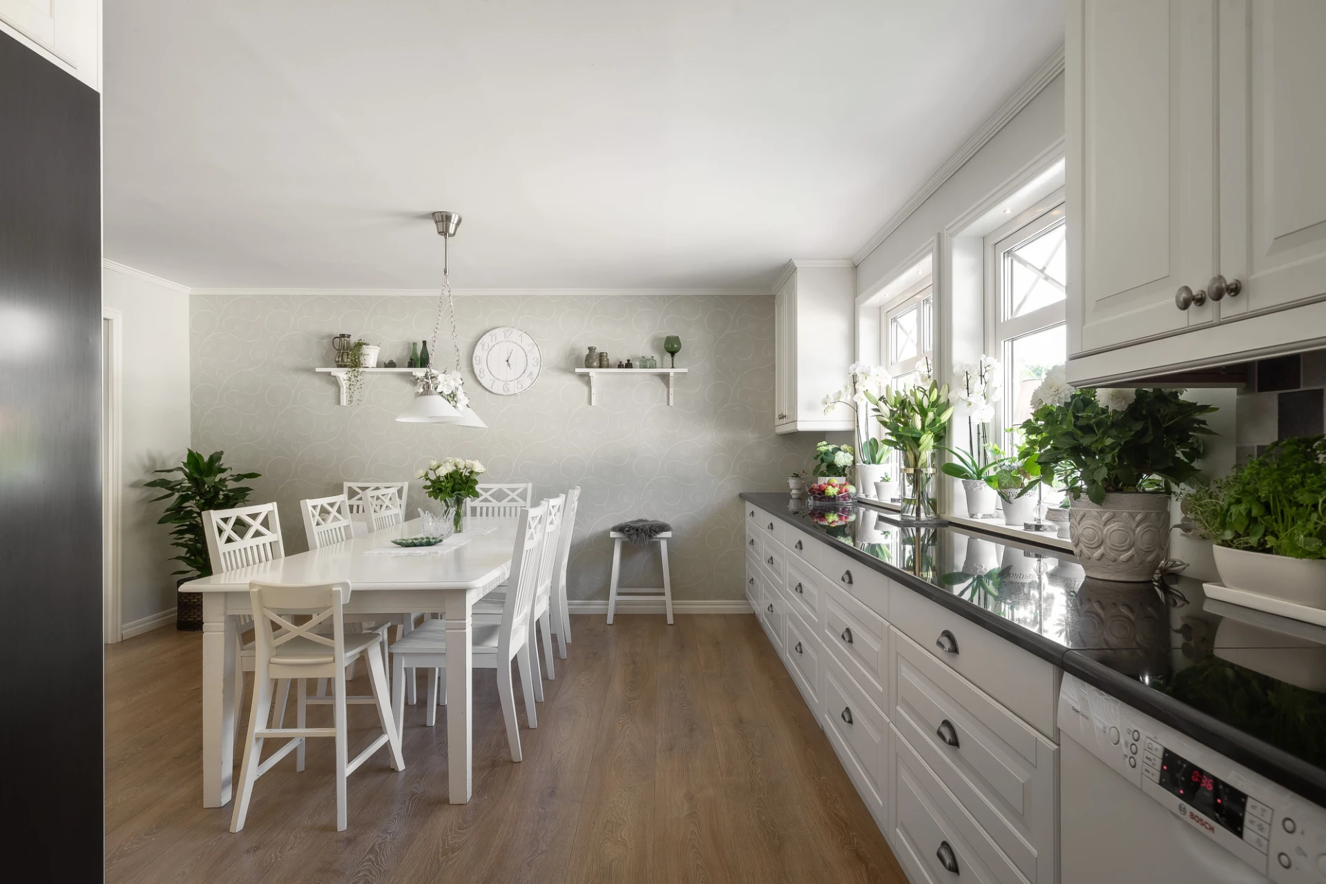Köket har en stilren bänkskiva i svart granit som ger en elegant kontrast mot de tapetserade väggarna. Här finns generöst tilltagen arbetsyta för matlagningsentusiasten. Laminatgolvet är både praktiskt, slitstarkt och lättskött. Här finns gott om plats för ett matbord som rymmer åtta personer, perfekt för både vardag och fest. Köket är utrustat med kyl, frys, diskmaskin, 70cm bred induktionshäll och fläkt från Franke. Vattenburen golvvärme, infällda spotlights i taket och fönstersmygar. Köket byggdes om 2010.