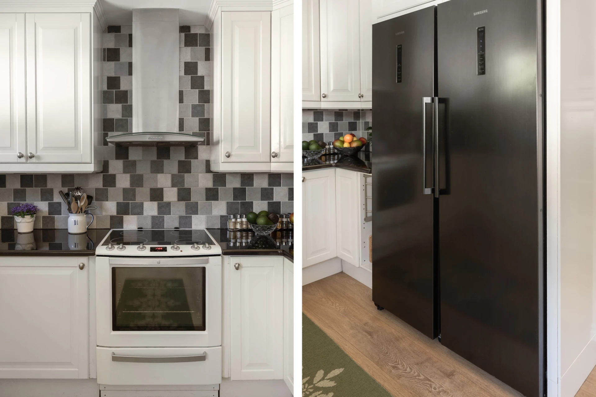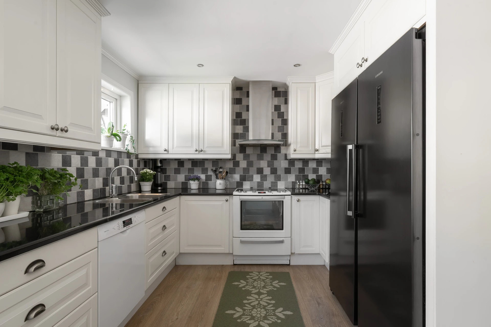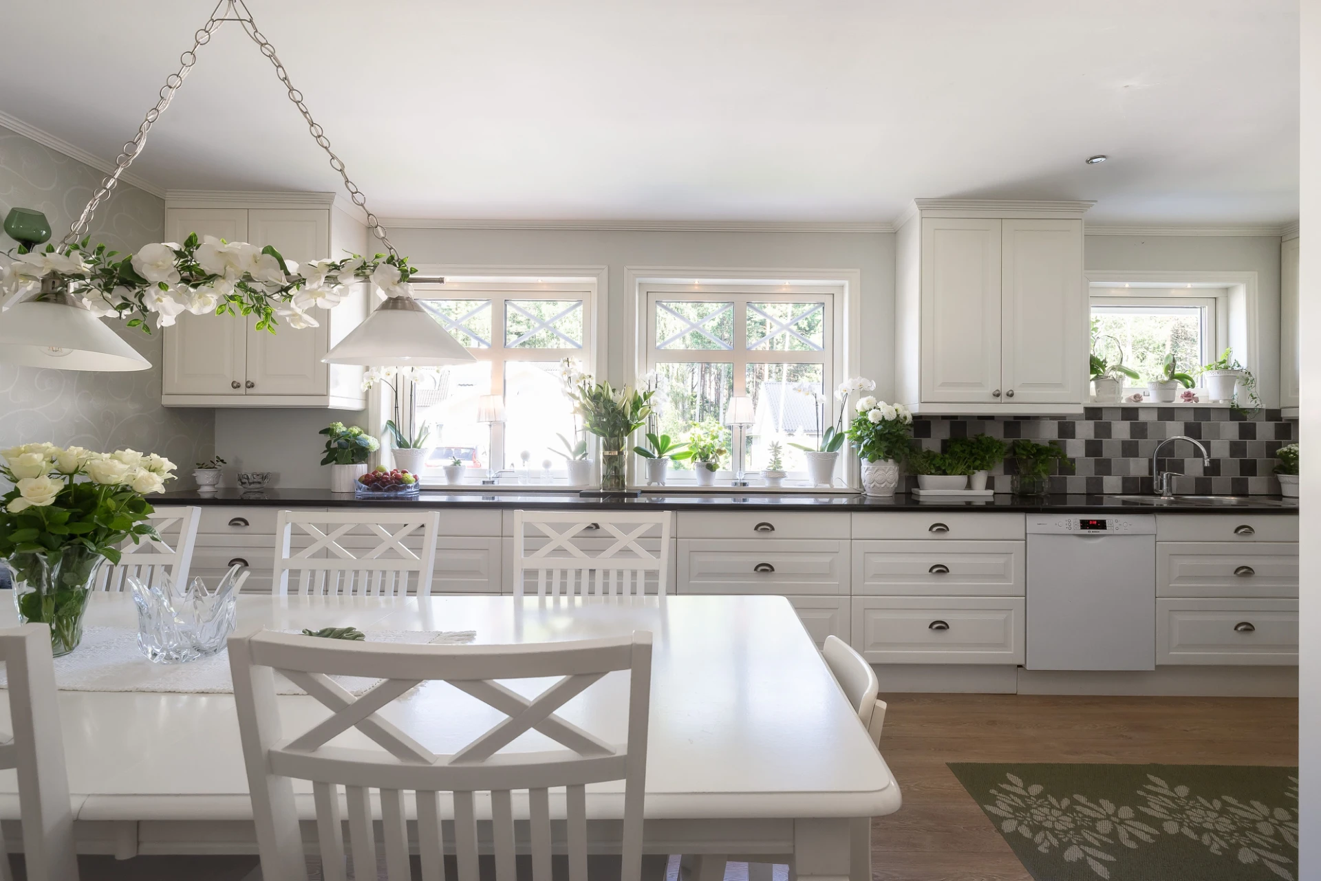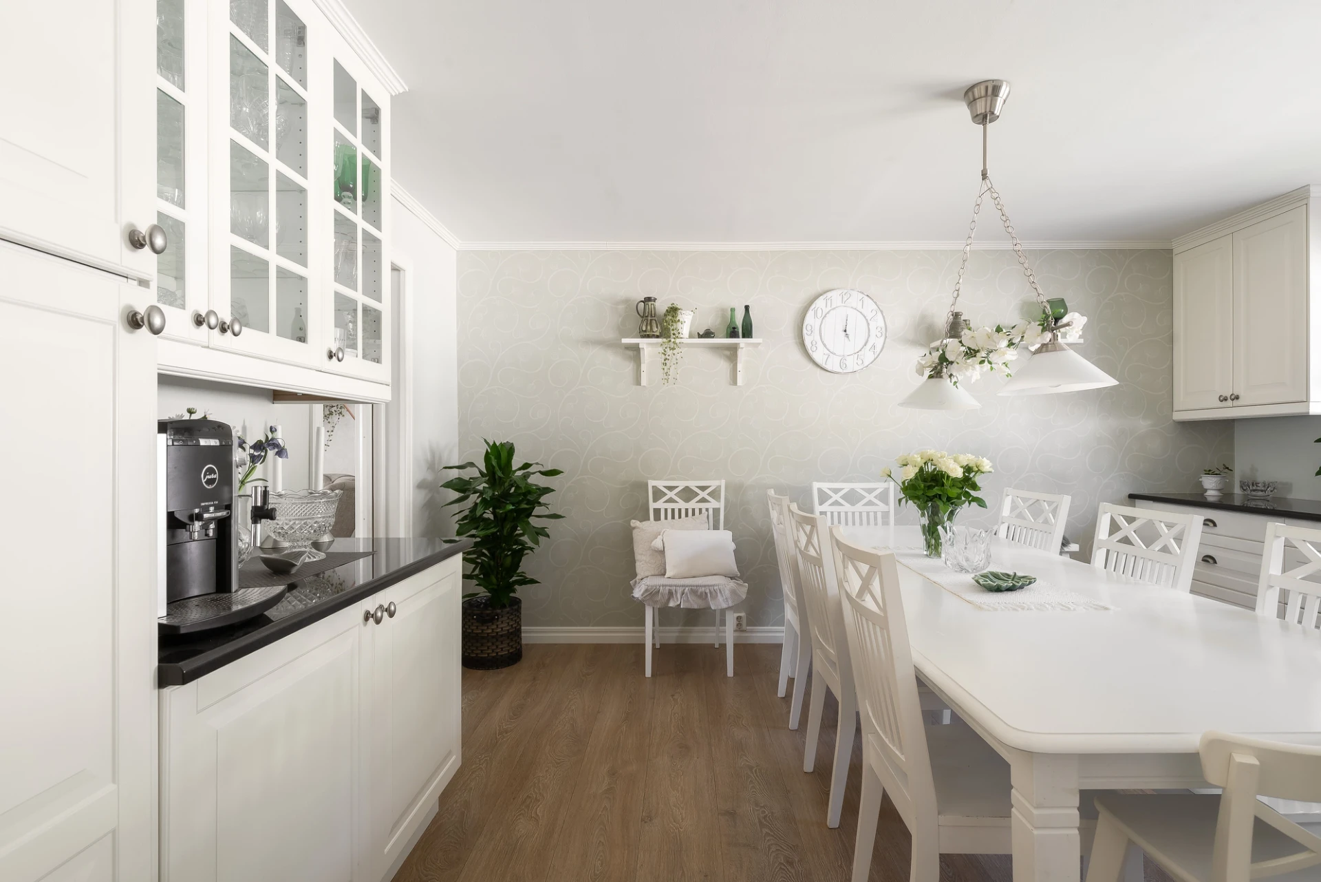 Köket har en stilren bänkskiva i svart granit som ger en elegant kontrast mot de tapetserade väggarna. Här finns generöst tilltagen arbetsyta för matlagningsentusiasten. Laminatgolvet är både praktiskt, slitstarkt och lättskött. Här finns gott om plats för ett matbord som rymmer åtta personer, perfekt för både vardag och fest. Köket är utrustat med kyl, frys, diskmaskin, 70cm bred induktionshäll och fläkt från Franke. Vattenburen golvvärme, infällda spotlights i taket och fönstersmygar. Köket byggdes om 2010.