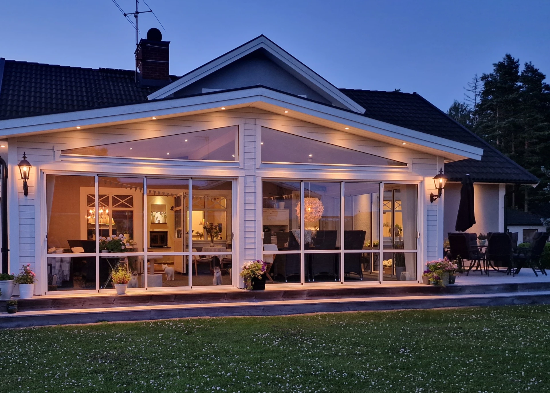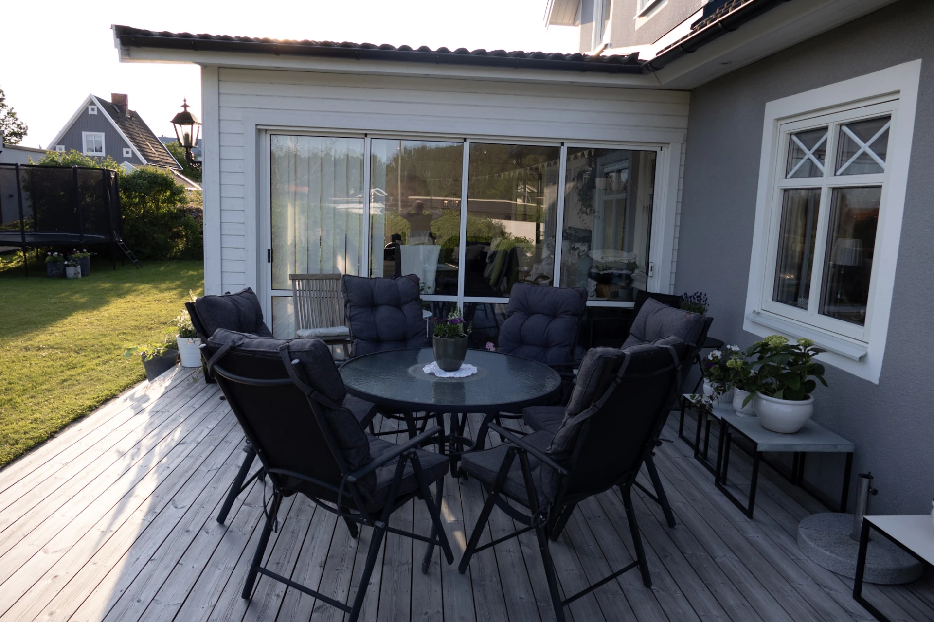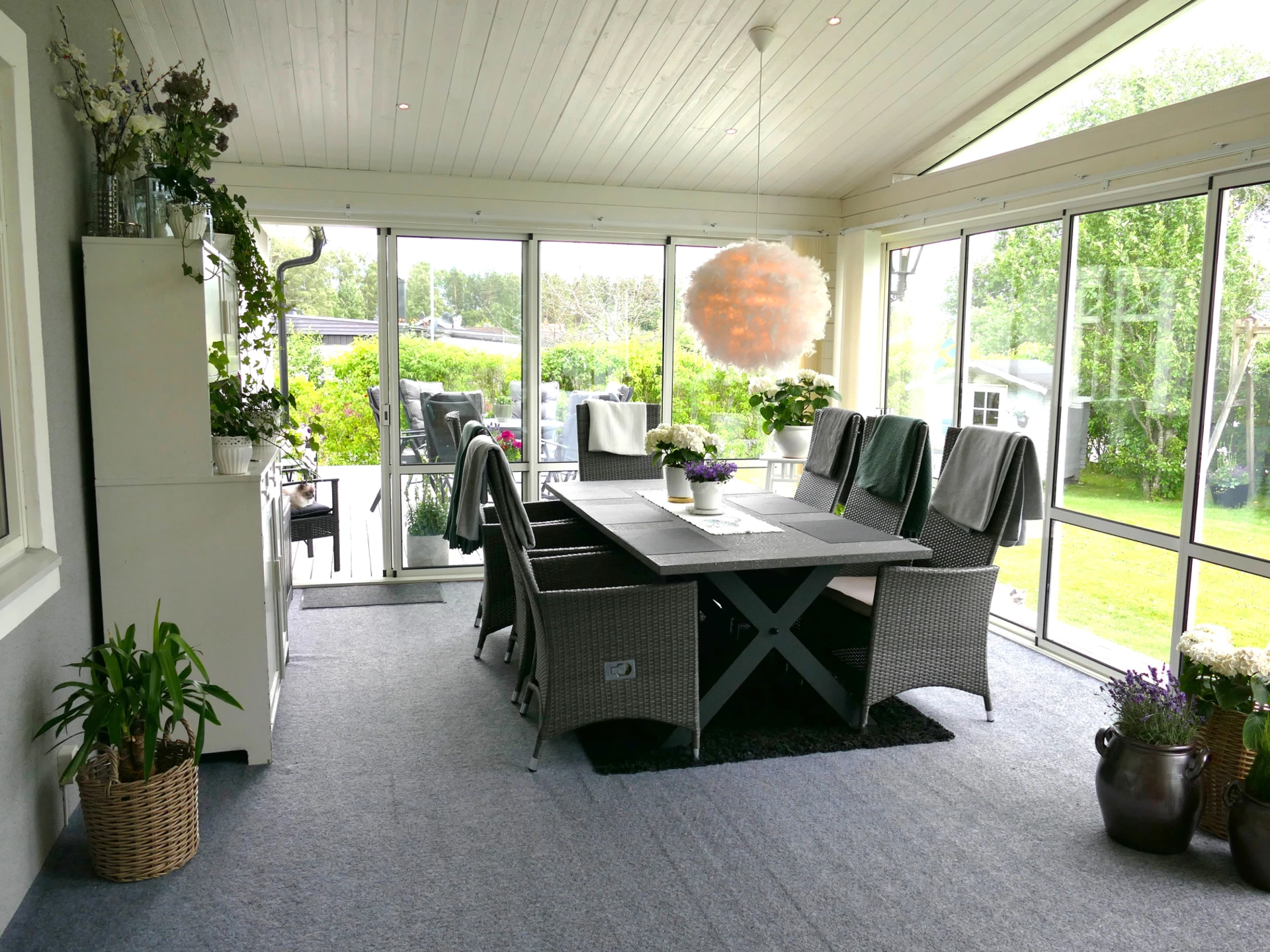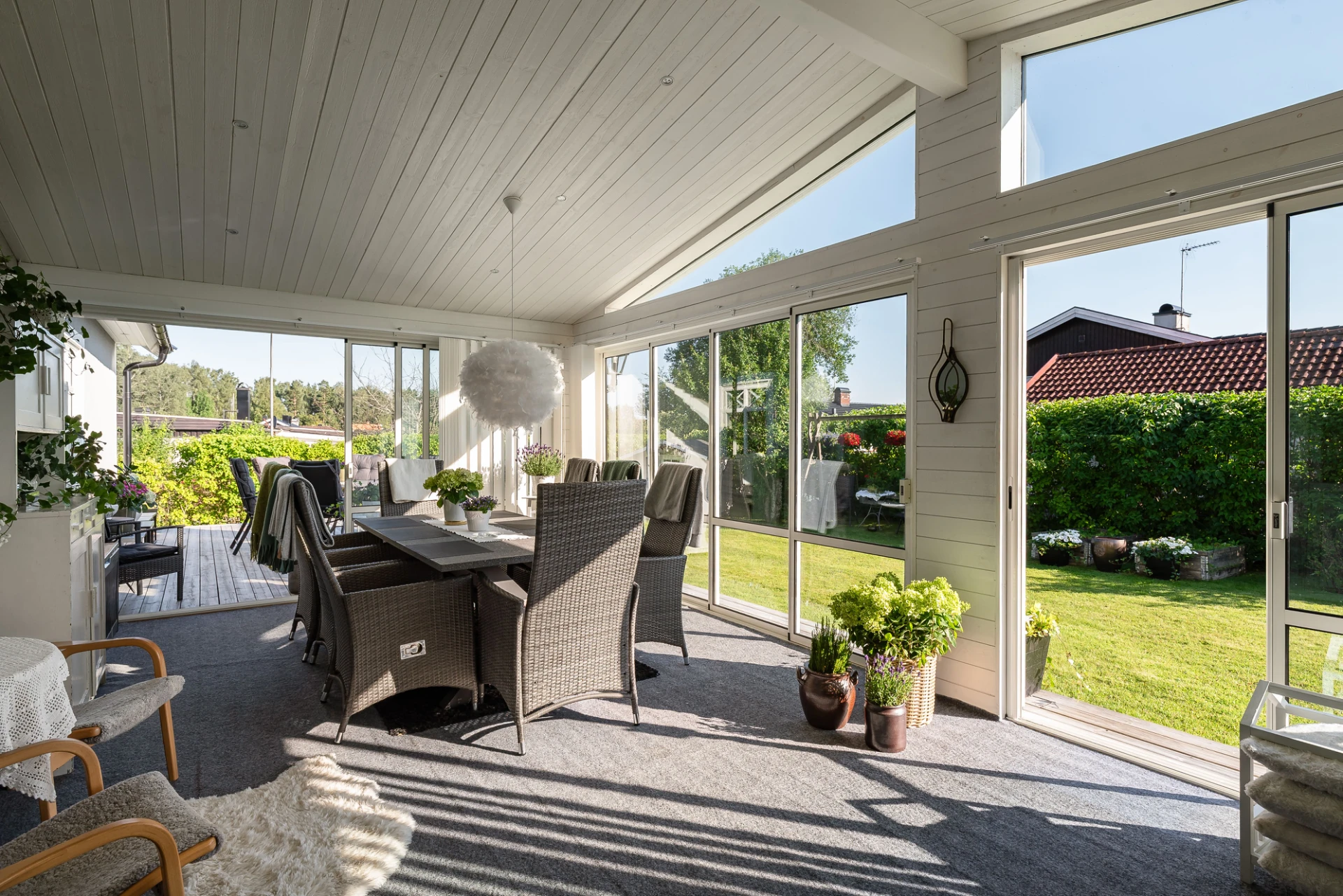 Rymligt uterum med dimbara spotlights, isolerat tak och golv. Tak till nock och skjutbara glaspartier skapar en härlig rymd och vackert ljusinsläpp. Textilmatta ger trevlig komfort året runt. Härlig terrass i anslutning med söderläge. Fasadbelysning på uterummet ger en vacker siluett kvällstid. Byggd 2012.